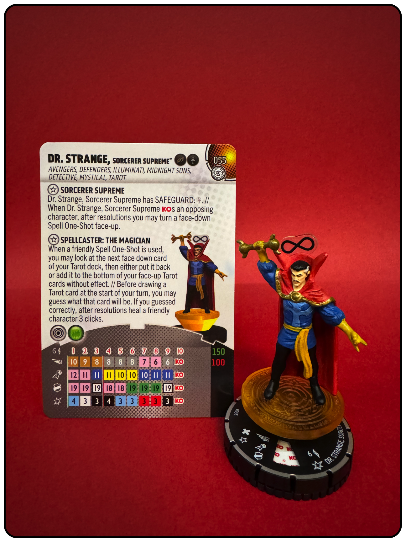 Name: Dr. Strange, Sorcerer Supreme Number: 055 Rarity: Rare Set Name: Strange Tales Type: Figure & Character Card Year: 2025 Catalog Number: 07:02:00:0001:K10 Main Category: Games Sub Category: HeroClix Secondary Category: None Details: This is probably the rarest Dr. Strange figure from the 2025 Strange Tales set. It features Dr. Strange holding the Wand of Watoomb above his right should and an infinity symbol above his head. He is standing on a clear yellow mandala symbol on a raised platform. Refer to pictures of the Character Card for stats.