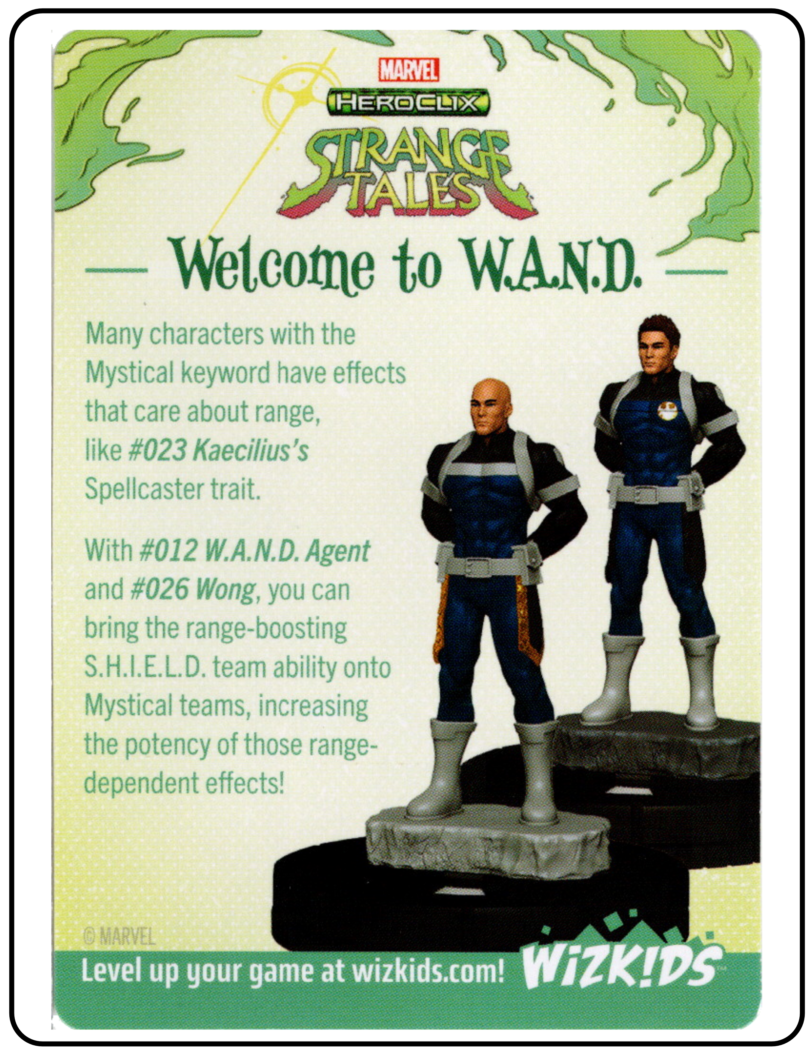 Name: W.A.N.D / Possessors Number: None Rarity: N/A Set Name: Strange Tales Type: Power & Ability Card Year: 2025 Catalog Number: 07:02:00:0017:K10 Main Category: Games Sub Category: HeroClix Secondary Category: None Details: This Power & Abilities Card has W.A.N.D on one side and Possessors on the other. The W.A.N.D side talks about how the W.A.N.D Agent 012 and Wong 026 can bring the range-boosting S.H.I.E.L.D. team ability to mystical teams increasing the potency of those range dependent effects. The Possessors side talks about using the new possessor bases to attached to figures who KO one of your figures. The bases inflicts penalties to those characters.