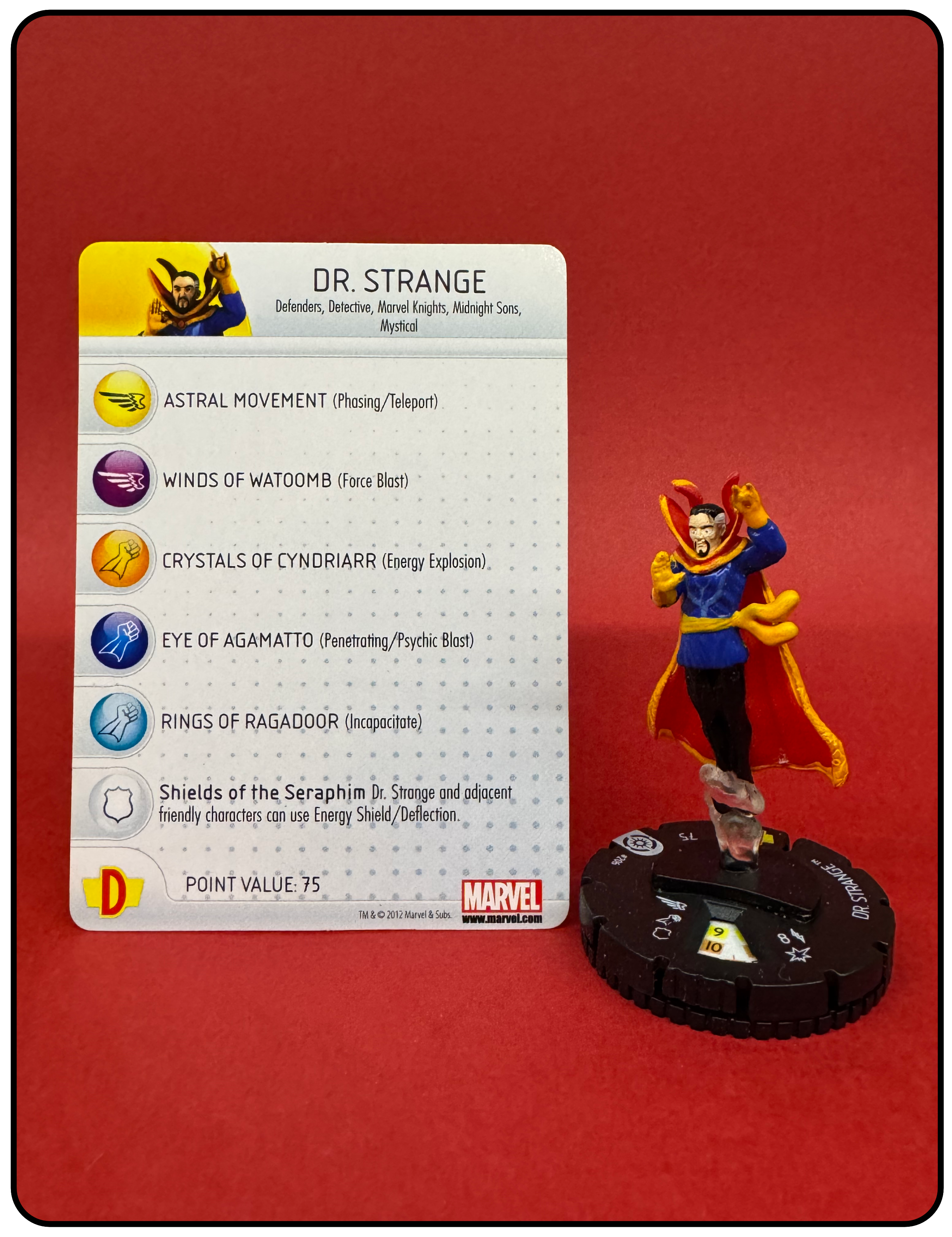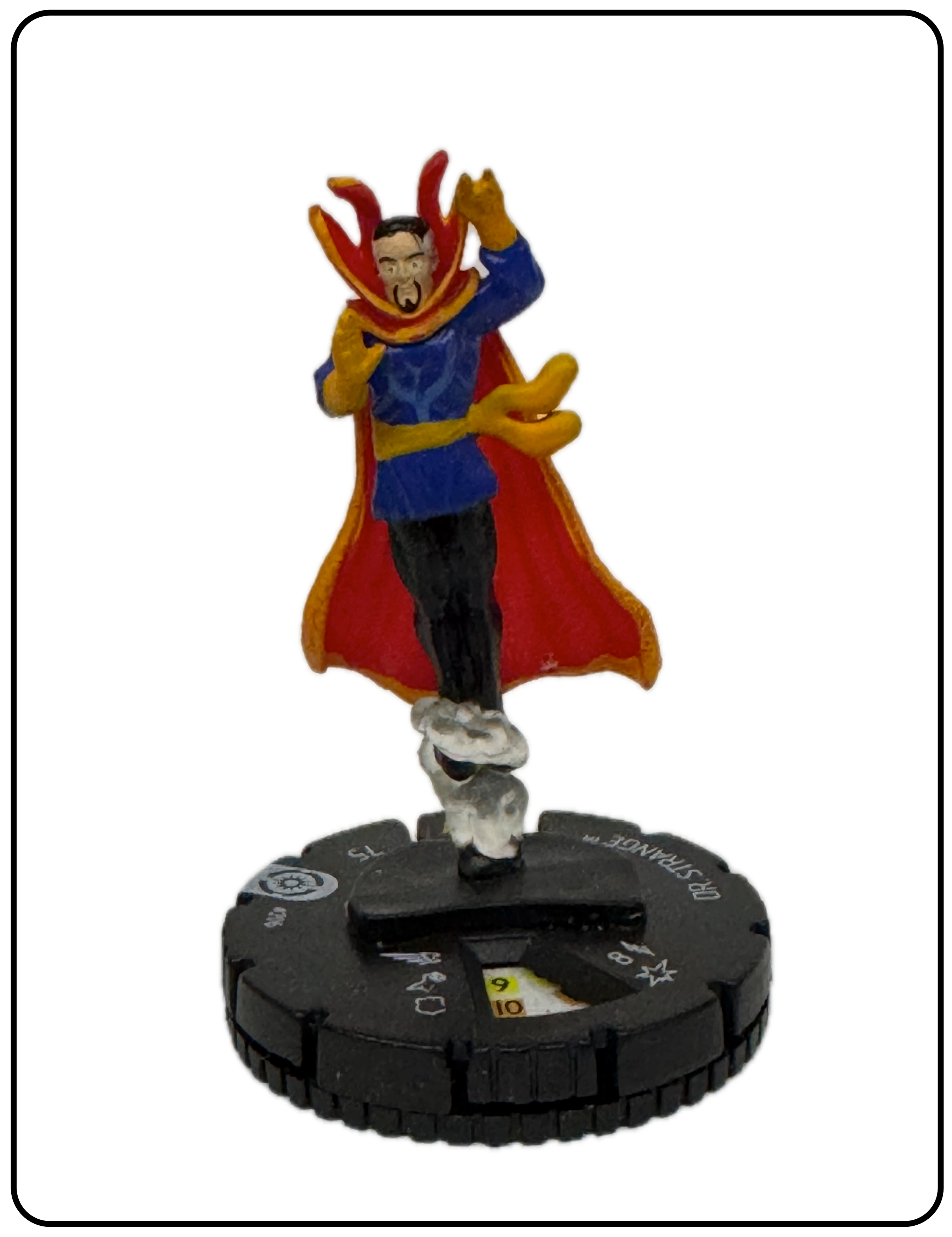 Name: Dr. Strange Number: 206 Rarity: Common Set Name: Galactic Guardians Type: Figure & Character Card Year: 2012 Catalog Number: 07:02:00:0036:K10 Main Category: Games Sub Category: HeroClix Secondary Category: None Details: This figure is the same sculpt as figure 028 and 014 from the same set. Figure 014 is the astral form of this figure and 028 is the same paint depicting Dr. Strange in his classic comic costume rising above the ground on a clear plastic column of smoke. The other two figures are also in the collection.