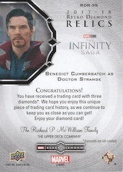 Number: RDR-55 Name: Benedict Cumberbatch as Doctor Strange 2nd Name: Retro Diamond Relics Type: Trading Card Series: Black Diamond Date: 2021 Artist: Live Action Manufacturer: Upper Deck Other Characters: No Description: This is Upper Deck's first treatment of Marvel cards with the Black Diamond brand. It is based on live action images with many chases and parallels. This card is from the Retro Diamond Relics chase set. It is numbered 12 of 17 and features Doctor Strange from the Avengers Infinity War Movie.