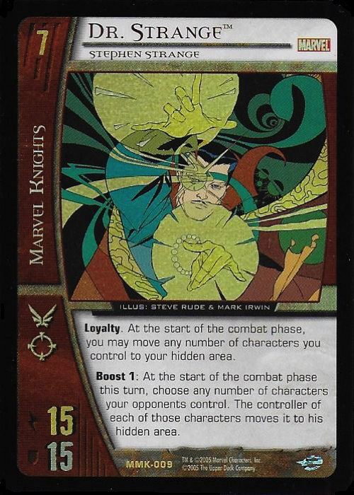Number: MTU-009 Name: Dr. Strange 2nd Name: Stephen Strange Type: CCG Series: VS System Date: 2005 Artist: Steve Rude, Mark Irwin Manufacturer: The Upper Deck Company Other Characters: None Description: This is a Marvel Knights foil card for the VS card game system featuring Dr. Strange