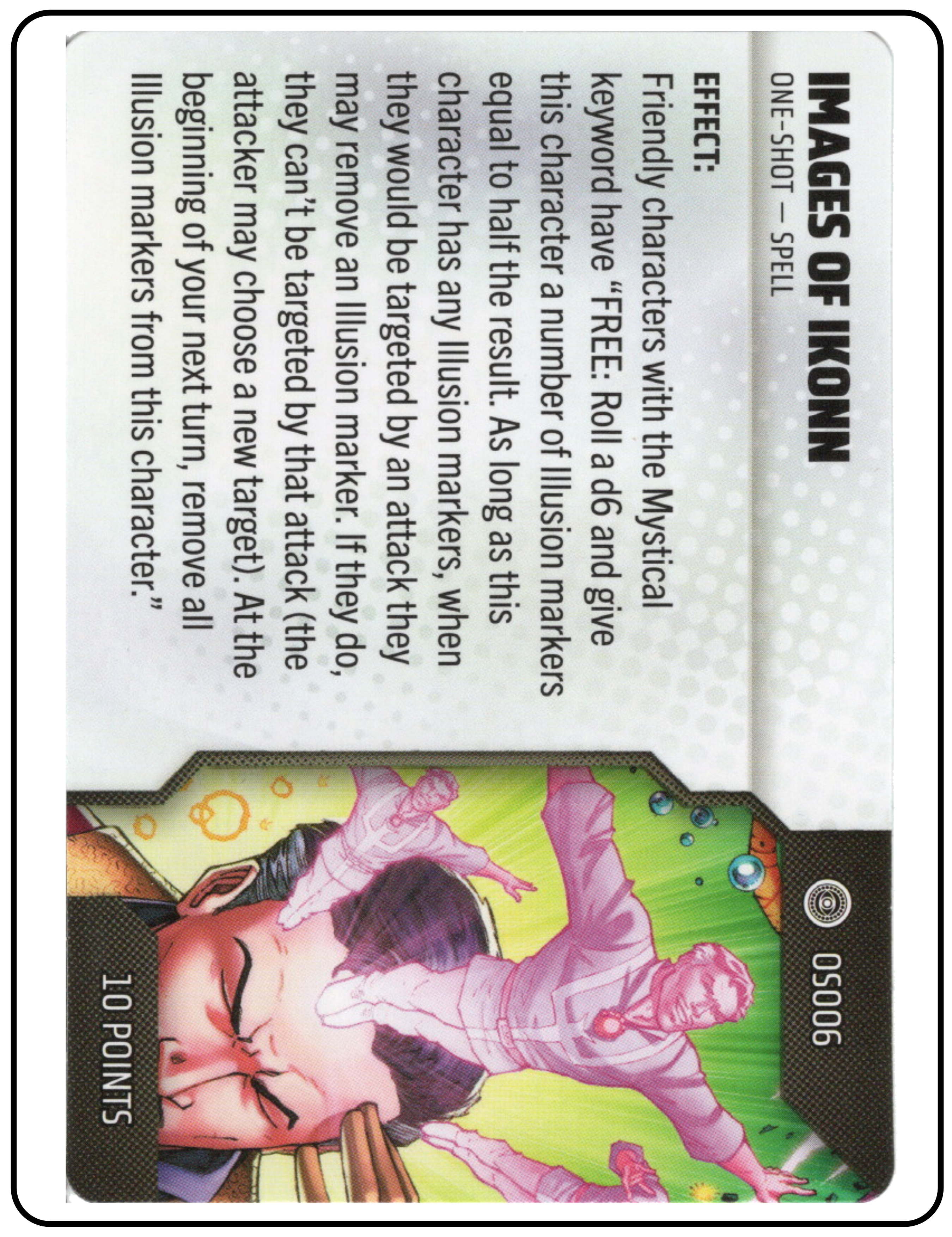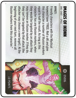Name: Images of Ikonn Number: None Rarity: Unique Set Name: Strange Tales Type: Power & Abilities Card Year: 2025 Catalog Number: 07:02:00:0012:K10 Main Category: Games Sub Category: HeroClix Secondary Category: None Details: This spell card outlines the effects and use of Images of Ikonn, which is a unique one-shot spell. During force construction, you can add one or more on-shots to your sideline.