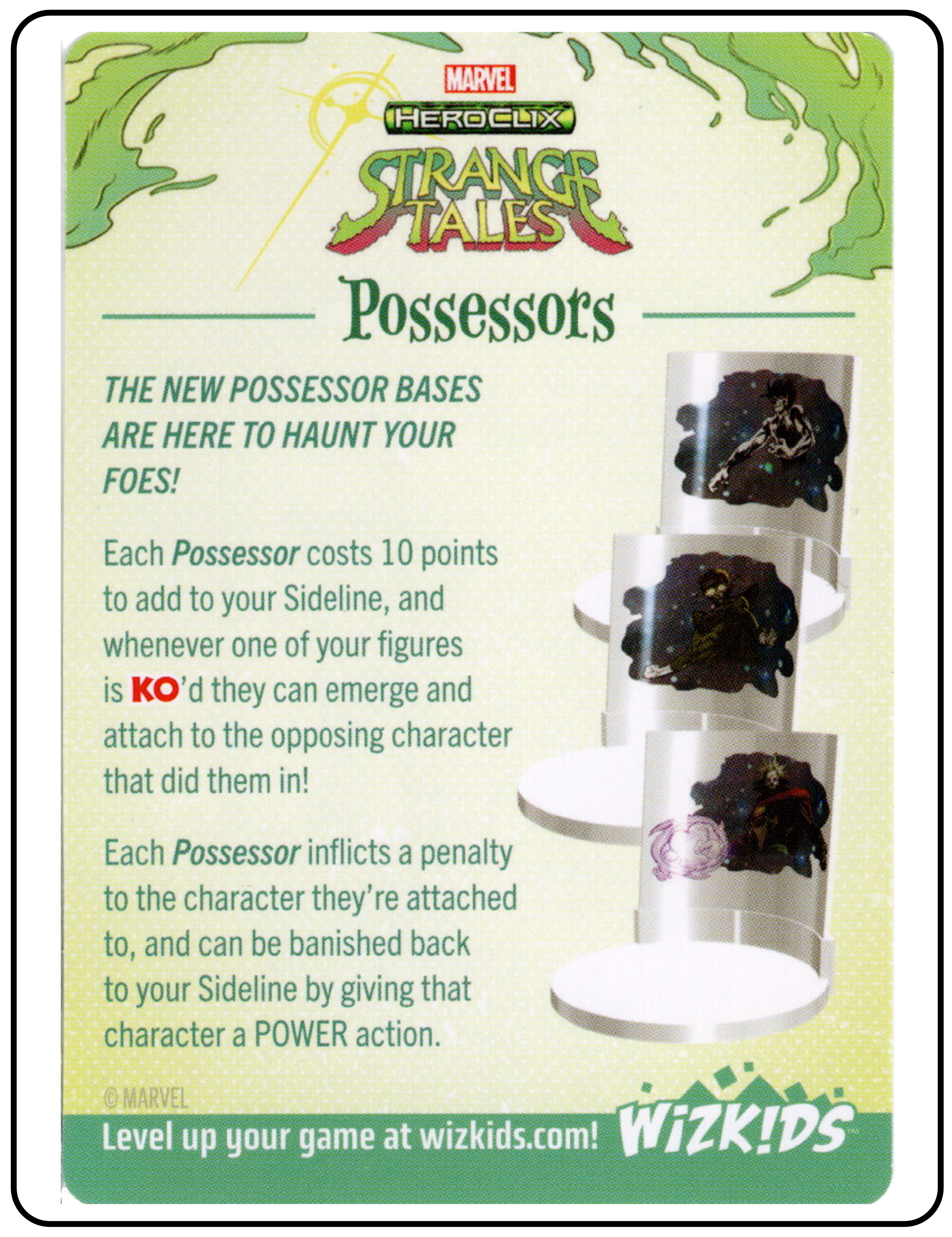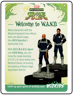 Name: W.A.N.D / Possessors Number: None Rarity: N/A Set Name: Strange Tales Type: Power & Ability Card Year: 2025 Catalog Number: 07:02:00:0017:K10 Main Category: Games Sub Category: HeroClix Secondary Category: None Details: This Power & Abilities Card has W.A.N.D on one side and Possessors on the other. The W.A.N.D side talks about how the W.A.N.D Agent 012 and Wong 026 can bring the range-boosting S.H.I.E.L.D. team ability to mystical teams increasing the potency of those range dependent effects. The Possessors side talks about using the new possessor bases to attached to figures who KO one of your figures. The bases inflicts penalties to those characters.