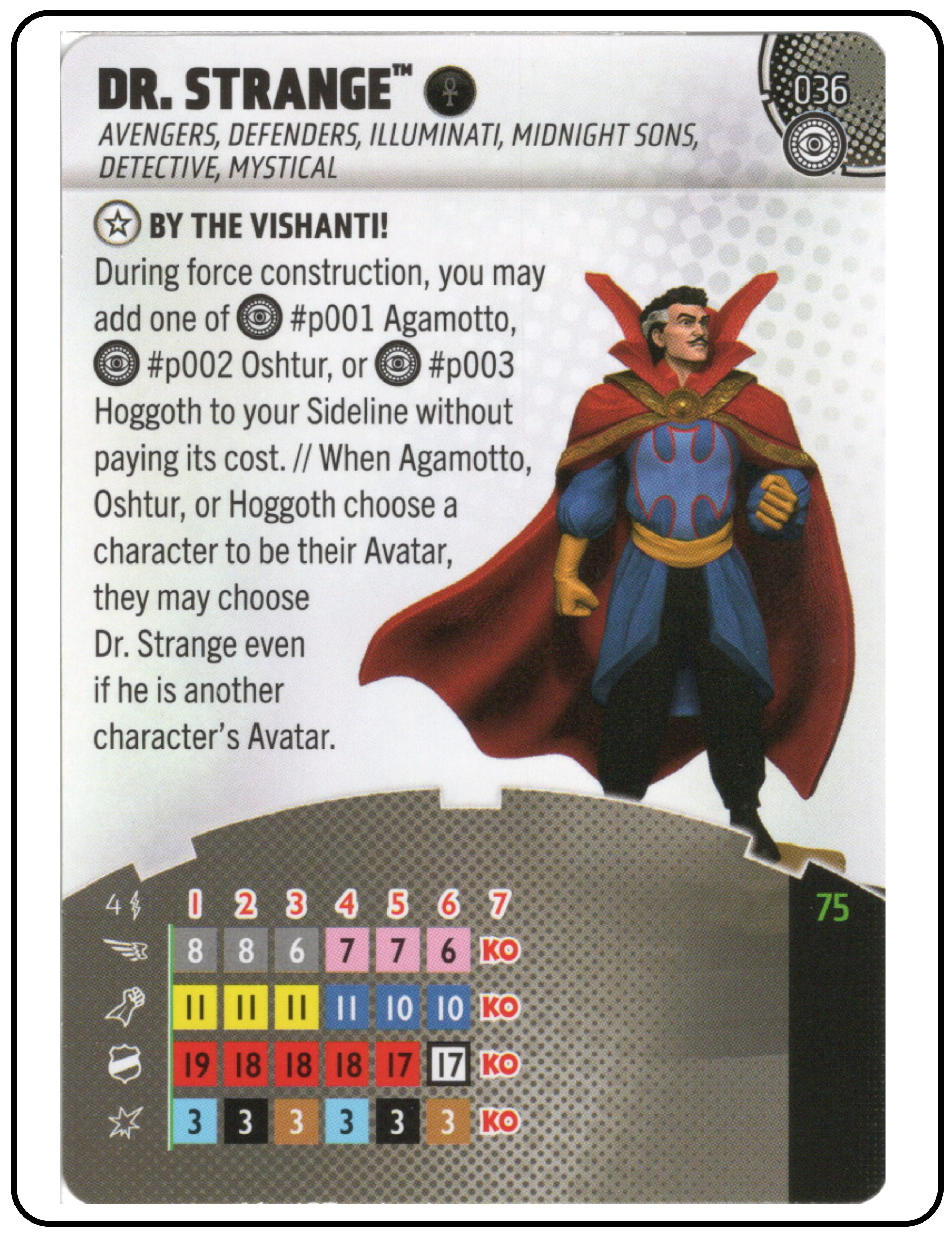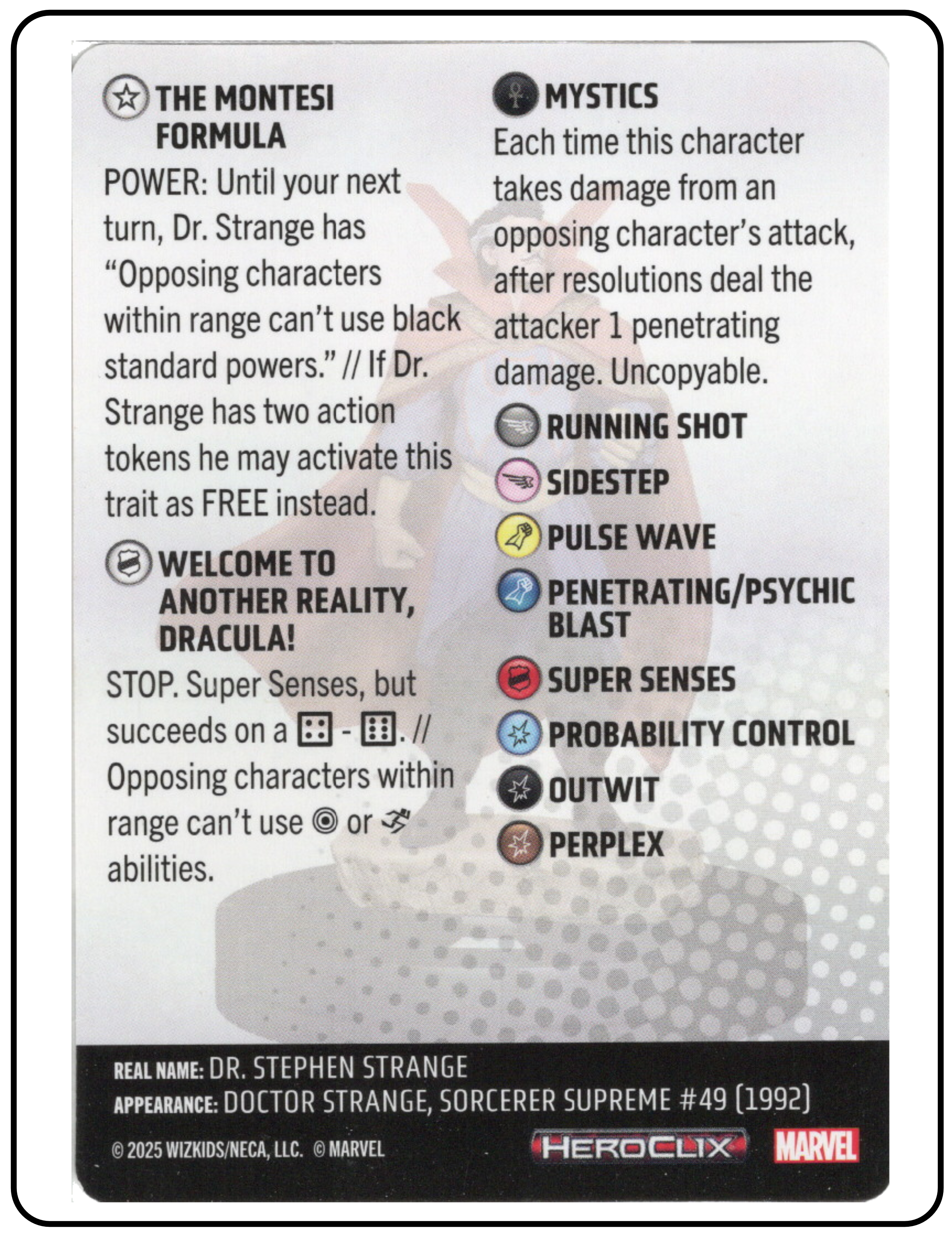 Name: Dr. Strange Number: 036 Rarity: Rare Set Name: Strange Tales Type: Figure & Character Card Year: 2025 Catalog Number: 07:02:00:0002:K10 Main Category: Games Sub Category: HeroClix Secondary Category: None Details: This is a great figure from the 2025 Strange Tales set. Dr. Strange is standing with his fists clenched looking up and to the left on a gold base. It is a great pose. Refer to pictures of the Character Card for stats.
