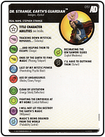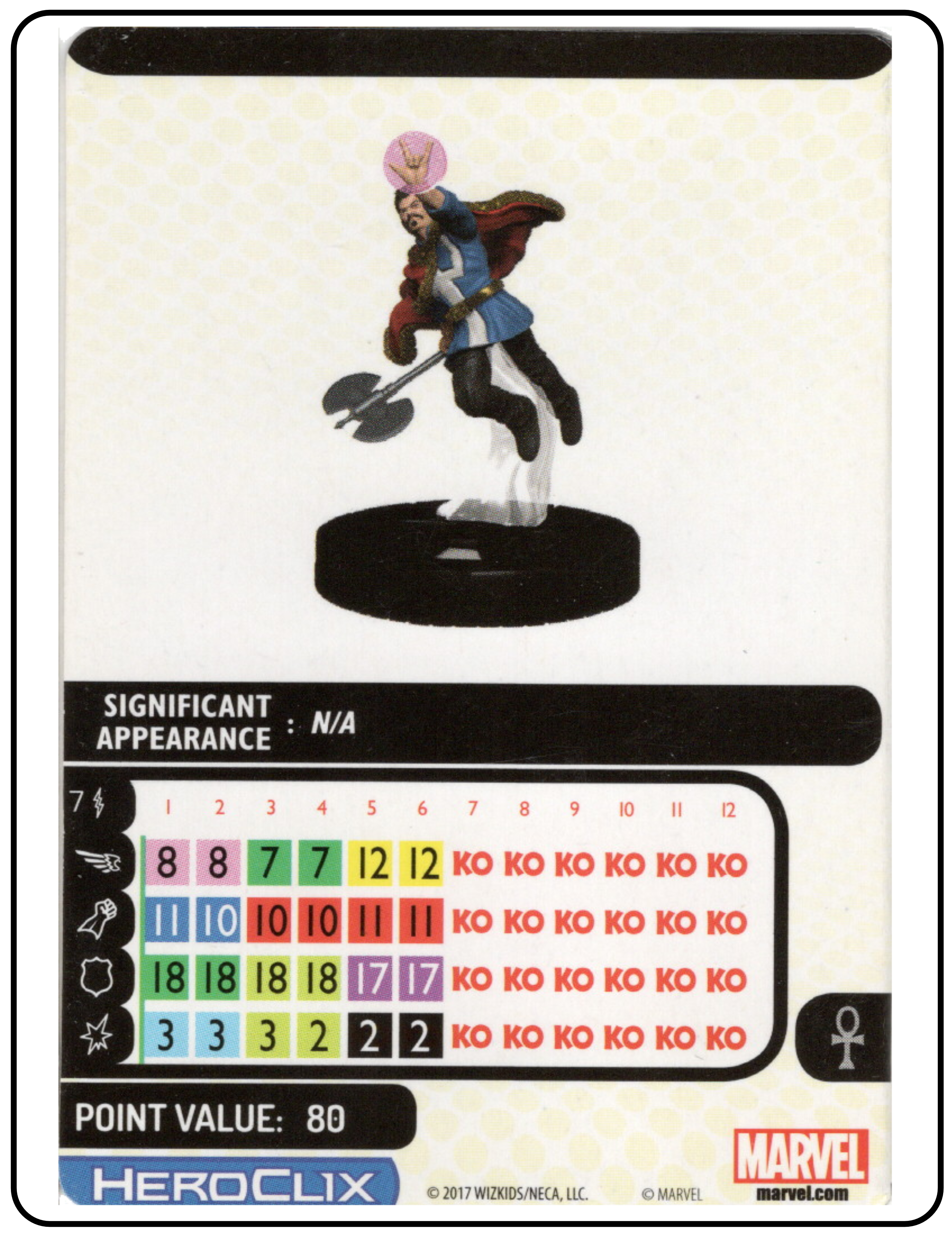 Name: Dr. Strange, Earth's Guardian Number: 051 Rarity: Super Rare Set Name: Avengers/Defenders War Type: Figure & Character Card Year: 2017 Catalog Number: 07:02:00:0022:K10 Main Category: Games Sub Category: HeroClix Secondary Category: None Details: This is a very dynamic figure featuring Dr. Strange jumping into the air holding an ax in his right hand and casting a spell with his left. He is attached to the clix base with a clear plastic column. This figure comes with a fold out character card with four pages.