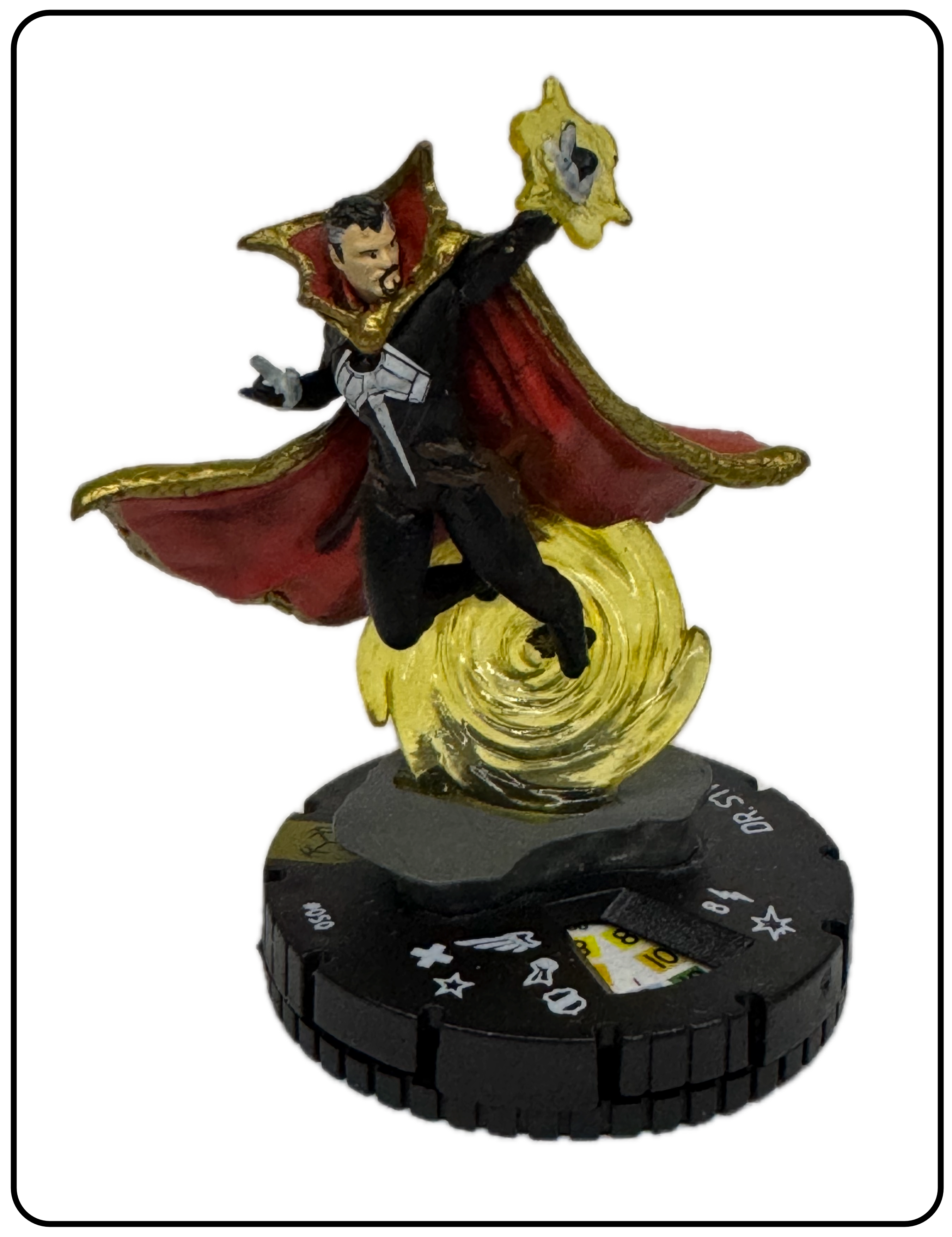 Name: Dr. Strange Number: 050 Rarity: Super Rare Set Name: Avengers: War of the Realms Type: Figure & Character Card Year: 2021 Catalog Number: 07:02:00:0023:K10 Main Category: Games Sub Category: HeroClix Secondary Category: None Details: This figure has great action depicting Dr. Strange suspended in the air by a clear yellow plastic portal/spell on a raised grey base. He is dressed in his black comic costume with white chest emblem. His left hand is casting a spell.