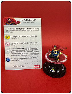 Name: Dr. Strange Number: 112 Rarity: Limited Edition Set Name: Civil War: Storyline Organized Type: Figure & Character Card Year: 2016 Catalog Number: 07:02:00:0025:K10 Main Category: Games Sub Category: HeroClix Secondary Category: None Details: This figure has recreates a great panel from a comic with Dr. Strange seated in the lotus position in a magic circle surrounded by candles. The magic circle is suspended from the base with a clear plastic peg.