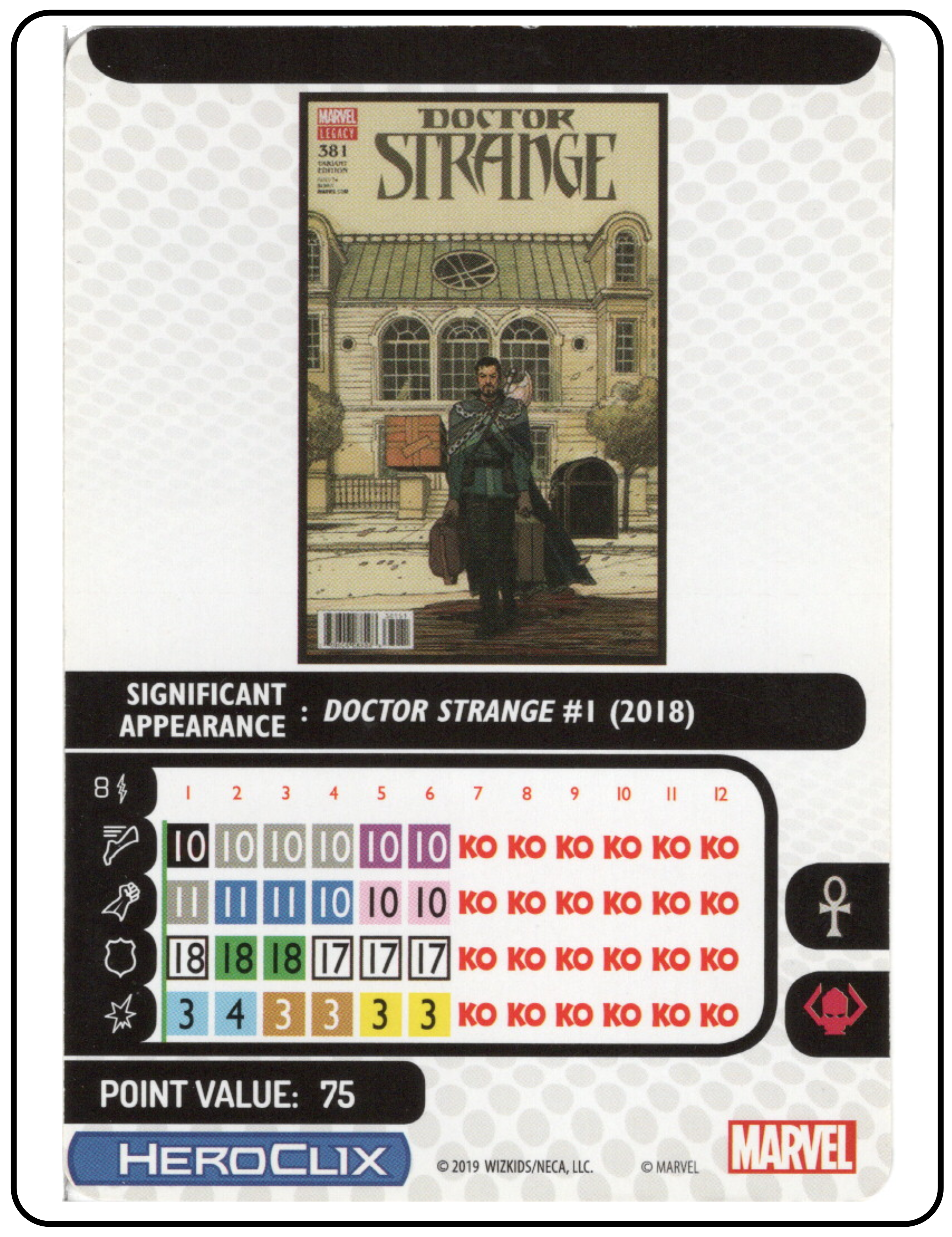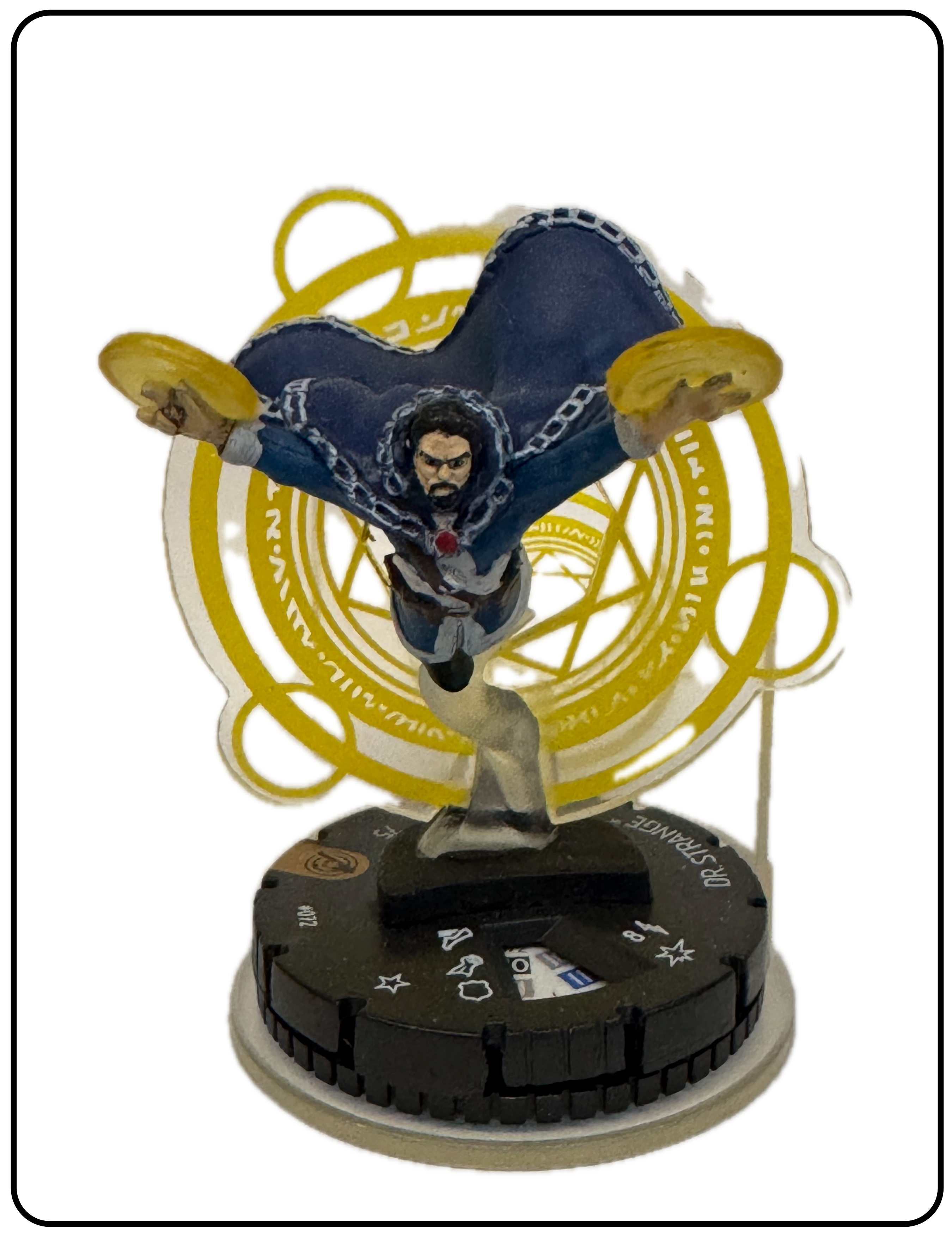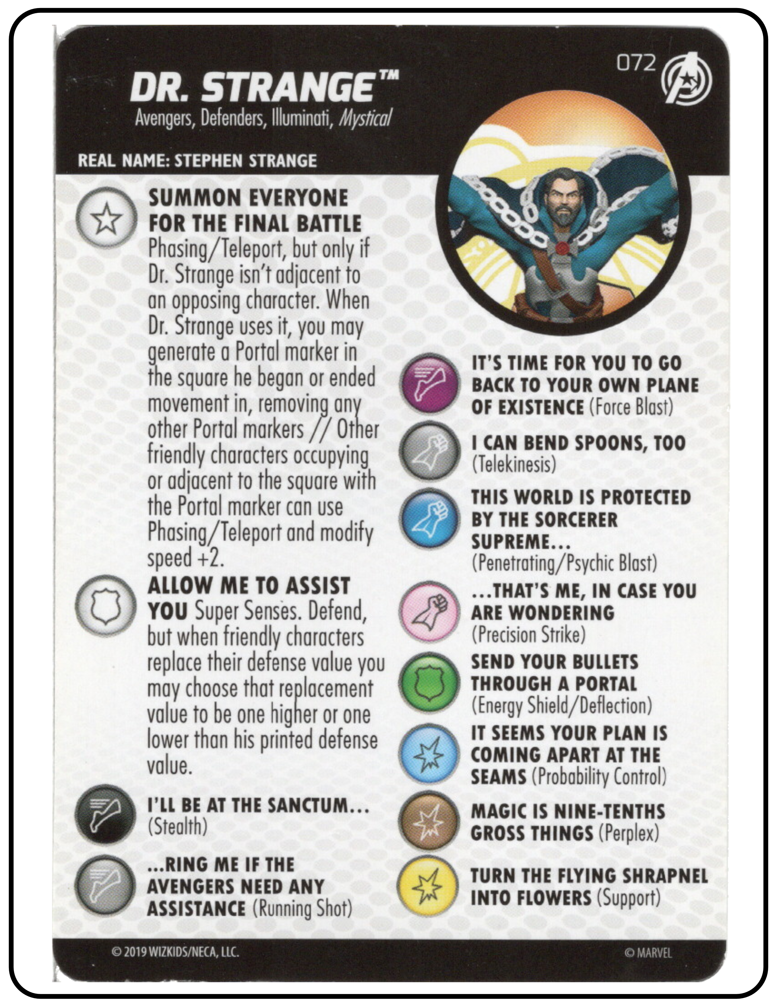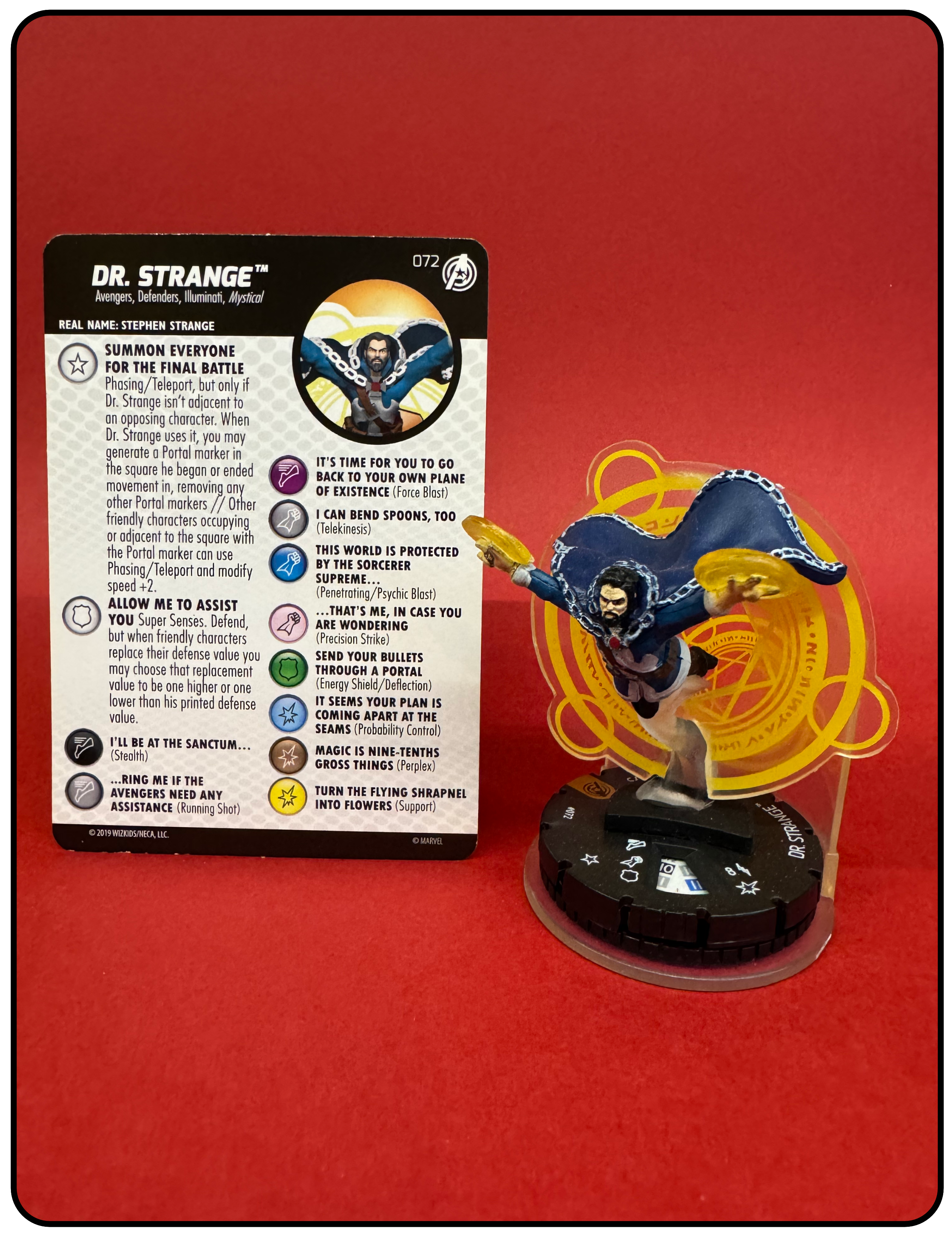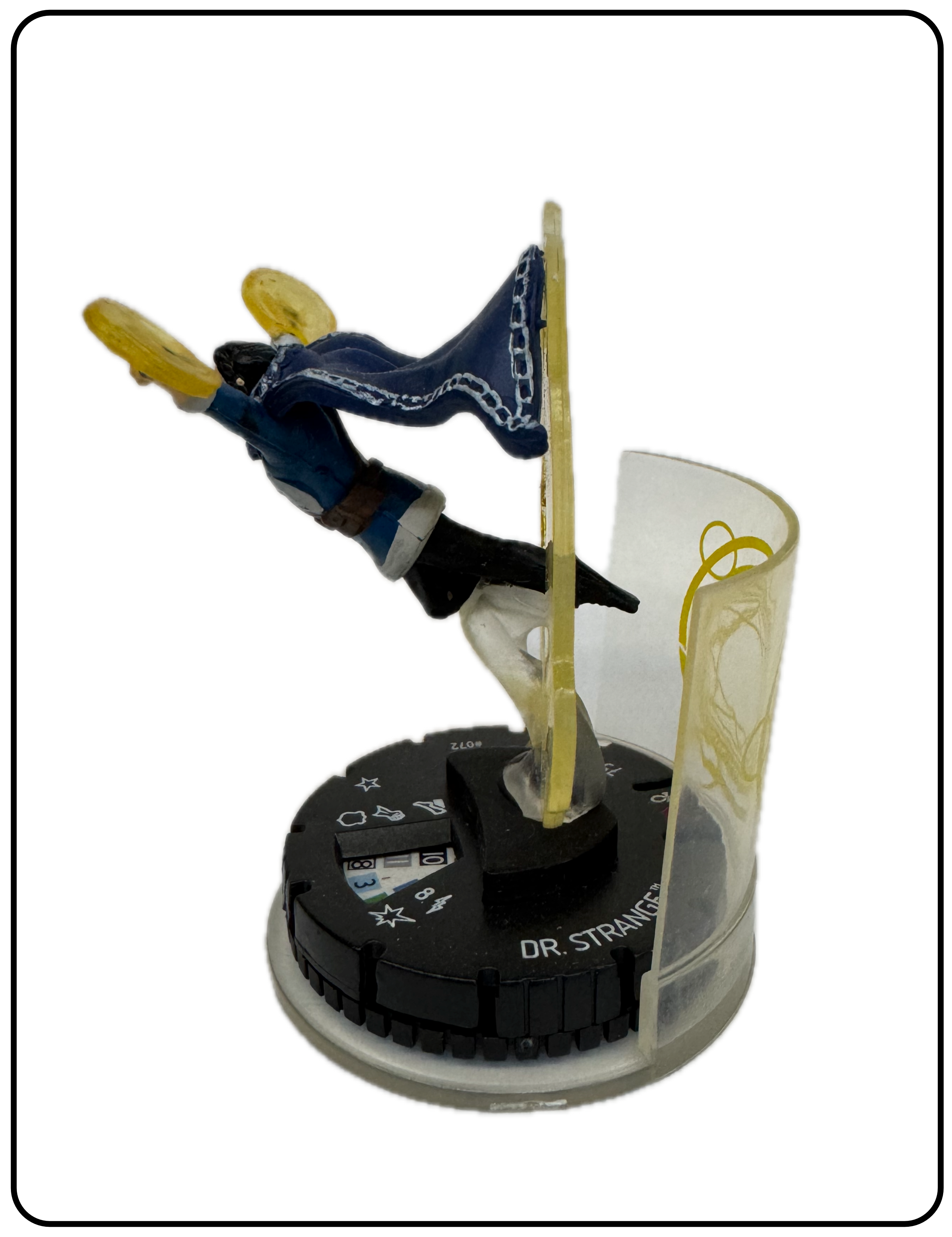 Name: Dr. Strange Number: 072 Rarity: Chase Set Name: Captain America and the Avengers Type: Figure & Character Card Year: 2019 Catalog Number: 07:02:00:0027:K10 Main Category: Games Sub Category: HeroClix Secondary Category: None Details: This is a great figure that comes with an FX base. Dr. Strange is flying out of a portal with spell in each hand. The FX base gives the portal more depth. It is one of the more creative Dr. Strange HeroClix ever.