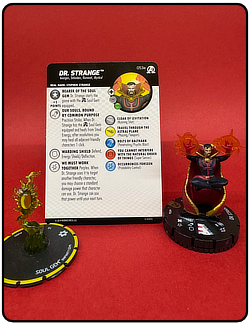 Name: Dr. Strange Number: 053a Rarity: Super Rare Set Name: Avengers Black Panther and the Illuminati Type: Figure & Character Card Year: 2019 Catalog Number: 07:02:00:0032:K10 Main Category: Games Sub Category: HeroClix Secondary Category: None Details: This is one of the best Dr. Strange HeroClix figures. It depicts Dr. Strange floating in a seated position casting spells with both hands. The spells are in transparent red/orange plastic. The figure comes with a second base with the Soul Gem on it in transparent green plastic. The sculpt and paint are great.