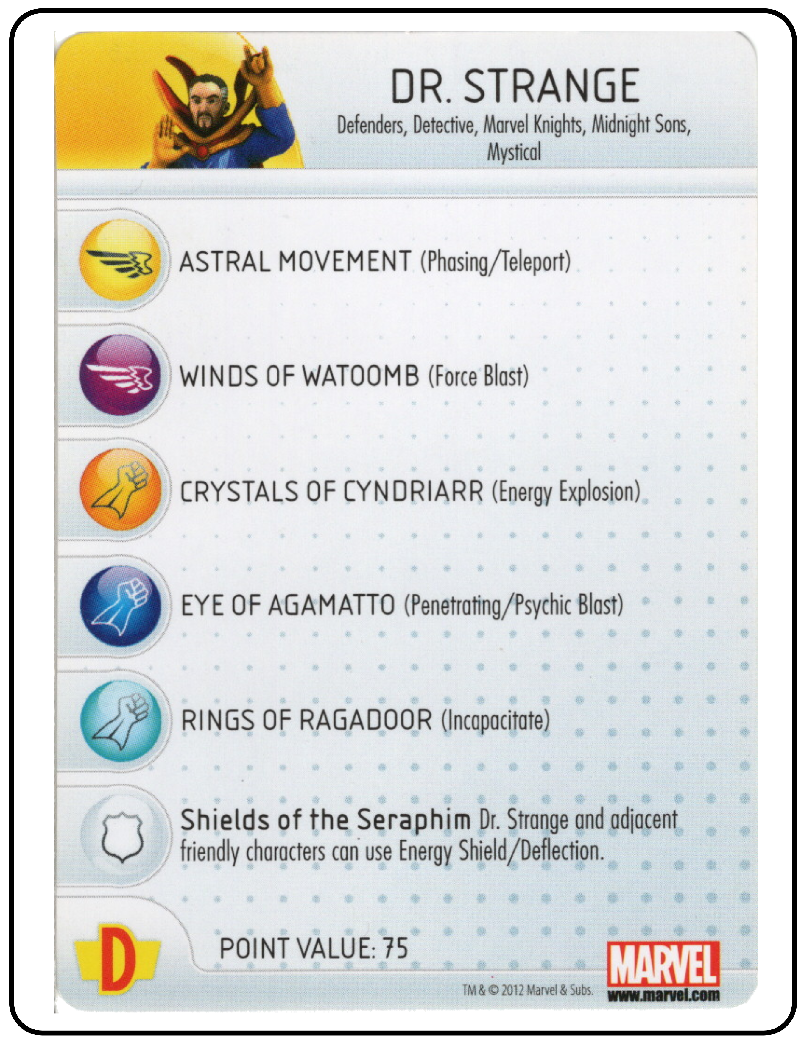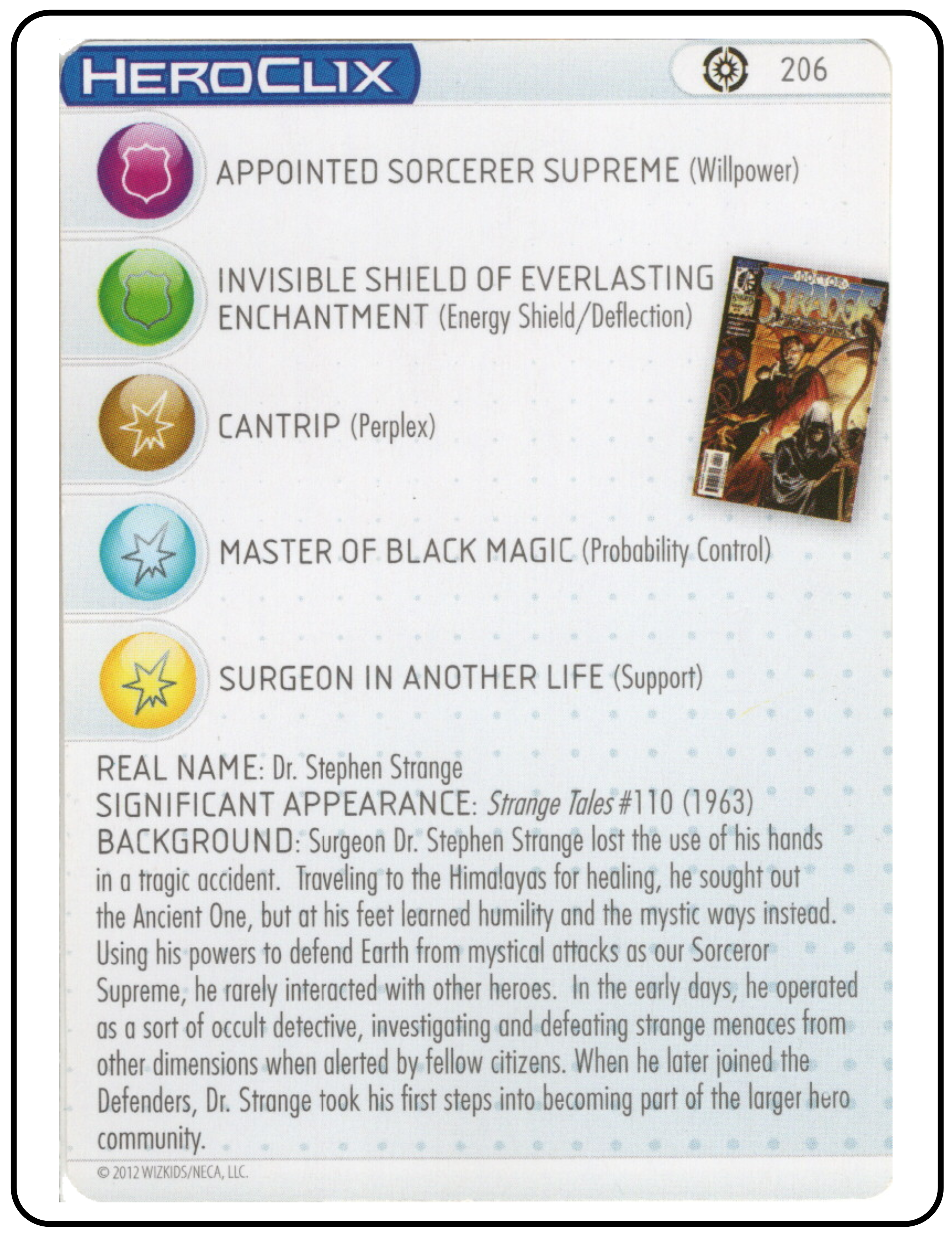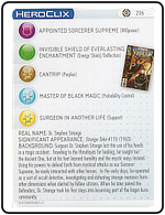 Name: Dr. Strange Number: 206 Rarity: Common Set Name: Galactic Guardians Type: Figure & Character Card Year: 2012 Catalog Number: 07:02:00:0036:K10 Main Category: Games Sub Category: HeroClix Secondary Category: None Details: This figure is the same sculpt as figure 028 and 014 from the same set. Figure 014 is the astral form of this figure and 028 is the same paint depicting Dr. Strange in his classic comic costume rising above the ground on a clear plastic column of smoke. The other two figures are also in the collection.