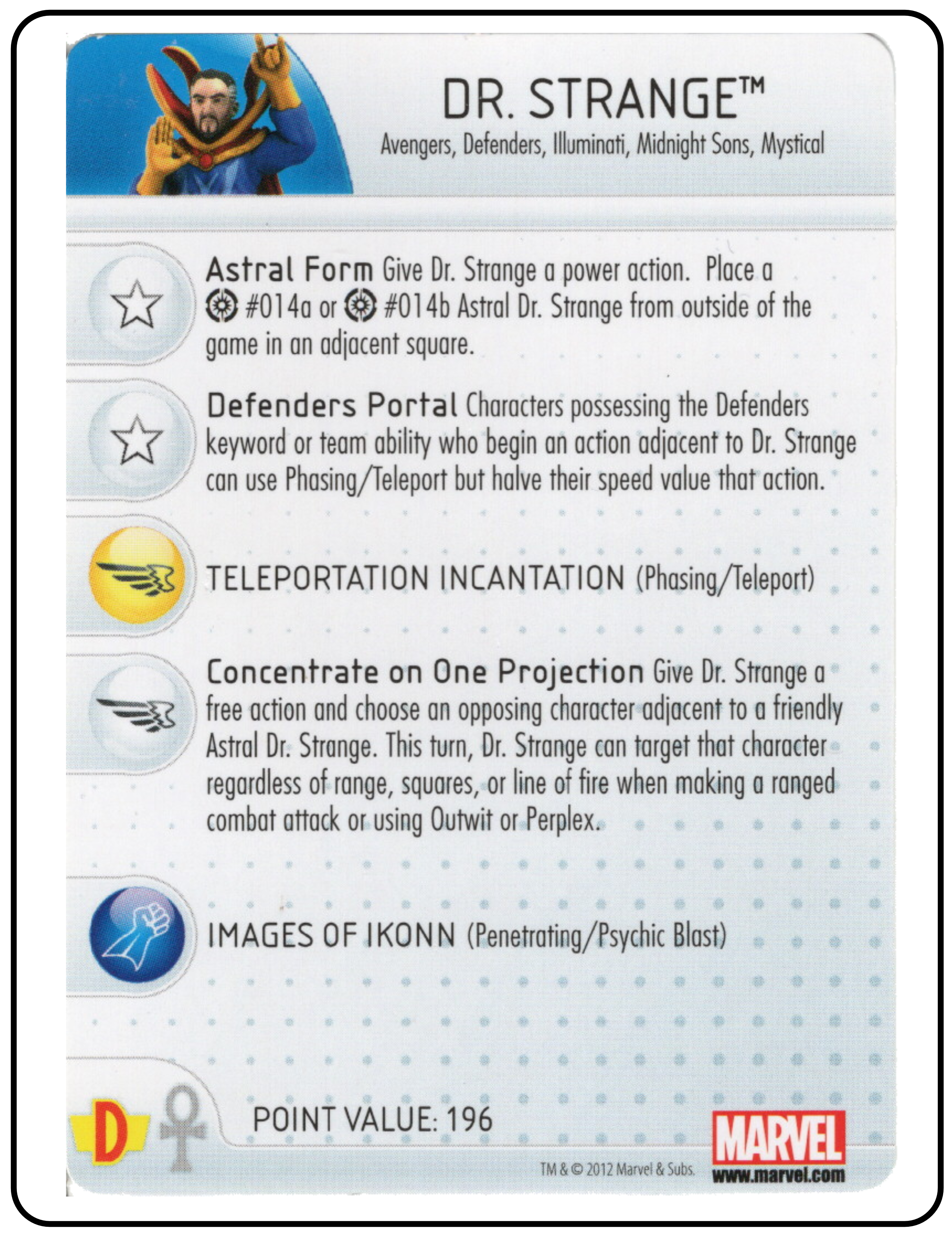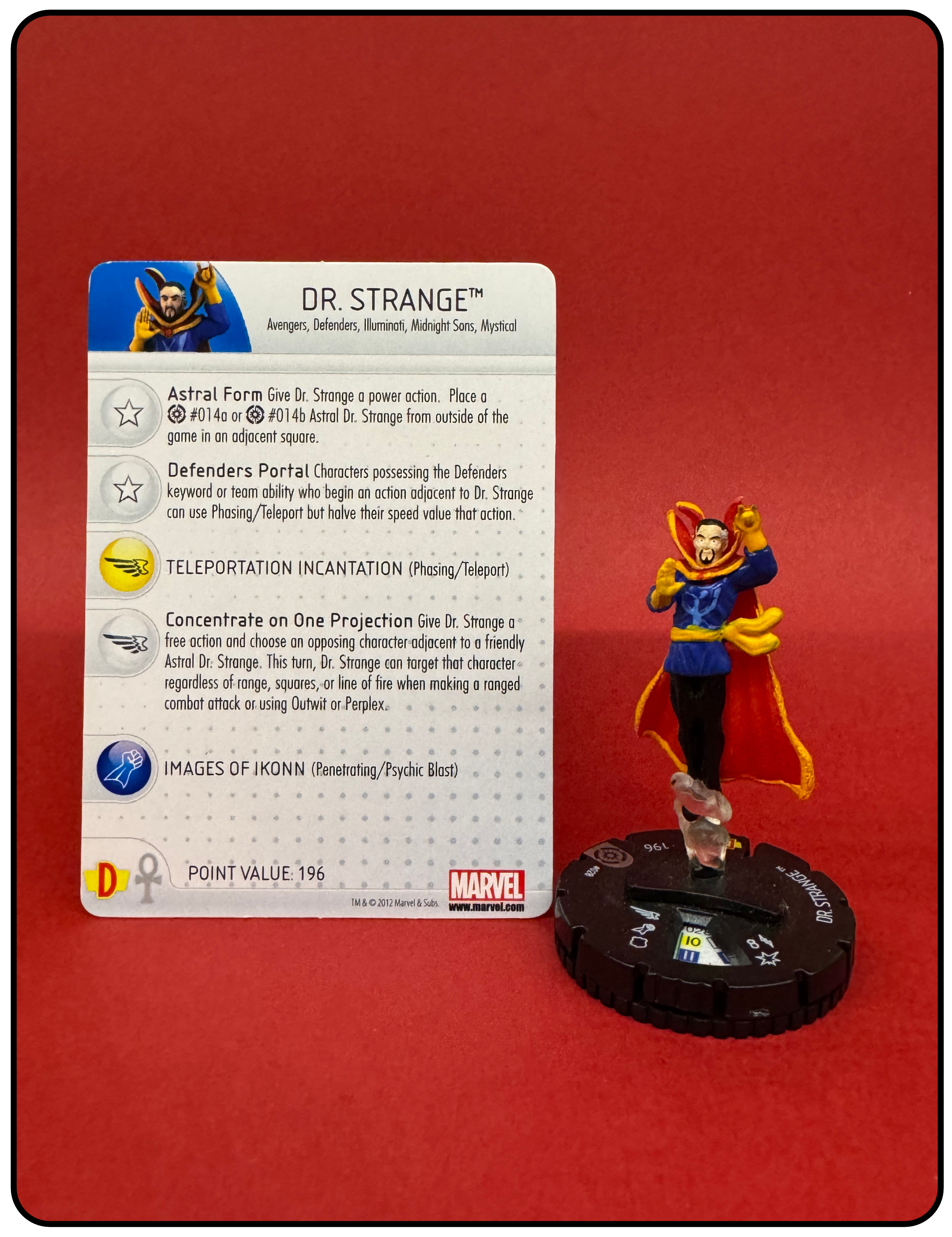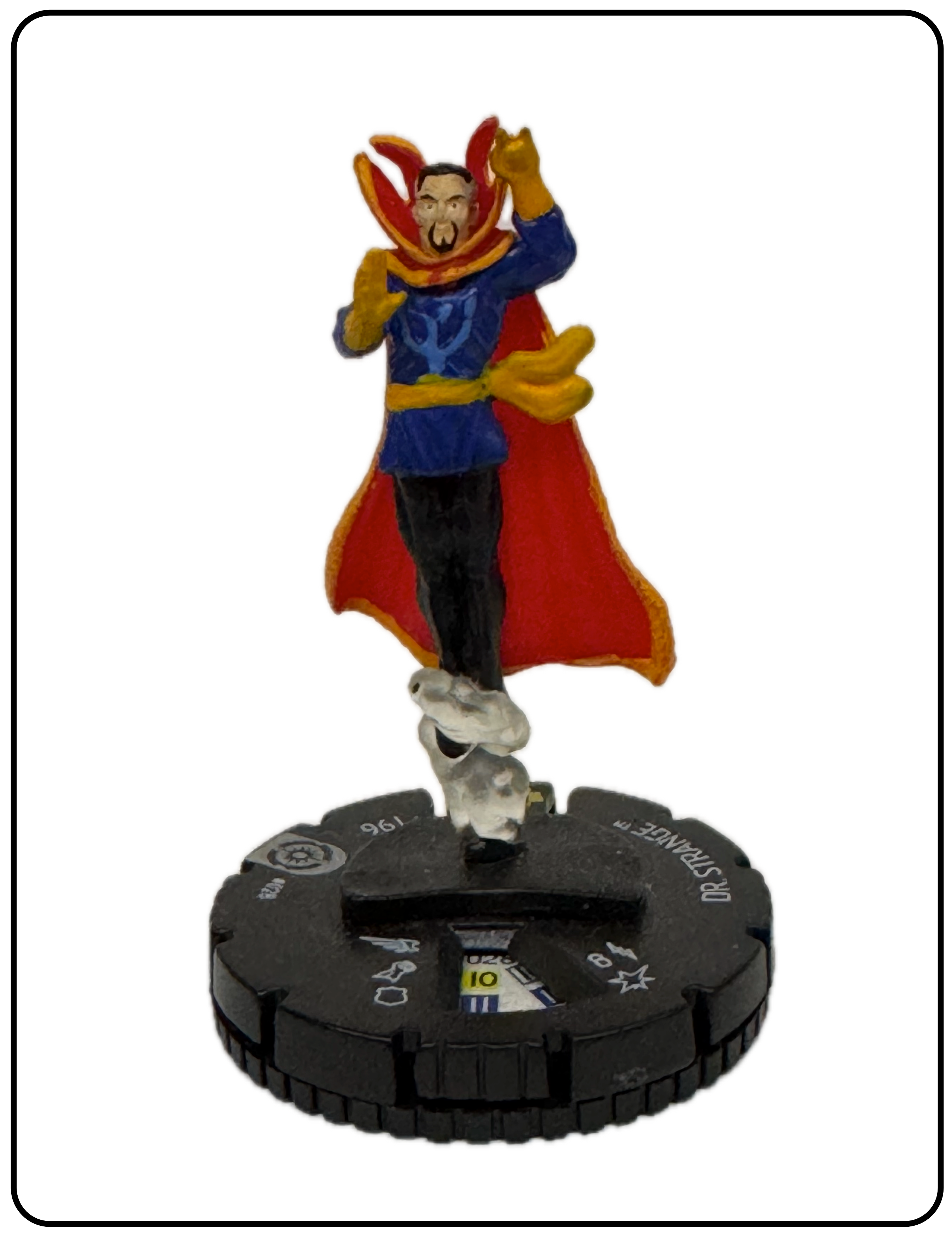 Name: Dr. Strange Number: 028 Rarity: Rare Set Name: Galactic Guardians Type: Figure & Character Card Year: 2012 Catalog Number: 07:02:00:0037:K10 Main Category: Games Sub Category: HeroClix Secondary Category: None Details: This figure is the same sculpt as figure 206 and 014 from the same set. Figure 014 is the astral form of this figure and 206 is the same paint depicting Dr. Strange in his classic comic costume rising above the ground on a clear plastic column of smoke. The other two figures are also in the collection.