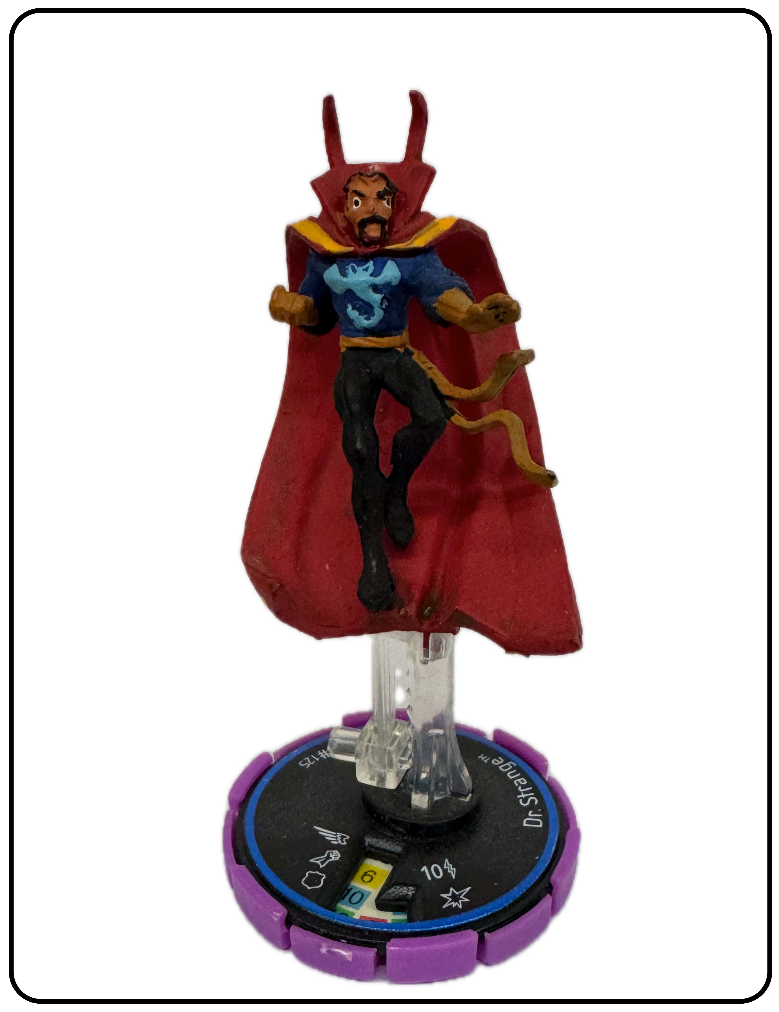 Name: Dr. Strange Number: 125 Rarity: Experienced Set Name: Infinity Challenge Type: Figure Year: 2002 Catalog Number: 07:02:00:0041:K10 Main Category: Games Sub Category: HeroClix Secondary Category: None Details: This figure along with figure 124 and 126 were the first Dr. Strange HeroClix figures. All three are the same sculpt and paint which depicts Dr. Strange levitating in the air on a clear plastic peg dressed in his classic comic costume. The sculpt and paint are horrible compared to what they would eventually evolve into. This figure has a blue ring (Experienced) around the top of the Clix base which is black with a purple casing. This was before figures came with cards.