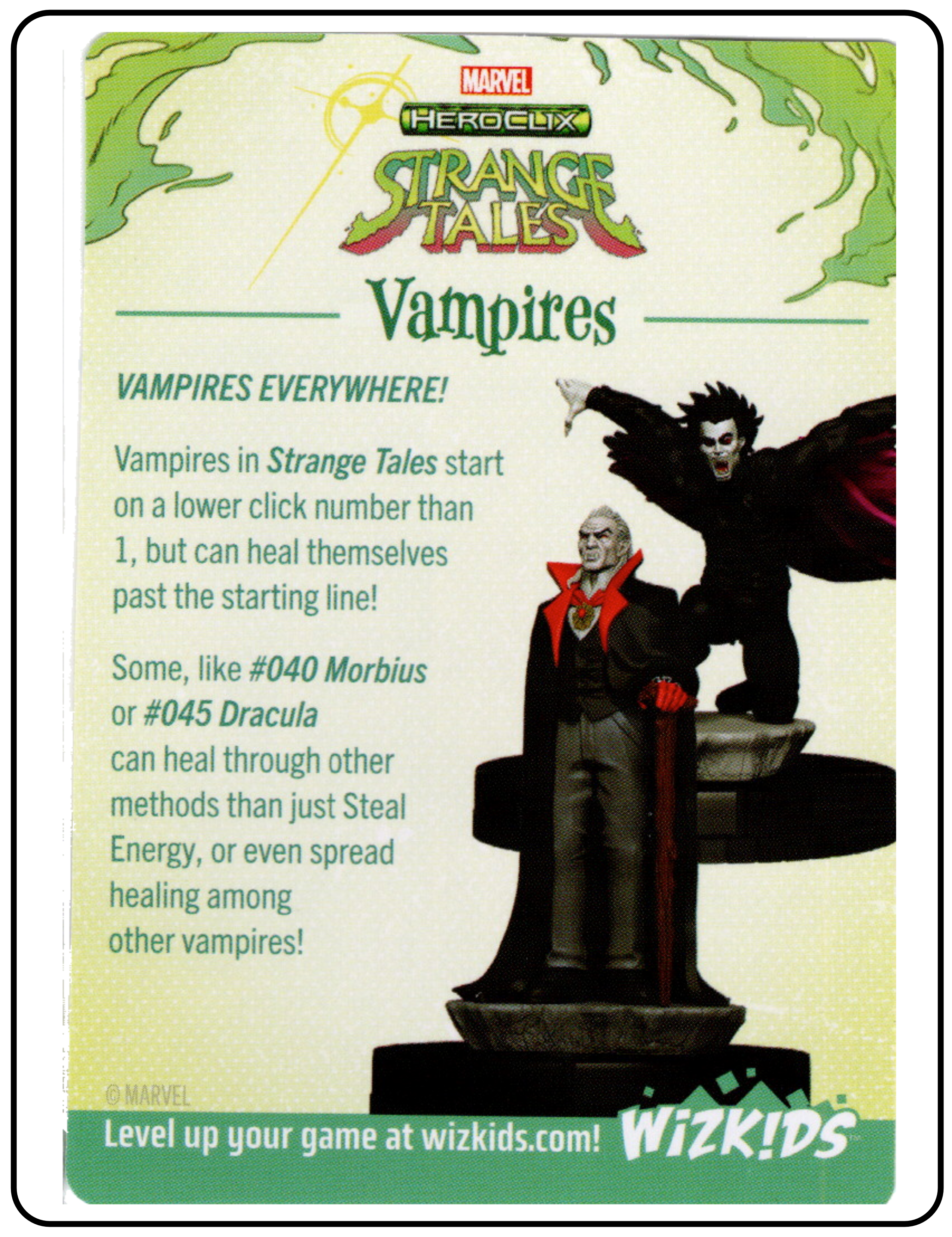Name: Astral Form / Vampires Number: None Rarity: N/A Set Name: Strange Tales Type: Power & Ability Card Year: 2025 Catalog Number: 07:02:00:0007:K10 Main Category: Games Sub Category: HeroClix Secondary Category: None Details: This Powers & Ability Card has Astral Form on one side and Vampires on the other. The Astral Form side talks about how some characters have astral projection versions. The Vampires side explain how vampires heal and that vampires start at a lower click than 1.