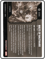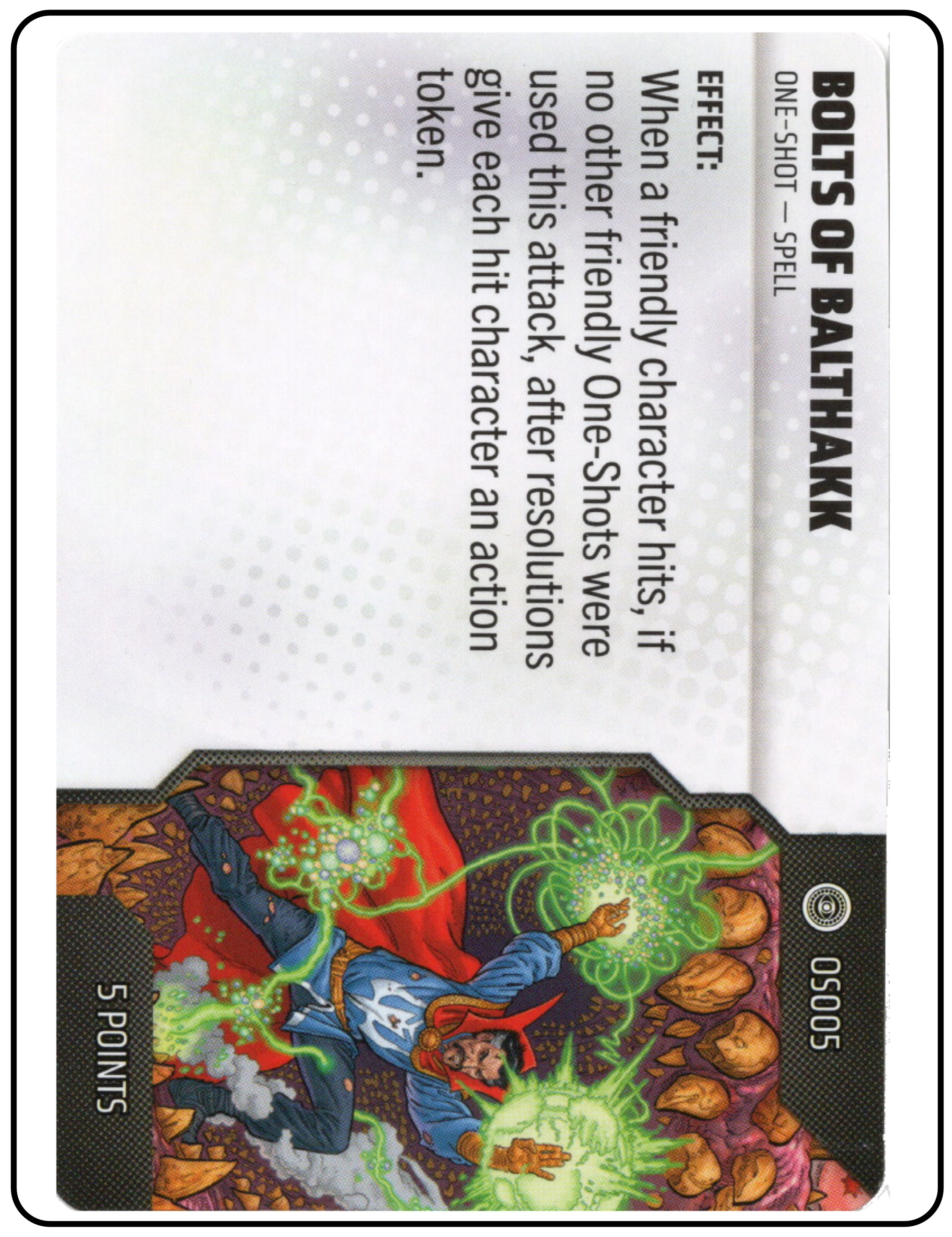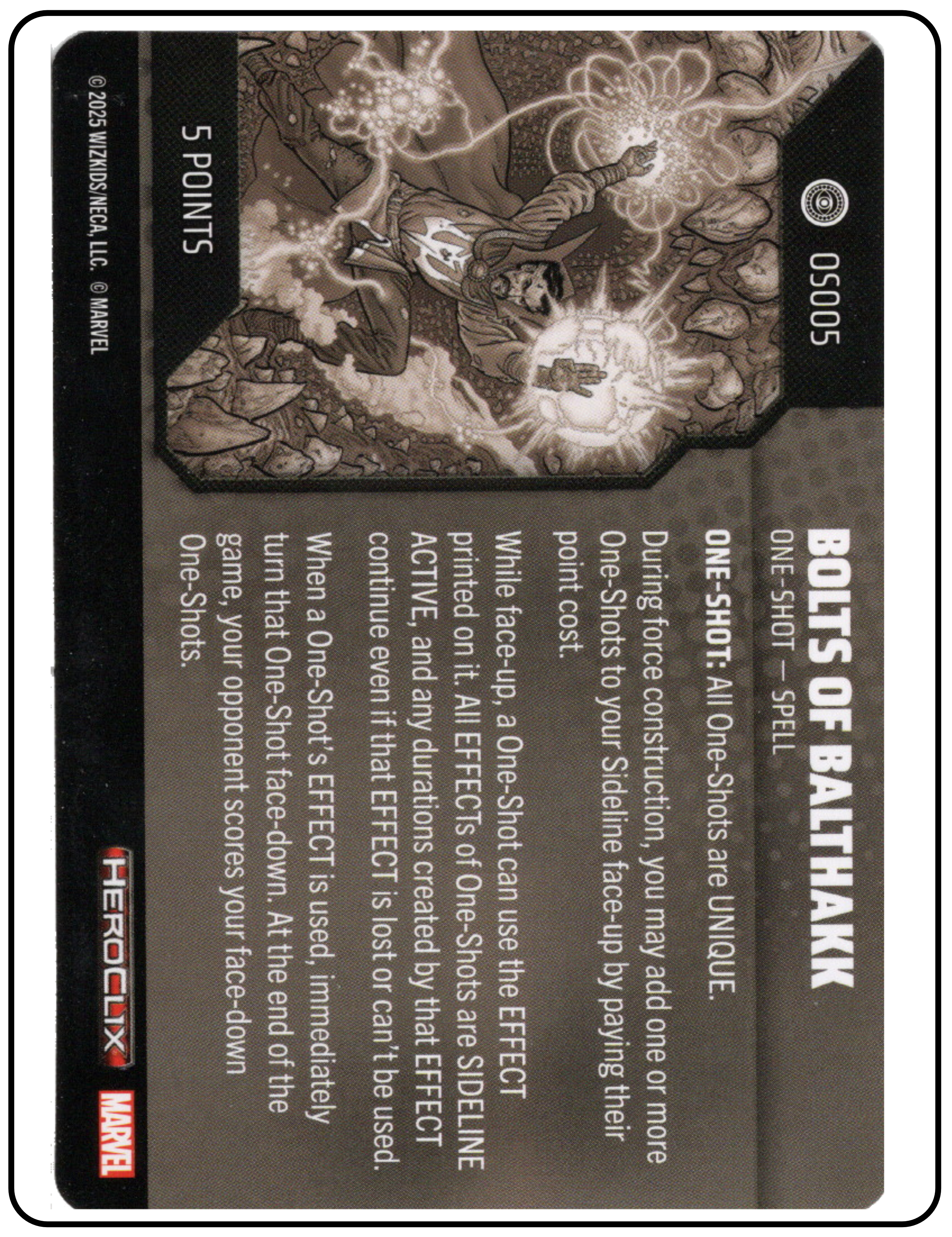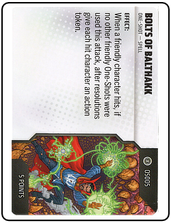 Name: Bolts of Balthakk Number: None Rarity: Unique Set Name: Strange Tales Type: Power & Ability Card Year: 2025 Catalog Number: 07:02:00:0008:K10 Main Category: Games Sub Category: HeroClix Secondary Category: None Details: This spell card outlines the effect and use of Bolts of Balthakk, which is a unique one-shot spell. During force construction, you can add one or more on-shots to your sideline.