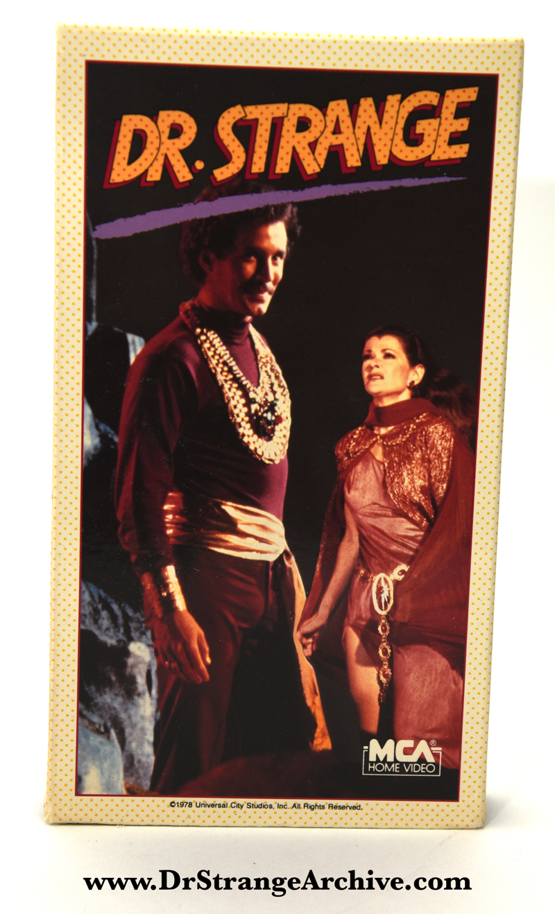 Item: Dr. Strange TV Pilot Date: 1987 Type: VHS Size: 4 1/8" x 7 3/8" Company: MCA Home video Description: This is the VHS version of the Dr. Strange TV pilot from 1978 that was produced for movie rental stores. The front boarder and bad are off-white with yellow dots. The number 55104 appears on the side of the box. Run time is 1hr 34min.