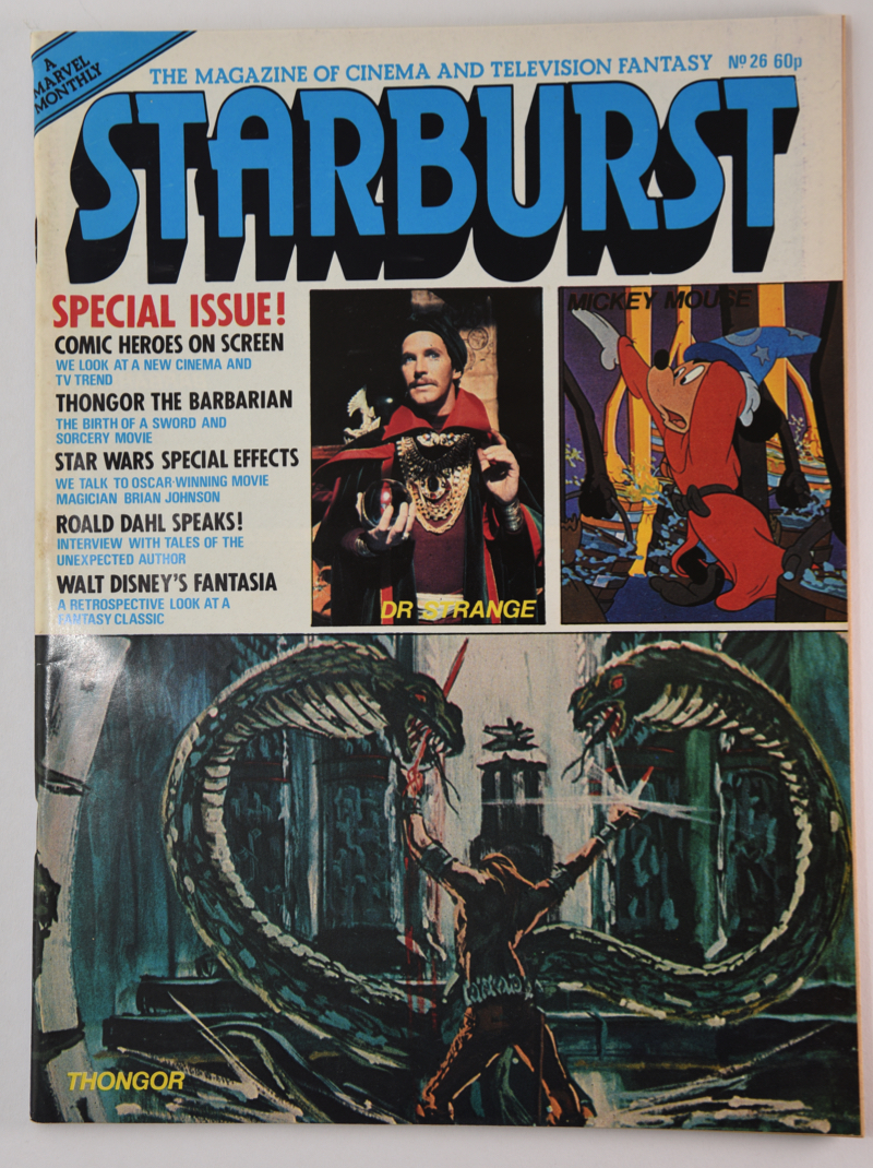 Item: Starburst Magazine #26 Date: 1980 Type: Magazine Size: 8" x 10 7/8" Company: Starburst Publishing, Ltd. Description: This is a British Sci-Fi magazine that was started back in 1977. This issue is Volume 3 number 2 and was published by Stan Lee and distributed by Comag. The magazine went away then was resurrected in 2011. This issue features a picture from the Dr. Strange TV pilot on the cover and another picture form the pilot inside in an article about Marvel characters on TV. The cover price is 60p and was published October of 1980.