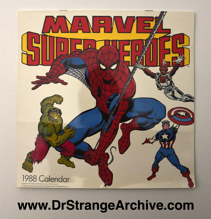Item: Marvel Superheroes 1988 Calendar Date: 1987 Type: Calendar Size: 12 x 12 Company: Design Look, Inc. Description: This is the 1988 Marvel calendar. It features different Marvel art for each month. The art from one of my favorite Dr. Strange posters is featured for May. The artist is Kevin Nolan. It was printed in Korea. Suggested retail price was $8.95. ISBN # 0-933205-64-3.