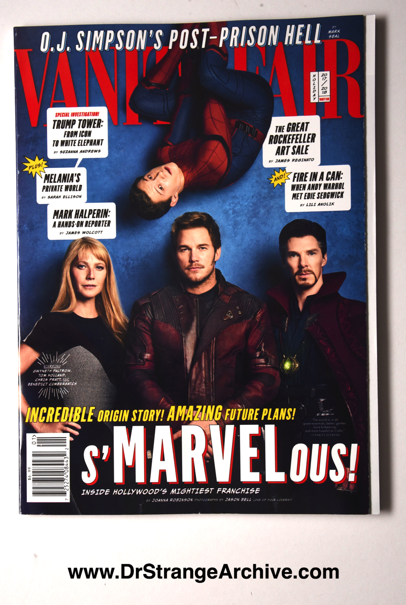 Item: Vanity Fair Date: 2017 Type: Magazine Size: 8" x 10 3/4" Company: Conde Nast Description: This is the Holiday 2017/2018 edition of Vanity Fair magazine with Dr. Strange, Spider-man, Pepper Potts and Star Lord on the cover. There are four versions of the cover to this edition each featuring a different group of Marvel Characters. Inside is a photoshoot featuring Marvel characters and an article on Marvel Studios.