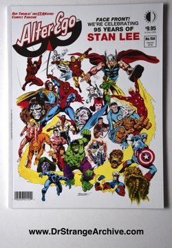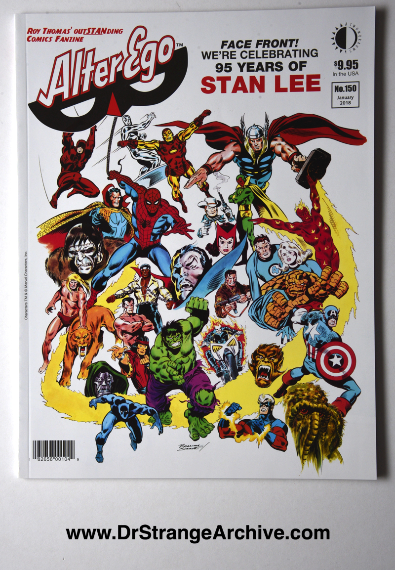 Item: Alter Ego 150 Date: 2017 Type: Magazine Size: 8 1/4" x 10 3/4" Company: TwoMorrows Description: This issue of Alter Ego magazine has Dr. Strange and several other marvel characters on the cover. The magazine features articles on Stan Lee.