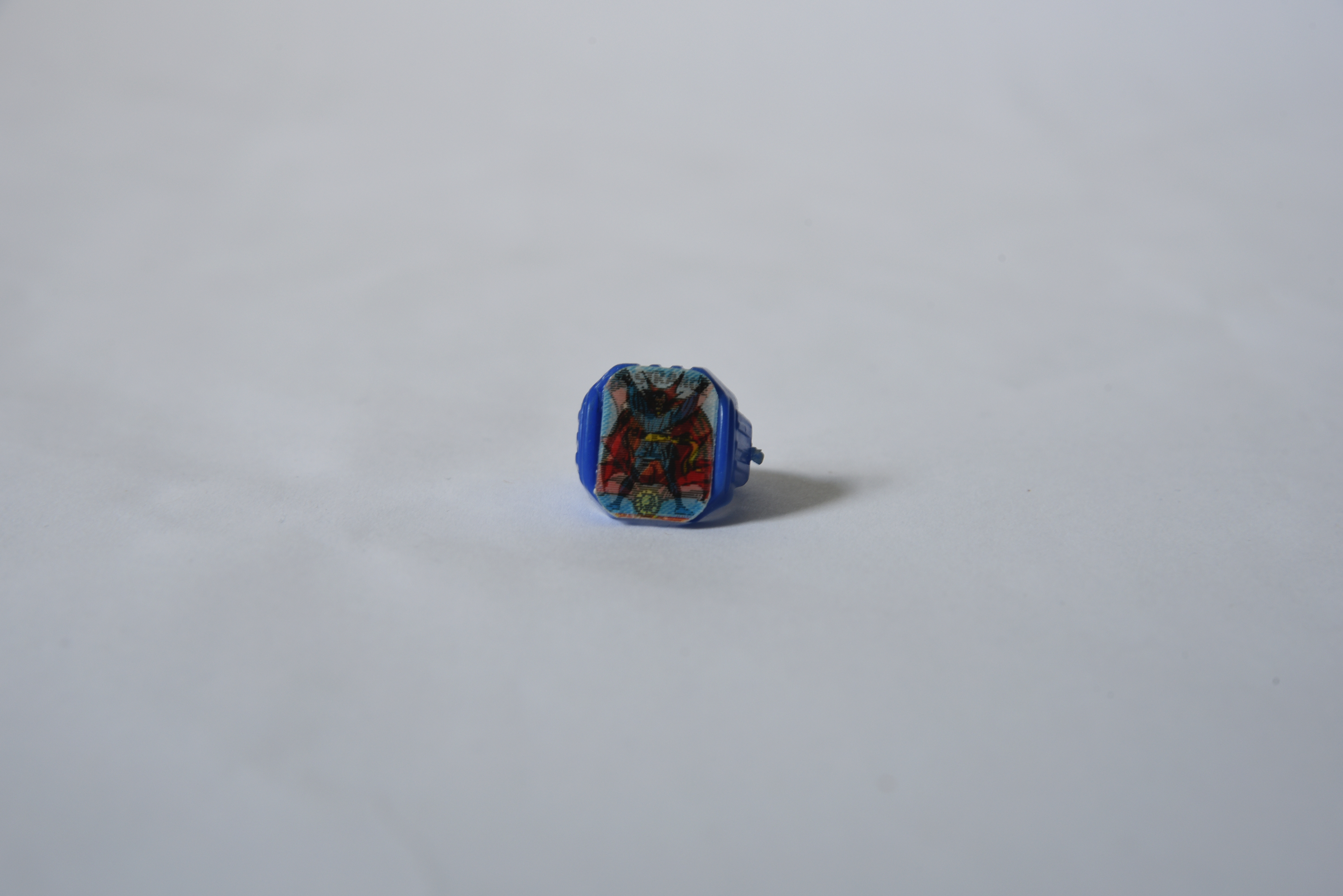 Item: Dr. Strange Ring Date: Unk Type: Ring Size: 5/8 x 3/4 Company: Unk Description: This is a small blue plastic ring. The image changes as you change the viewing angle.