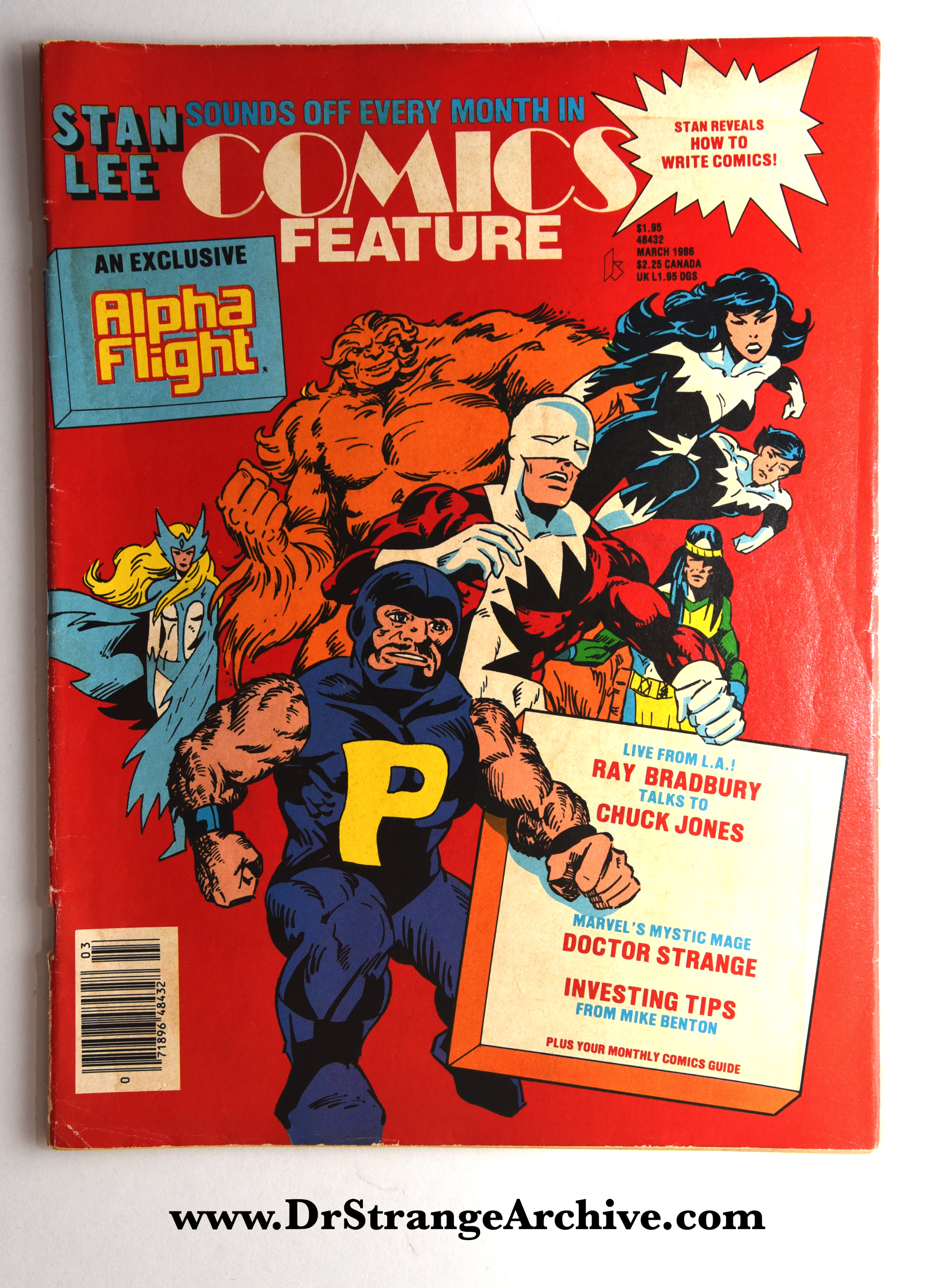 Item: Stan Lee Comic Feature Date: 1986 Type: Magazine Size: 8" x 10 3/4" Company: New Media Publishing, Inc. Description: This is a comic book magazine published in the 1980s. The cover features Alpha Flight and contains six page article on Dr. Strange comics.