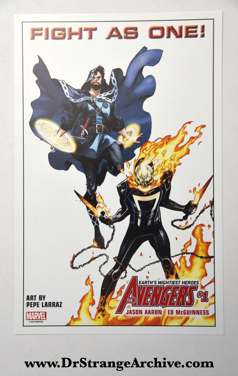 Item: Avengers #1 Litho Date: 2018 Type: Advertising Size: 6.5" x 10 1/4" Company: Marvel Description: This is a free giveaway card distributed in May of 2018. It was called a "Litho" that was produced to advertise the new Avengers series. Several different versions of these were produced. This version has Dr. Strange and Ghost Rider on it.