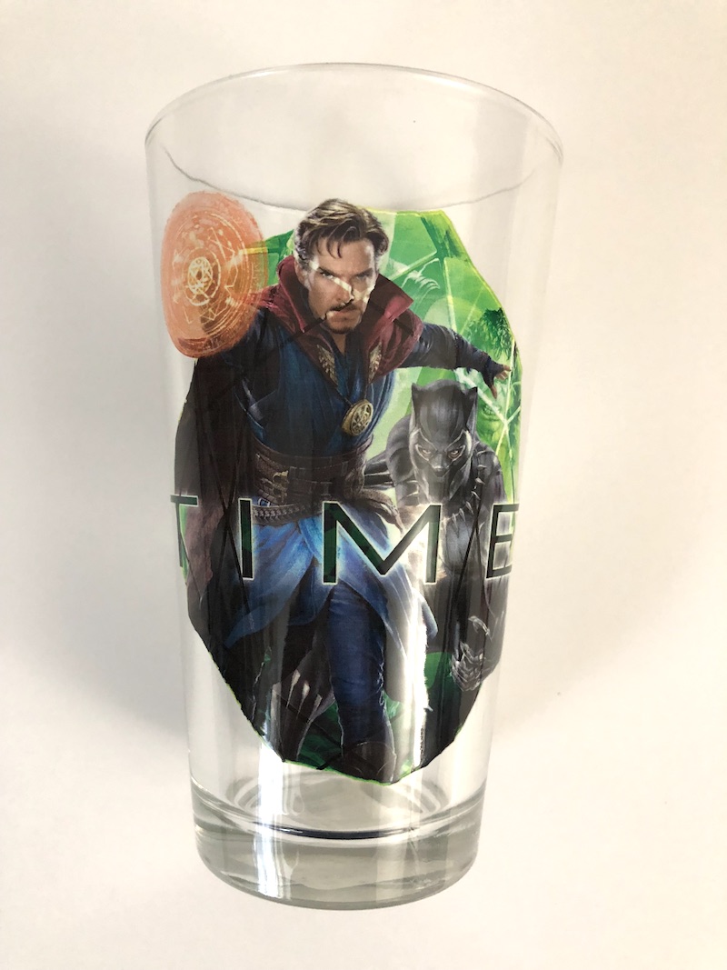 Item: Avengers Infinity war Toon Tumber Date: 2018 Type: Cup Size: 3 3/8" x 6" Company: PopFun Merchandising, LLC Description: This is a glass cup with the Avengers Infinity War Dr. Strange and Black Panther on it along with the words "TIME".