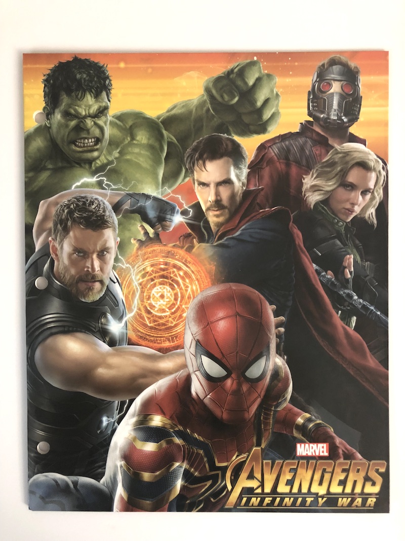 |  | Item: Avengers Infinity War Folder Date: 2018 Type: Folder Size: 9 1/4" x 11 3/4" Company: Innovative Designs, LLC Description: This is a portfolio folder with Avengers Infinity War movie art on the front and back. Dr. Strange, Hulk, Thor, Black Widow, Spider-Man and Star Lord are on the front and Iron Man, Captain America and Rocket Raccoon are on the back. Groot, Falcon, Gamora, Winter Solder and War Machine are pictured inside. |