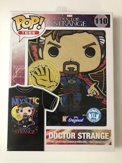 Item: Doctor Strange PoP T-Shirt Date: 2016 Type: Clothing Size: XL Company: Funko LLC Description: This is a limited edition XL unisex t-shirt featuring the movie version of Dr. Strange as a Funko Pop character with the words Master of the Mystic Arts Marvel Doctor Strange on the front. It is in a t-shirt box that mimics a Pop box with the number 110 in the corner.