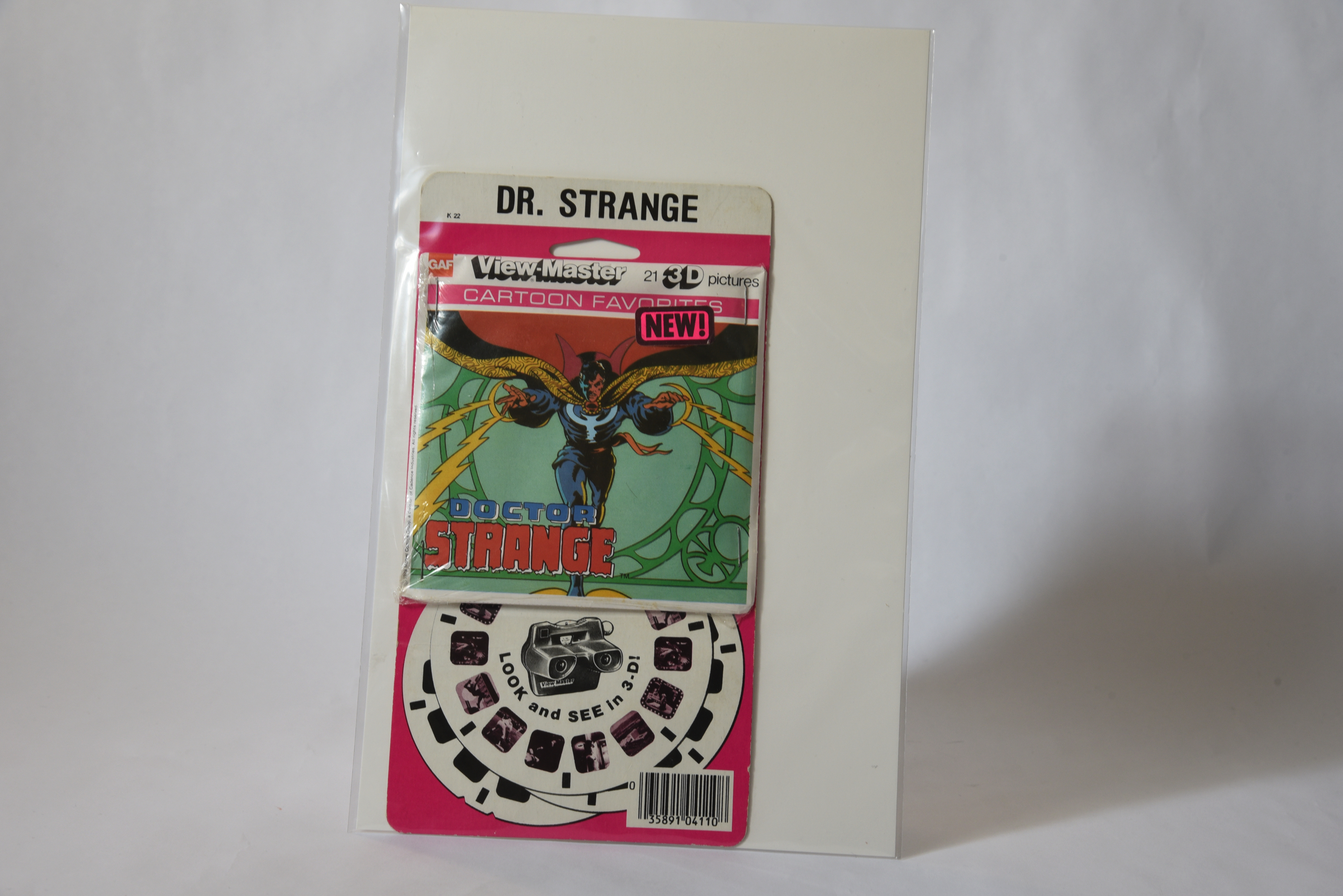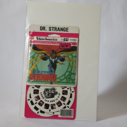 Item: Dr. Strange View-Master Date: 1979 Type: Toy Size: 8 3/8 x 4 1/2 Company: GAF Description: This is a set of View-Master slides featuring Dr. Strange. There are 21 3D pictures in the set.