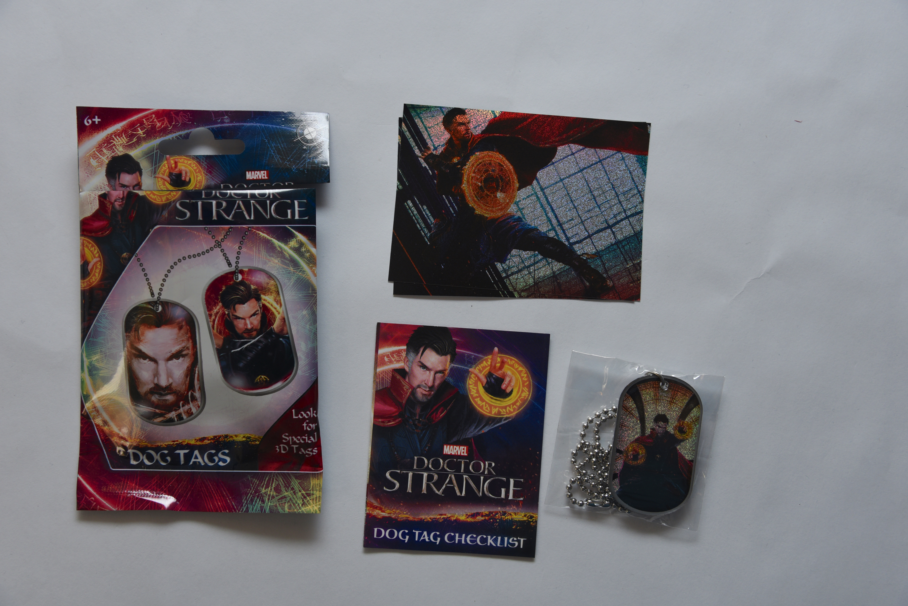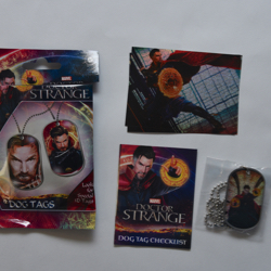 Item: Doctor Strange Dog Tags Date: 2016 Type: Apparel Size: 5 1/2 x 3 3/8 Company: bulls i toy Description: This is a Doctor Strange movie dog tag set. Each package comes with one dog tag and one sticker. The sticker set includes 24 base stickers and 24 foil stickers. The dog tag set includes: 24 base tags, 24 foil tags (1:4), 4 3D takes (1:24). This package included sticker 40 of 48 (its a foil sticker) and tag 26 of 48 (its a foil tag). The package also comes with a visual checklist of all 24 tag pictures.