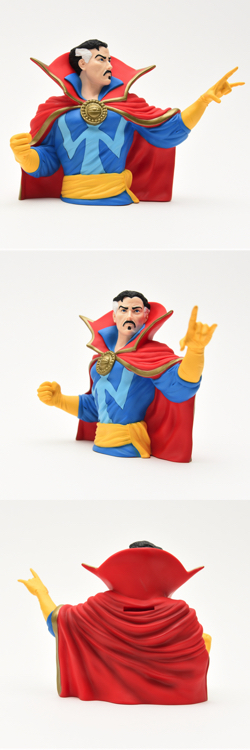 Item: Marvel Dr. Strange Bust Bank Date: 2017 Type: Bank Size: 10 x 7.5 Company: MonogramDirect Description: This is a coin bank depicting Doctor Strange from the waste up. It is styled after the comic book version of the Doctor. It has a coin slot in the back and a plug in the bottom to retrieve coins. It is painted extremely well and looks great.