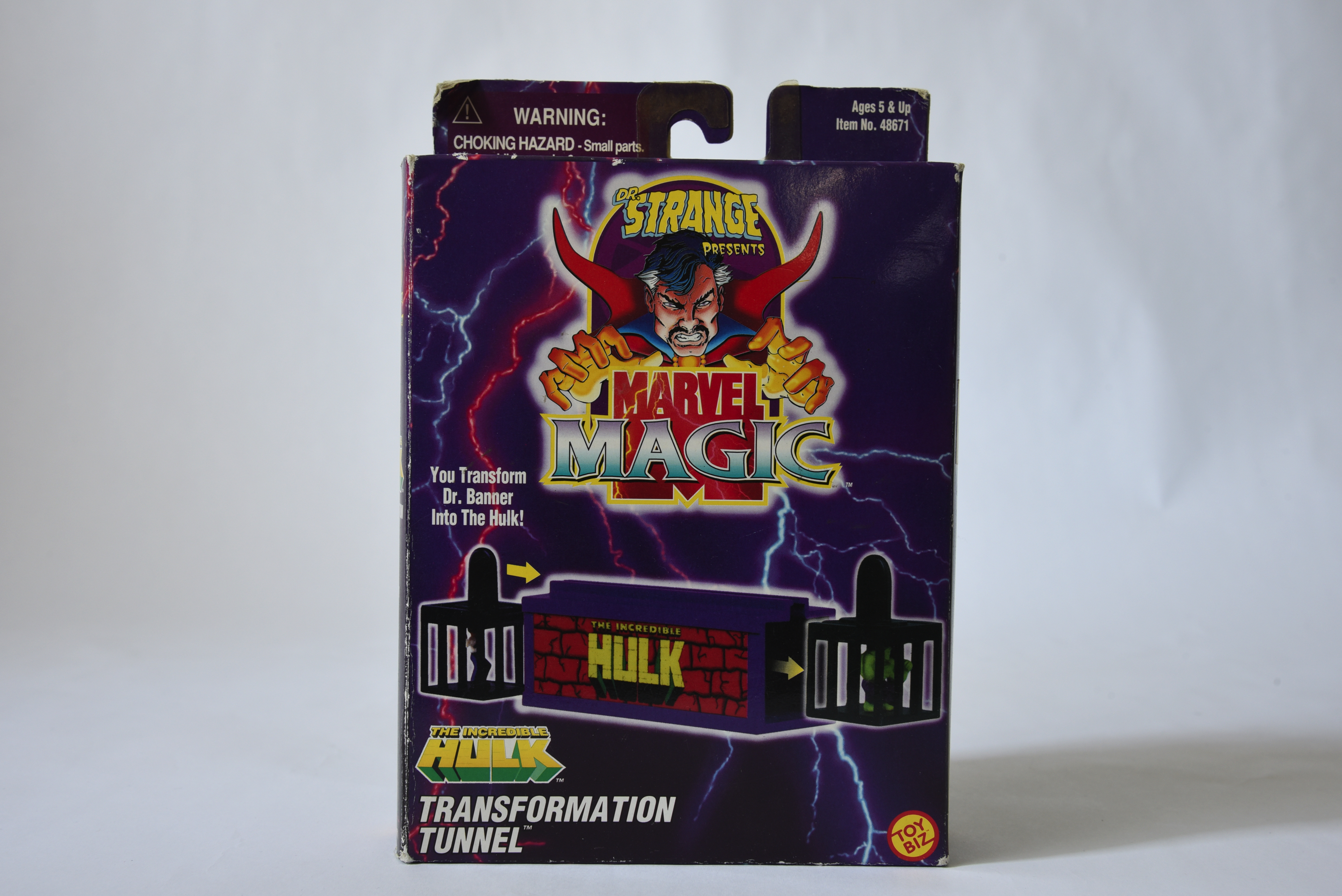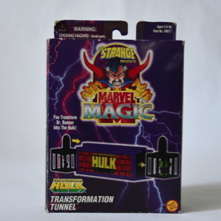 Item: Dr. Strange Presents Marvel Magic Date: 1996 Type: Toy Size: Unk Company: Toy Biz Description: This is a plastic magic trick toy that transforms a small Bruce Banner into a small Incredible Hulk by passing it through a plastic tunnel.
