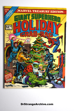 Item: Marvel Treasury Edition Giant Superhero Holiday Grab-Bag Date: 1975 Type: Comic Magazine Size: 10 1/4 x 13 3/8 Company: Marvel Comics Group Description: This is a giant Marvel Treasury Edition Special Christmas Issue including reprints of various Marvel christmas stories. Doctor Strange is on the cover and in a story called Eternity Eternity.