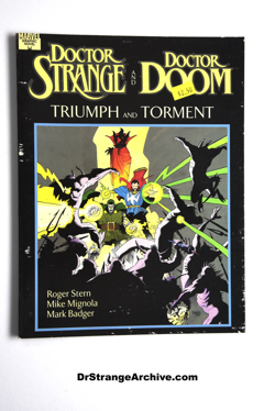 Item: Doctor Strange and Doctor Doom Triumph and Torment Date: 1989 Type: Graphic Novel Size: 8 1/4 x 10 7/8 Company: Marvel Entertainment Group, Inc. Description: This is a great graphic novel by Roger Stern Mike Mignola and Mark Badger.