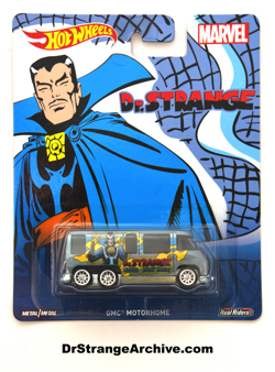 Item: Hotwheels Dr. Strange GMC Motorhome Date: 2015 Type: Toy Size: 5 1/4" x 6 1/2" Company: Mattel Description: This is a Dr. Strange Hotwheels GMC Motorhome. It has dual rear axils and the very first image of Dr. Strange form Strange Tales 110 Master of Black Magic on the side. The vehicle measures approximately 3" long. There are several reference numbers on the back of the card: TPN 5_K7, DJG97-4B10, DLB45.