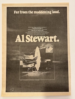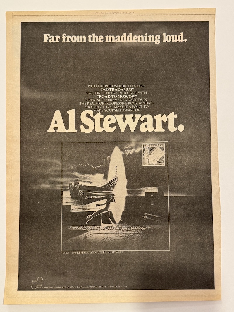 Item: Al Stewart - Past, Present And Future Album Ad Company: Rolling Stone Magazine Date: 1974-05-23 Catalog Number: 18:08:11:0014:C11 Main Category: Music and Recorded Audio Sub Category: Magazines Secondary Category: Magazines Size: 9 1/4" x 12 7/8" Details: This is an ad in Rolling Stone magazine for the Al Stewart Past, Present And Future album released in 1974 in the US and originally released in 1973 in the UK. The main image image is the same image as the US release album cover. The The album cover features Doctor Strange stepping through a portal. Hipgnosis did the sleeve design and photography. They are the same group that did Saucerful of Secrets (Pink Floyd) that contained Doctor Strange. They also designed the famous The Dark Side of the Moon album cover along with many other famous covers for other rock bands. The top of the ad is titled Far from the maddening loud.