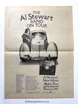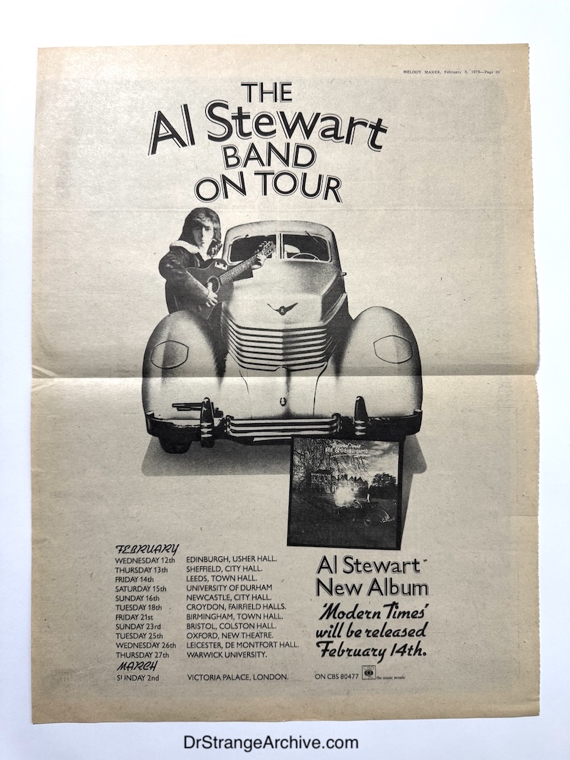 Item: Al Stewart - Modern Times Concert Tour Ad Company: Melody Maker Magazine Date: 1975-02-08 Catalog Number: 18:08:11:0018:C11 Main Category: Music and Recorded Audio Sub Category: Magazines Secondary Category: Magazines Size: 13" x 17 1/2" Details: This is an advertisement in Melody Maker magazine for the 1975 Al Stewart Modern Times UK concert tour. It also lists the release date for the UK album as February 14th. The image below the car is the same image as the UK release album cover. The original photo was taken on the grounds of Stone House, Rushlake Green in Sussex. The woman was David Gilmours (Pink Floyd) first wife, Ginger Gilmour. The Cord automobile Al Stewart is sitting in belonged to Jimmy Page (Led Zeppelin). Doctor Strange is in the middle of the picture holding a mirror. He is hard to see in the black and white advertisement, but is much clearer on the album cover. Hipgnosis did the photography. They are the same group that did Saucerful of Secrets (Pink Floyd) that contained Doctor Strange. They also designed the famous The Dark Side of the Moon album cover along with many other famous covers for other rock bands.