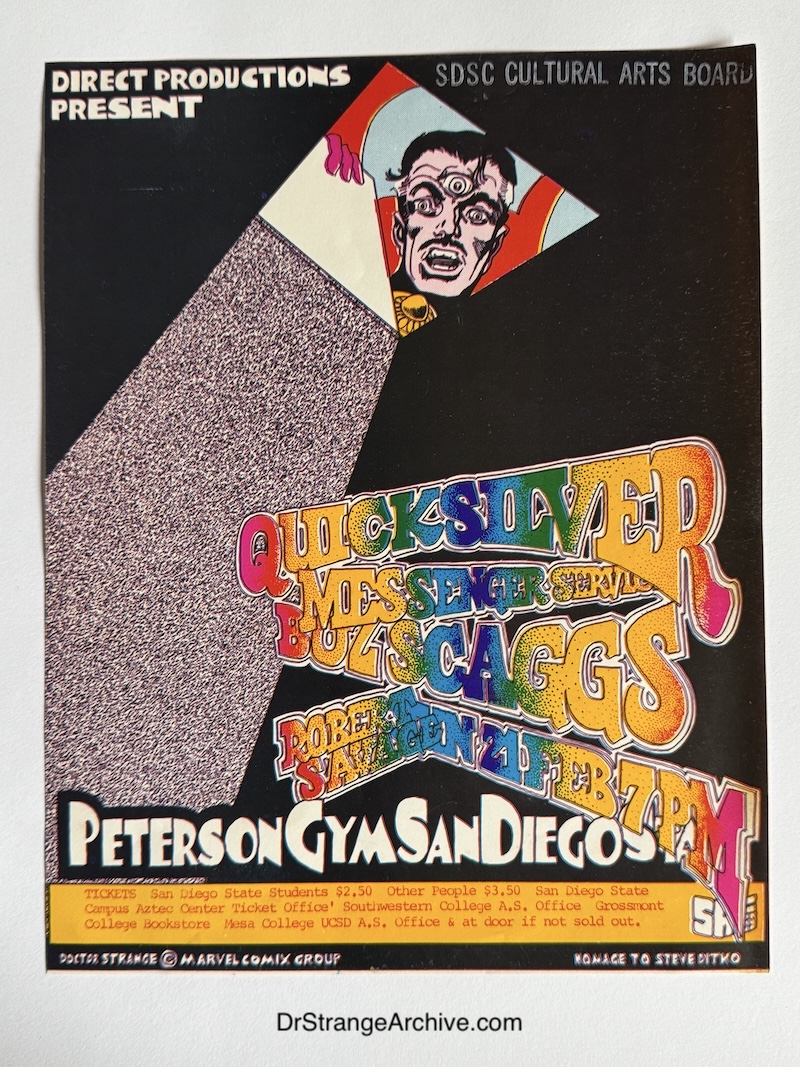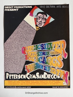 Company: SDSC Cultural Arts Board Date: 1971-02-21 Catalog Number: 18:07:09:0019:C11 Main Category: Music and Recorded Audio Sub Category: Flyers Secondary Category: None Size: 8" x 10 1/4" Details: This is a concert flyer for the February 21st, 1971 Quicksilver Messenger Service, Boz Scaggs and Robert Savage Group concert held at the Peterson Gym on the San Diego State University campus (known then as the San Diego State College). The flyer lists ticket prices as $2.50 for students and $3.50 for all others. The concert sold out (4,500 tickets). Several hundred other fans crashed the gates to get in. The flyer depicts Dr. Strange opening what looks like a trap door and peering through with his third eye open. The artist is Tad Hunter, who was also known as San Andreas Fault. Tad was a well known concert poster artist in the 60s and 70s. Boz Scaggs (who was the lead guitarist for the Steve Miller band before leaving in the late 60s to pursue a solo career) was the most popular at the concert, doing five encores. The attendees didn’t want the headliner, Quicksilver Messenger Service to come on. Many of the attendees left when Quicksilver finally came on the stage. Before leaving, they had trashed the gym so heavily the next morning’s gym class had to be canceled. |