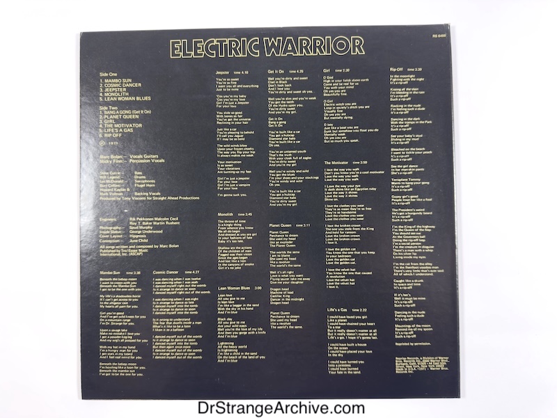 |  | Item: Electric Warrior Company: Reprise Records Date: 1971-00-00 Catalog Number: 18:01:00:0003:B10 Main Category: Music and Recorded Audio Sub Category: Albums Secondary Category: None Size: 12 3/8" x 12 3/8" Details: This is the 1971 T. Rex Electric Warrior Album by Reprise Records. The runout is RS-1-6466 LW1 and it contained eleven tracks. The song Mambo Sun, written by Marc Bolan, mentions Doctor Strange. Marc, the lead singer, was a huge Marvel comics fan especially Silver Surfer and Doctor Strange. He even interviewed Stan Lee in in 1975. Marc talked about his love for comics when he was interviewed by Neil Tennant in 1975, who at the time was editor for Marvel UK. Neil later founded the band Pet Shop Boys. Marc also did a spoken work intro to his Futuristic Dragon album, which he stated was done very much like an intro to a Doctor Strange story. |