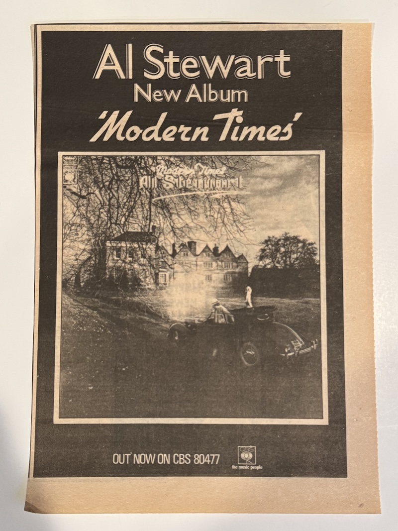 Item: Al Stewart - Modern Times Ad Company: Unk Date: 1975-00-00 Catalog Number: 18:08:11:0007:C11 Main Category: Music and Recorded Audio Sub Category: Magazines Secondary Category: Magazines Size: 6 7/8" x 10" Details: This is a music magazine advertisement for the 1975 Al Stewart Modern Times album. It is unknown which magazine it was clipped from.