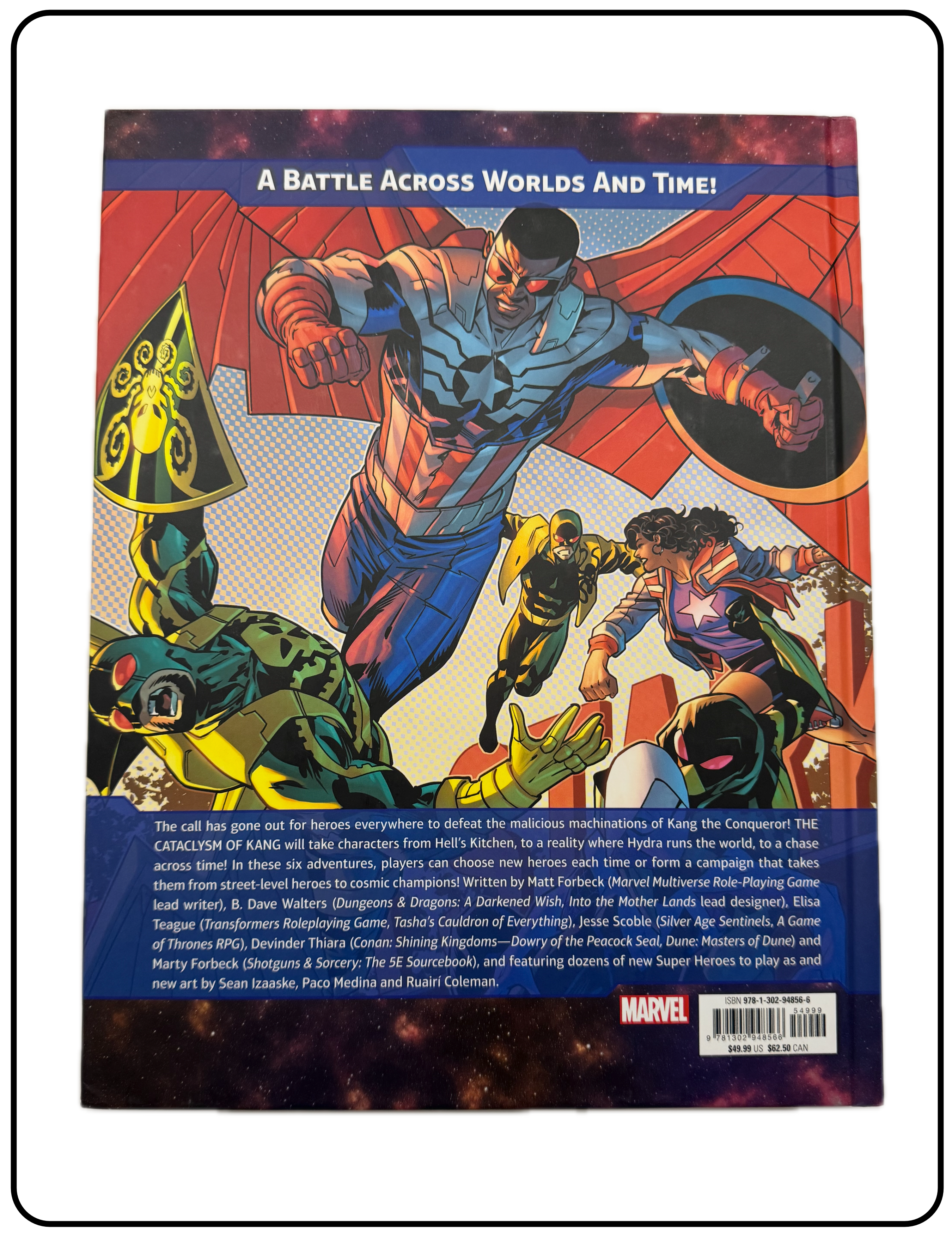 Name: Marvel Multiverse Role-playing Game The Cataclysm of Kang Adventure Company: Marvel Worldwide, Inc. Type: Adventure Year: 2023 Catalog Number: 07:03:12:0004:C21 Main Category: Games Sub Category: Role-playing Games Secondary Category: Books Details: This is the 256 page The Cataclysm of Kang Adventure book for the Marvel Multiverse Role-playing game introduced in 2023. Dr. Strange appears on numerous pages throughout the book.