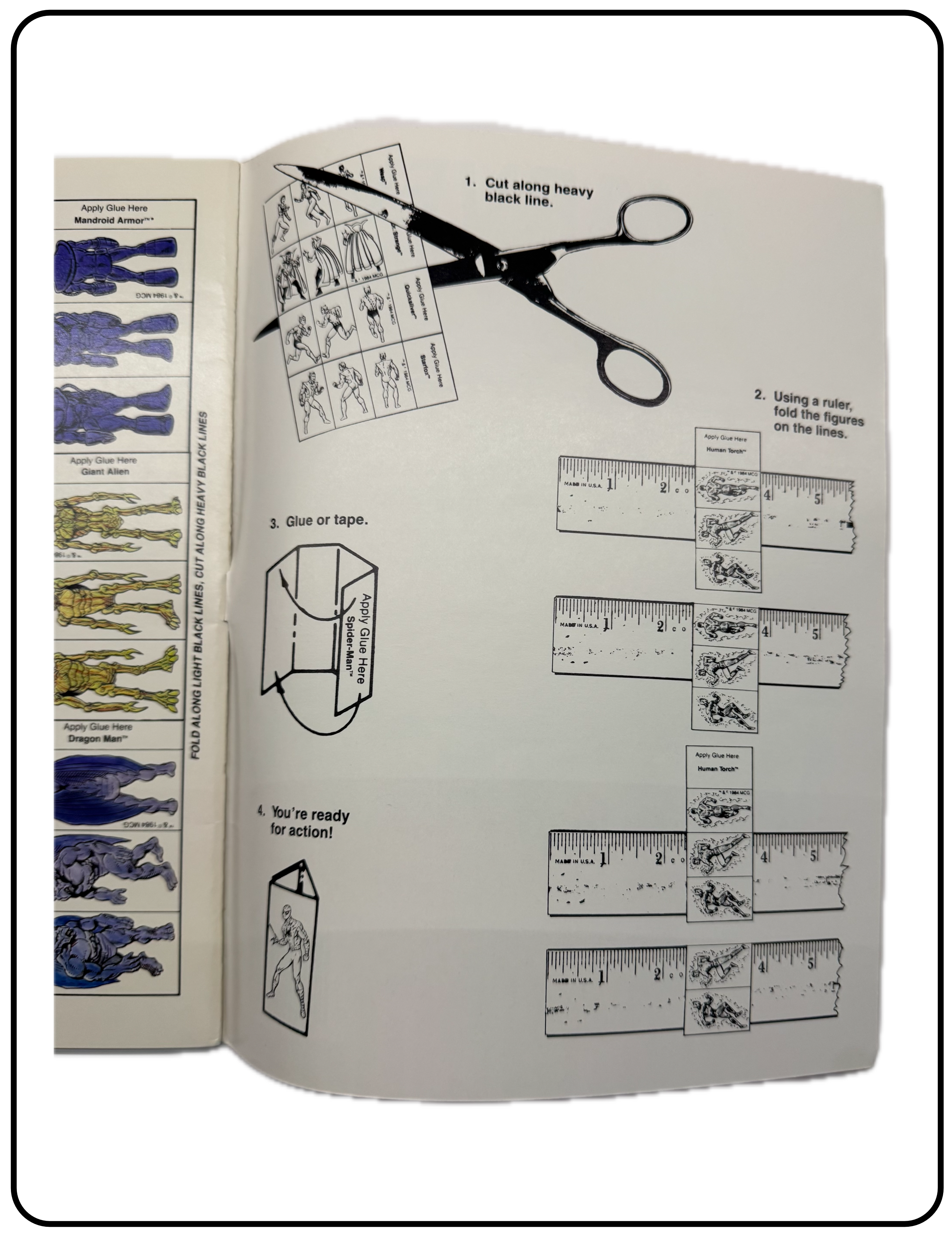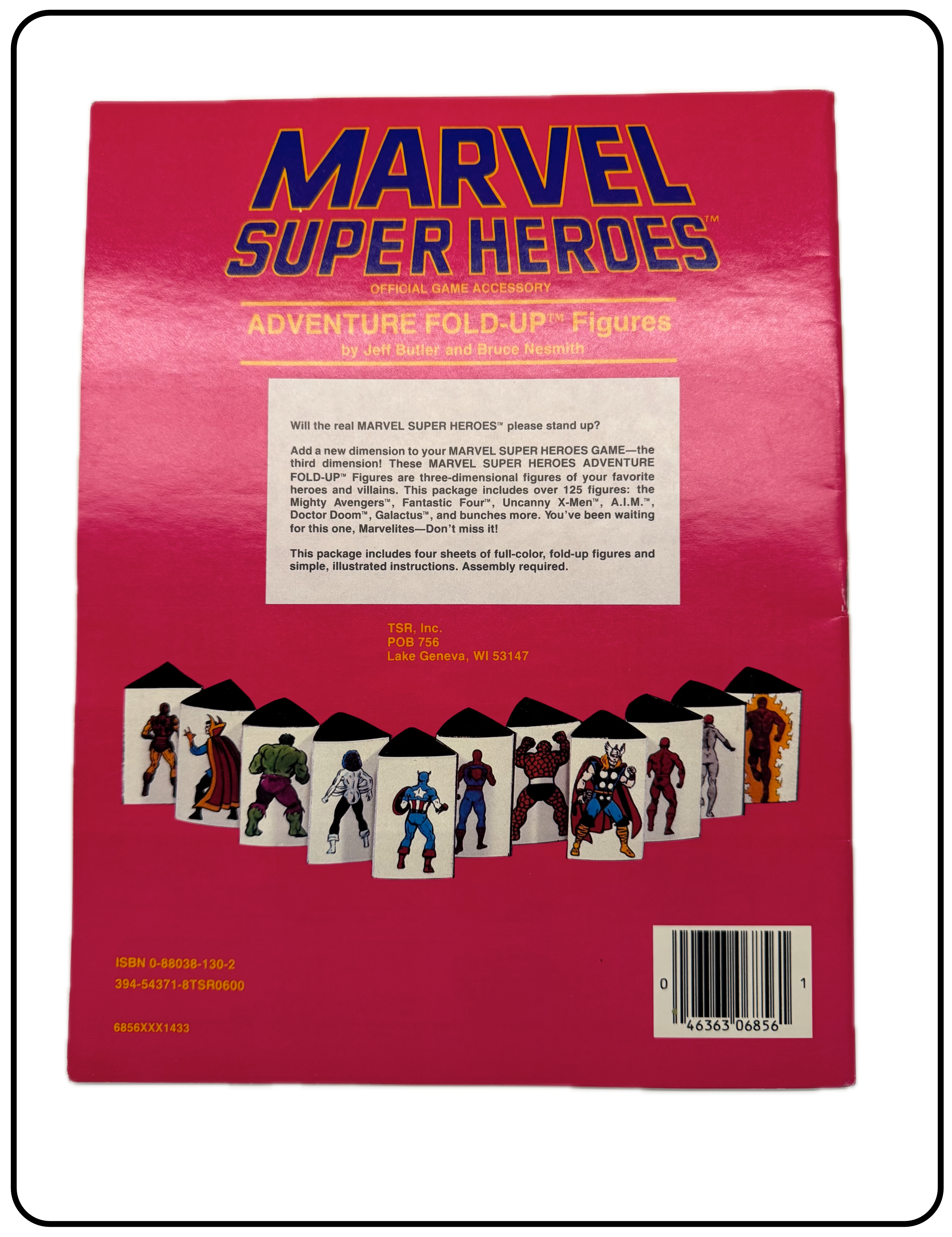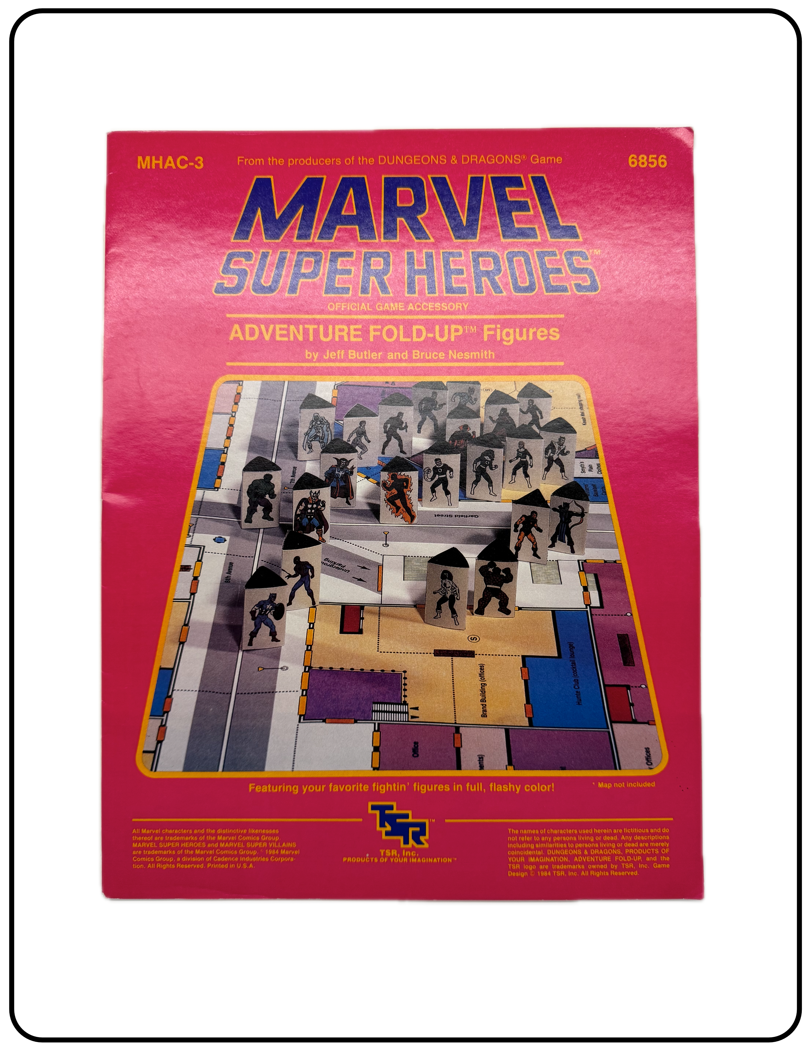 Name: Marvel Super Heroes Adventure Fold-up Figures Company: TSR, Inc. Type: Accessory / Figures Year: 1984 Catalog Number: 07:03:00:0006:C21 Main Category: Games Sub Category: Role-playing Games Secondary Category: None Details: This game accessory includes poster board thickness pages of Marvel characters that can be cut out and folded to create a stand-up figure to use on game maps. Eight pages of figures is included.