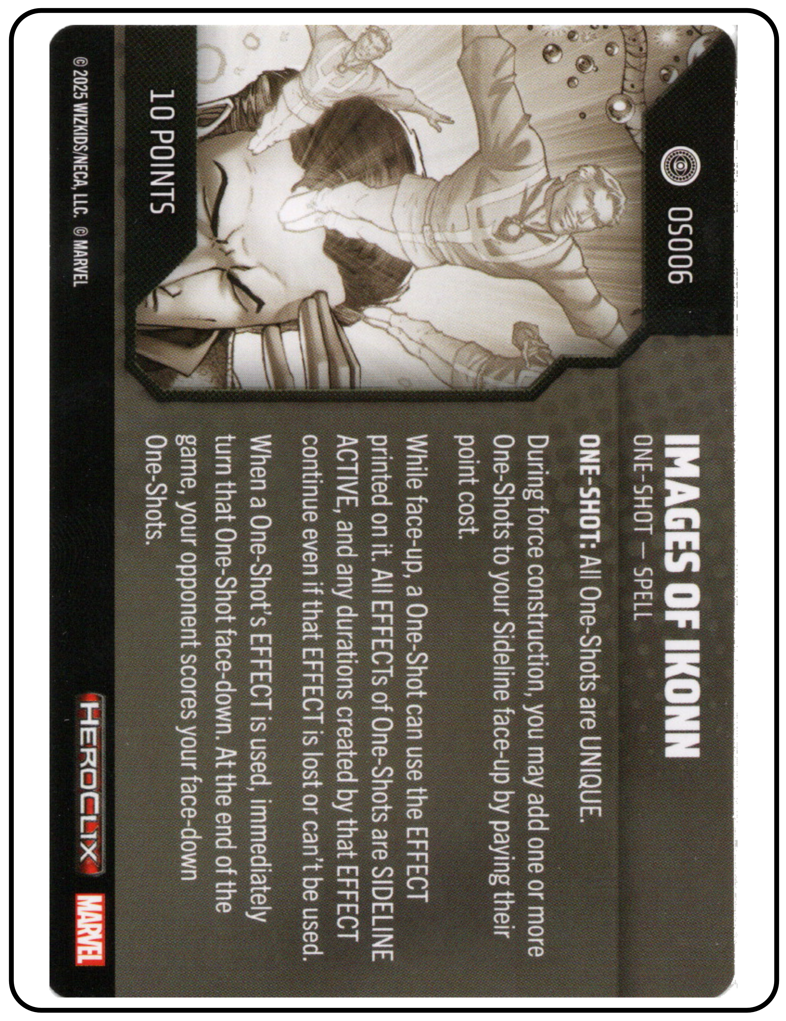 Name: Images of Ikonn Number: None Rarity: Unique Set Name: Strange Tales Type: Power & Abilities Card Year: 2025 Catalog Number: 07:02:00:0012:K10 Main Category: Games Sub Category: HeroClix Secondary Category: None Details: This spell card outlines the effects and use of Images of Ikonn, which is a unique one-shot spell. During force construction, you can add one or more on-shots to your sideline.