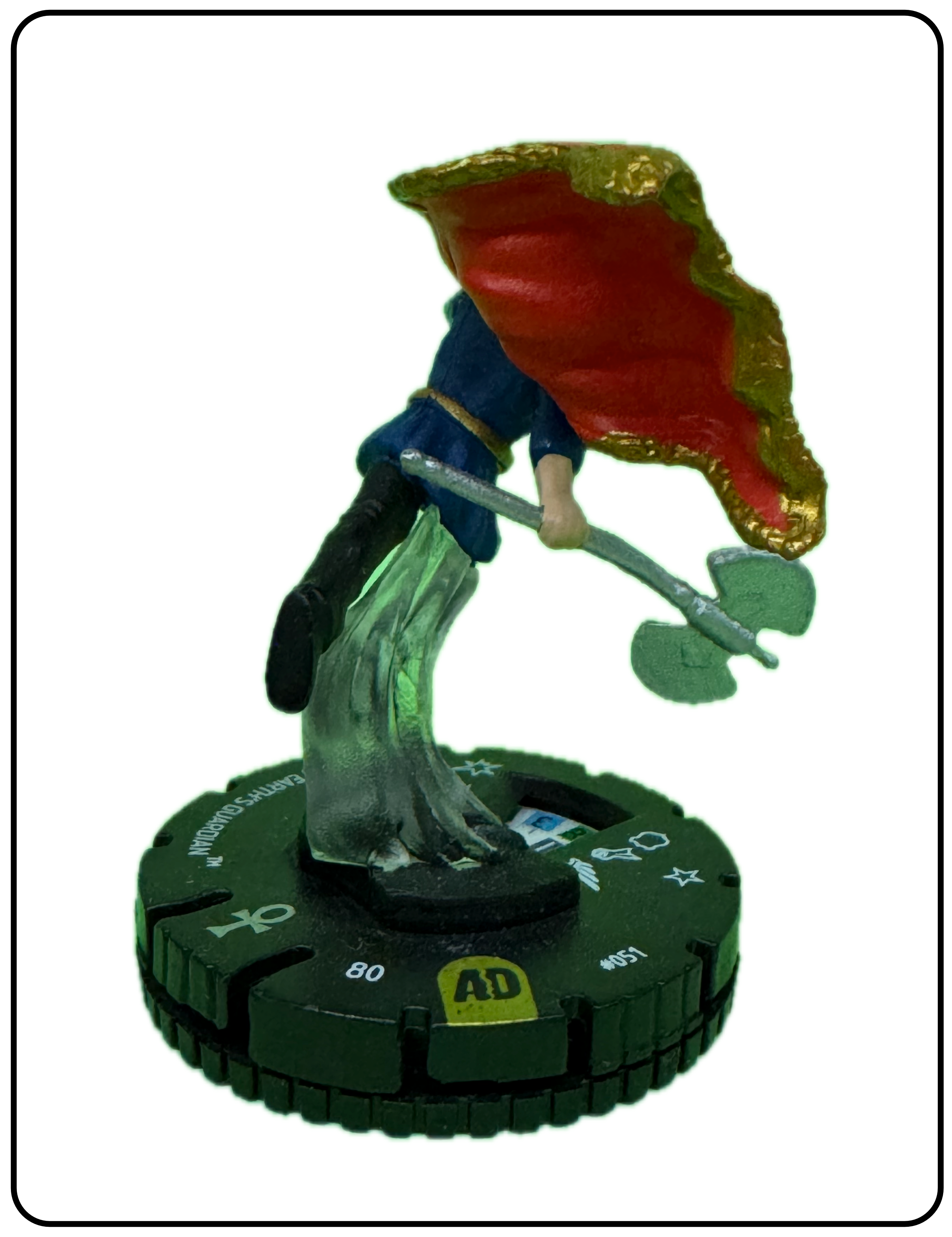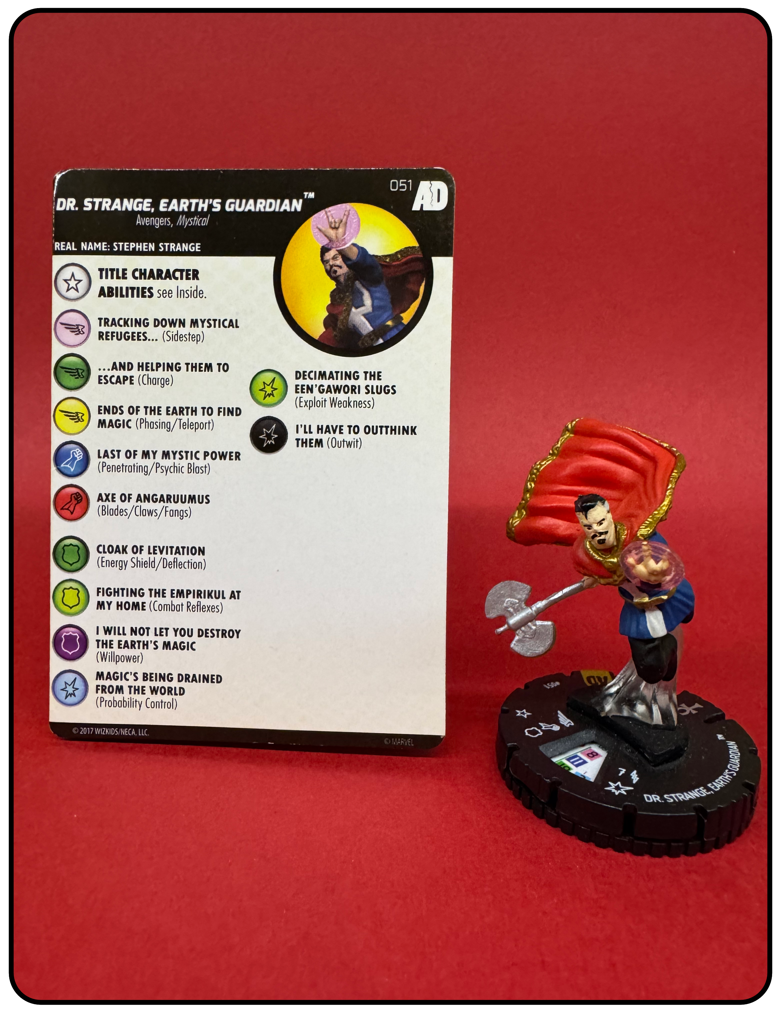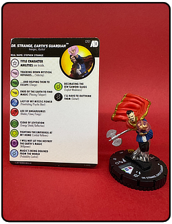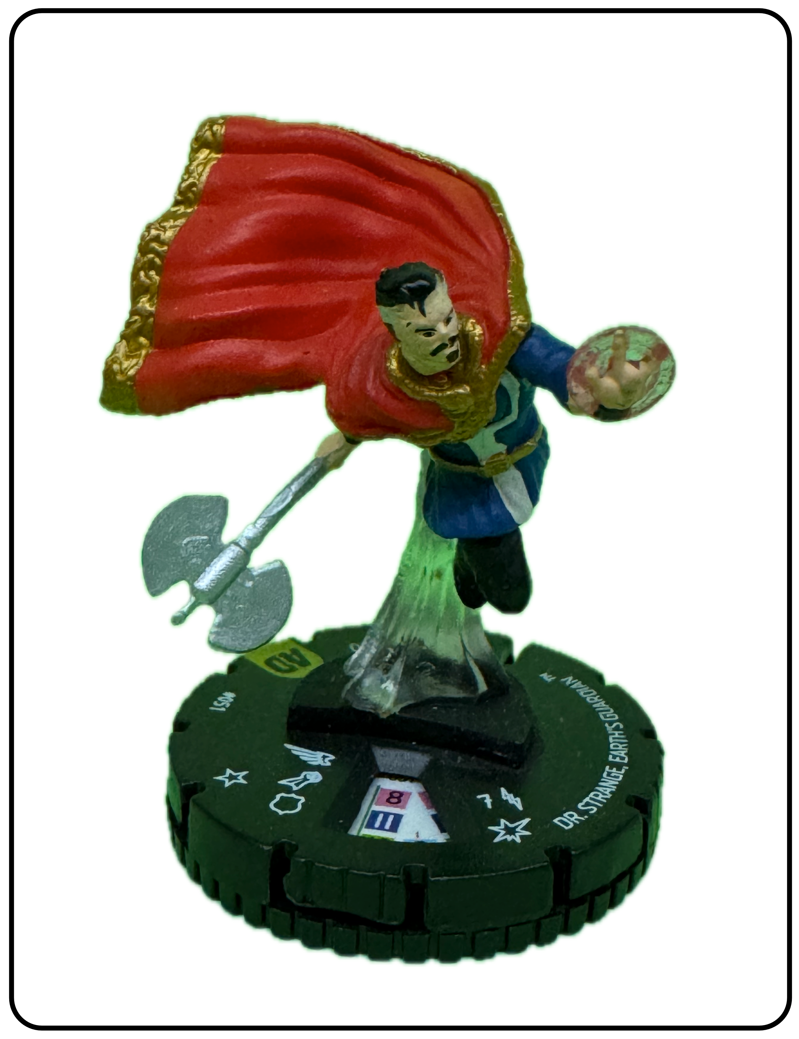 Name: Dr. Strange, Earth's Guardian Number: 051 Rarity: Super Rare Set Name: Avengers/Defenders War Type: Figure & Character Card Year: 2017 Catalog Number: 07:02:00:0022:K10 Main Category: Games Sub Category: HeroClix Secondary Category: None Details: This is a very dynamic figure featuring Dr. Strange jumping into the air holding an ax in his right hand and casting a spell with his left. He is attached to the clix base with a clear plastic column. This figure comes with a fold out character card with four pages.