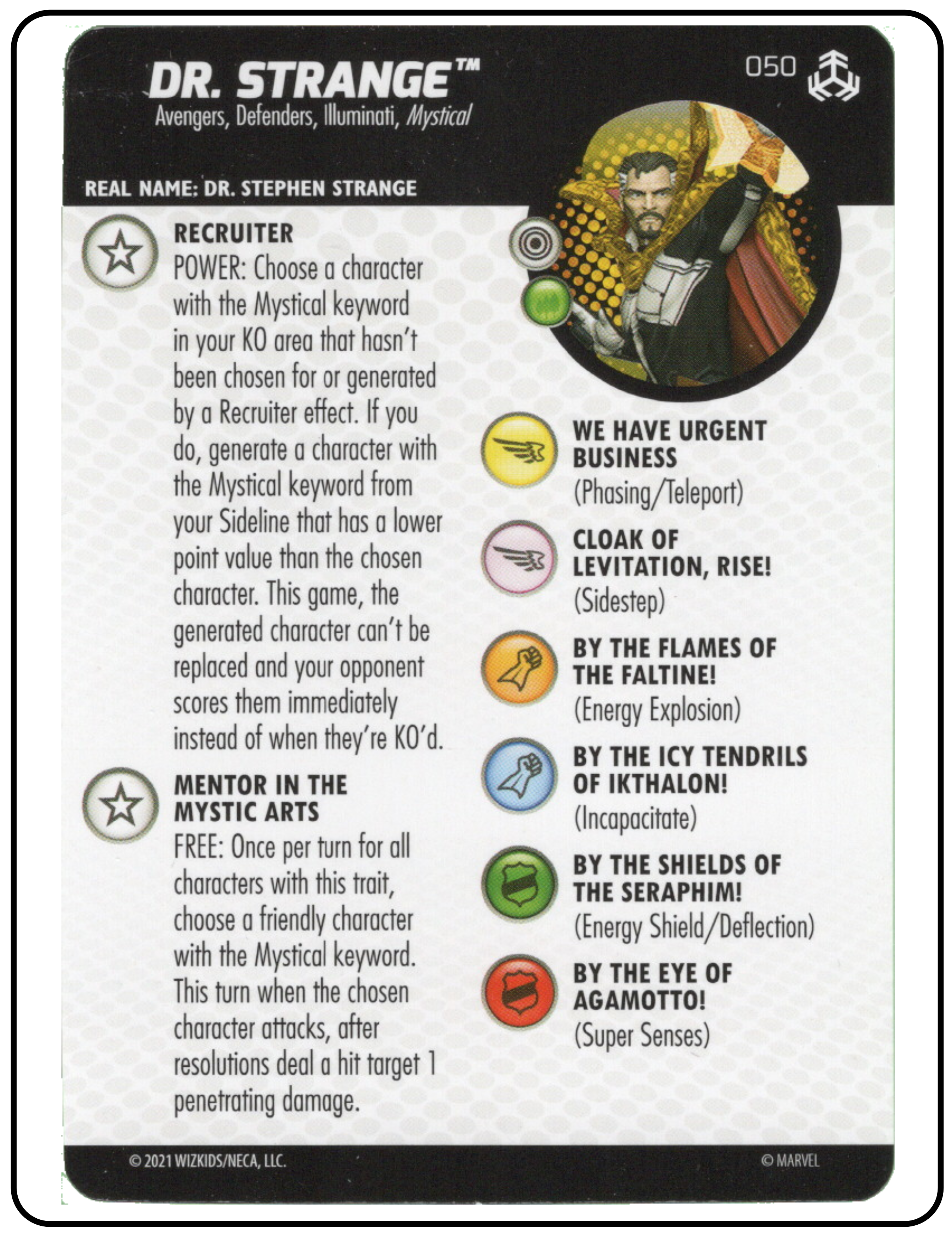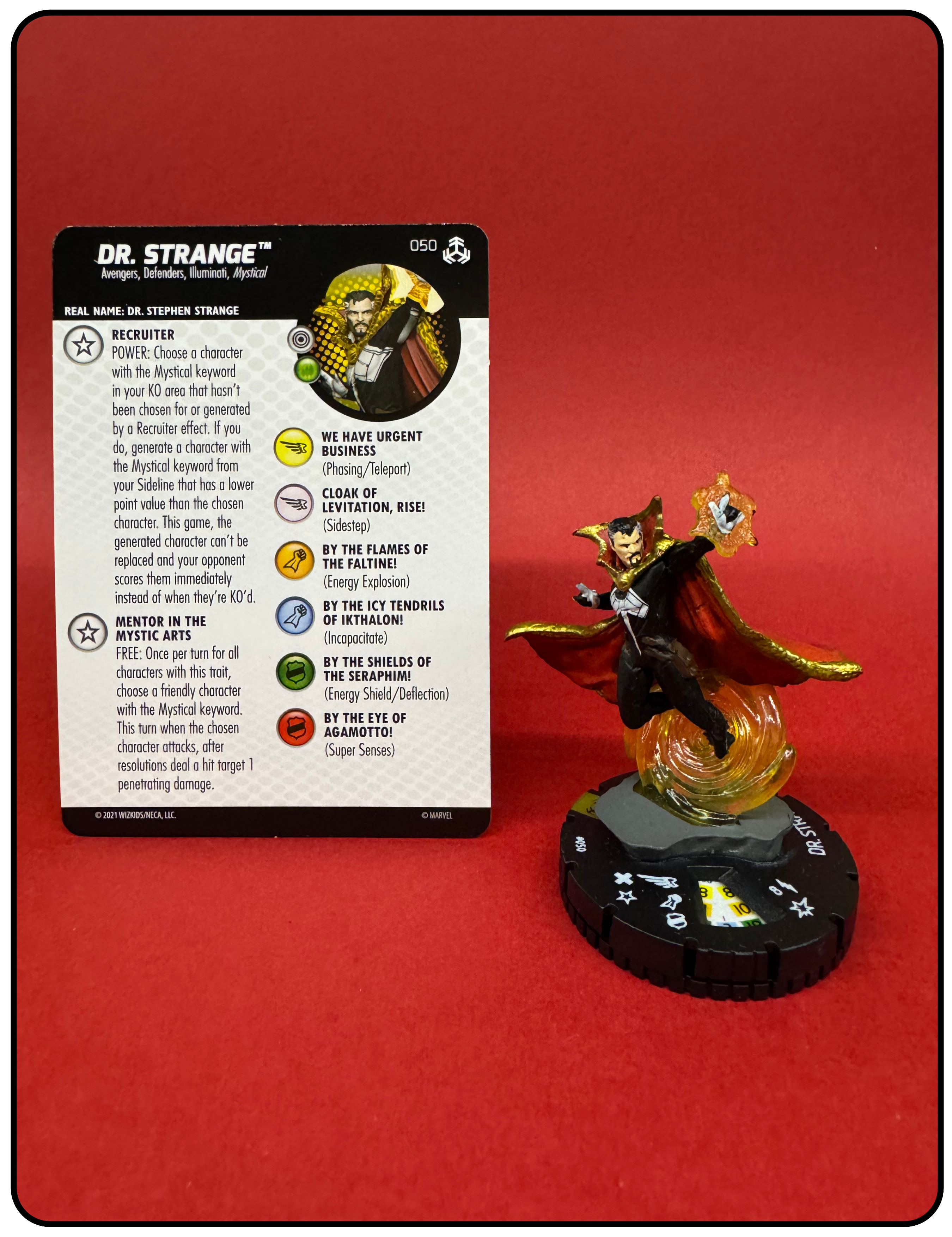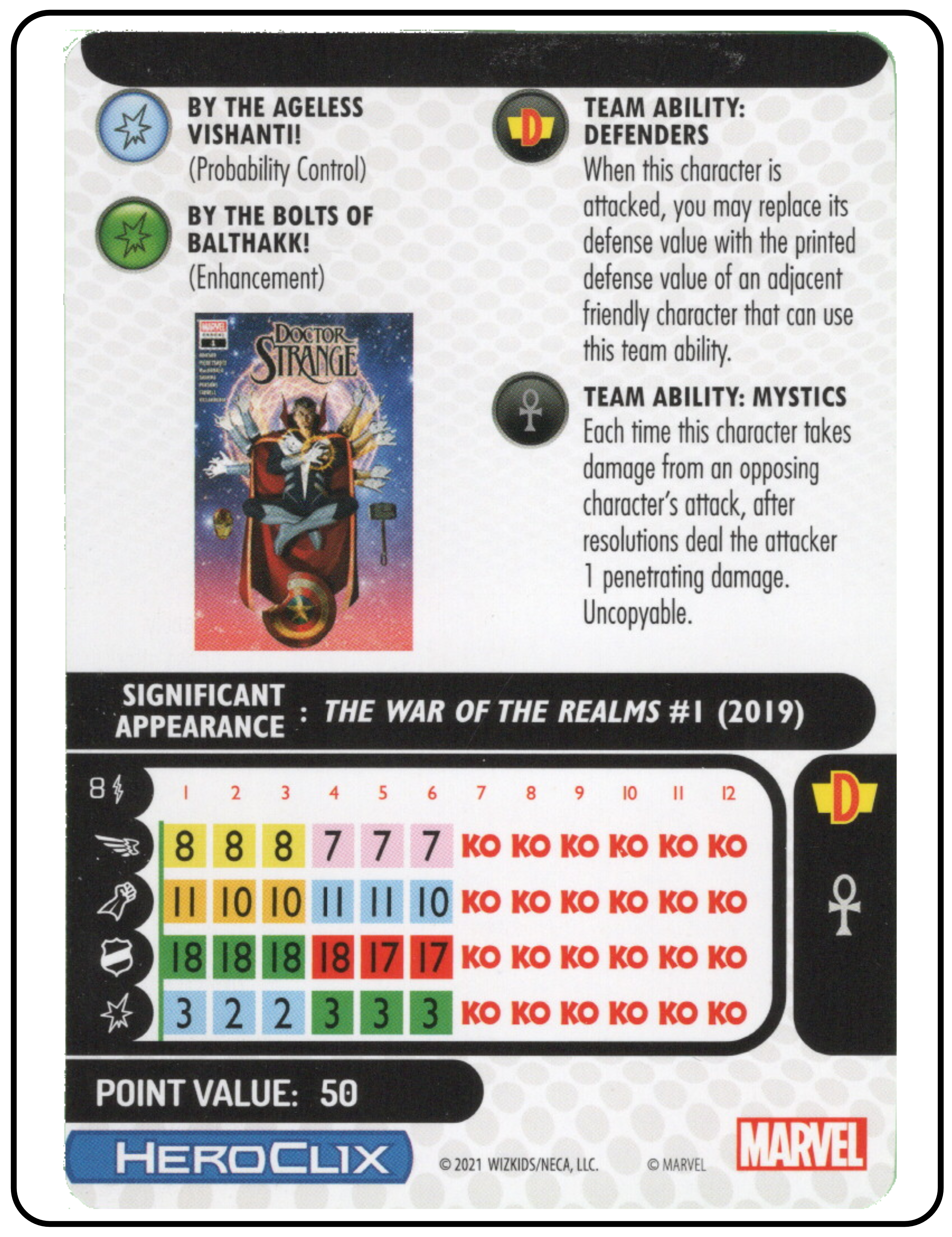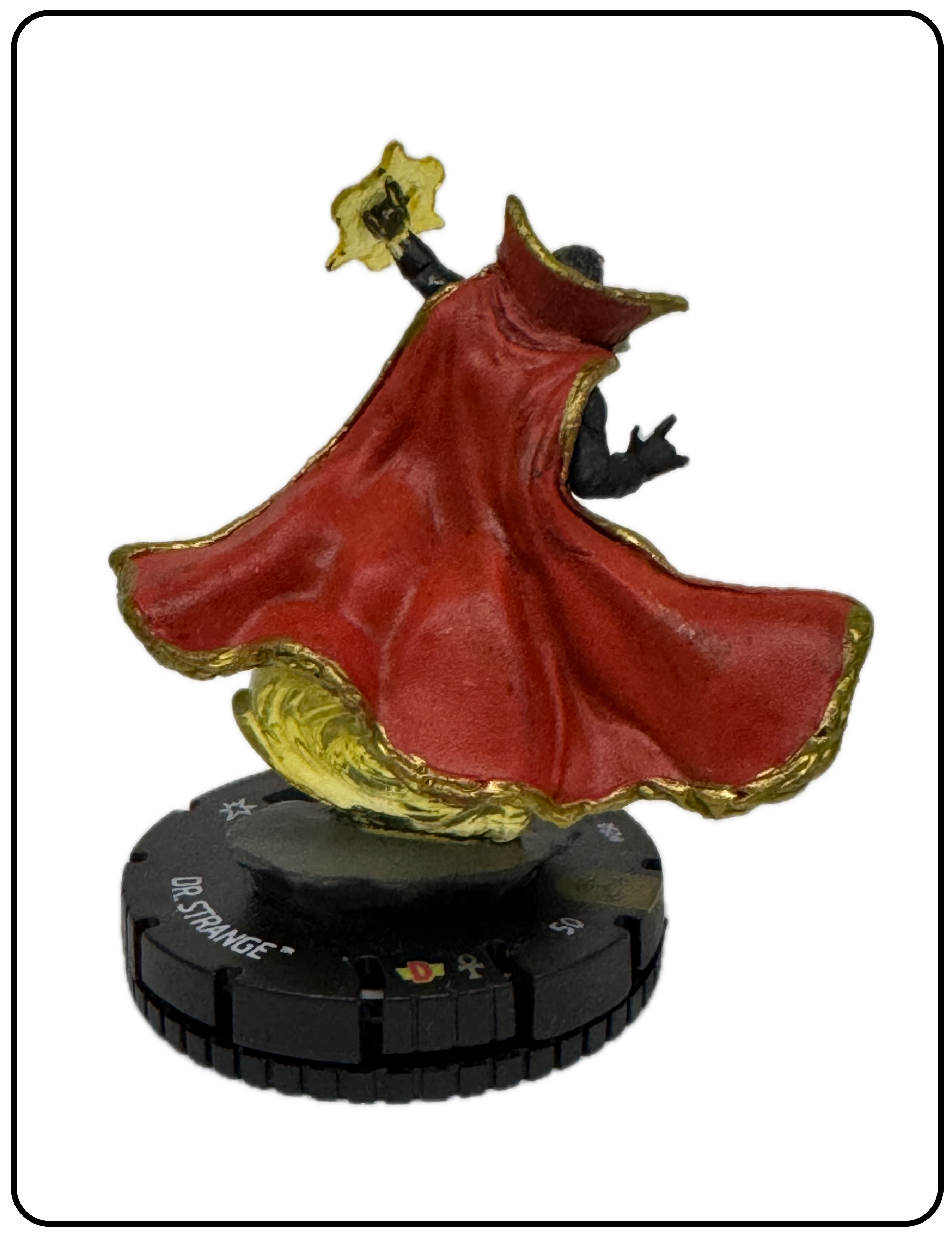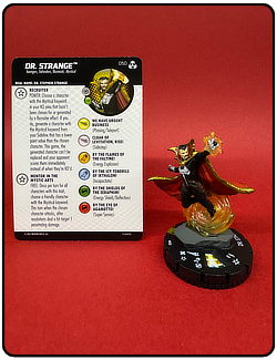 Name: Dr. Strange Number: 050 Rarity: Super Rare Set Name: Avengers: War of the Realms Type: Figure & Character Card Year: 2021 Catalog Number: 07:02:00:0023:K10 Main Category: Games Sub Category: HeroClix Secondary Category: None Details: This figure has great action depicting Dr. Strange suspended in the air by a clear yellow plastic portal/spell on a raised grey base. He is dressed in his black comic costume with white chest emblem. His left hand is casting a spell.
