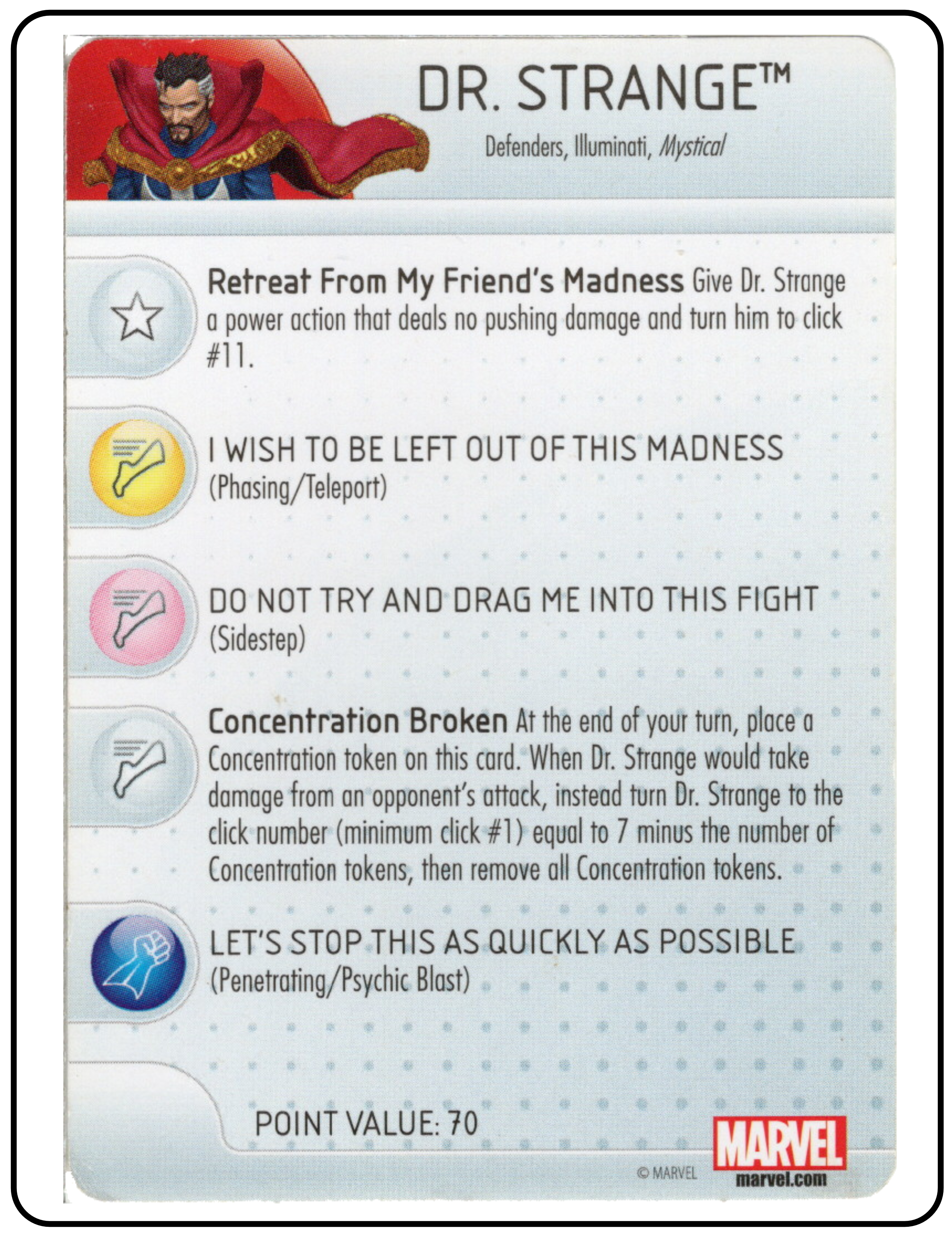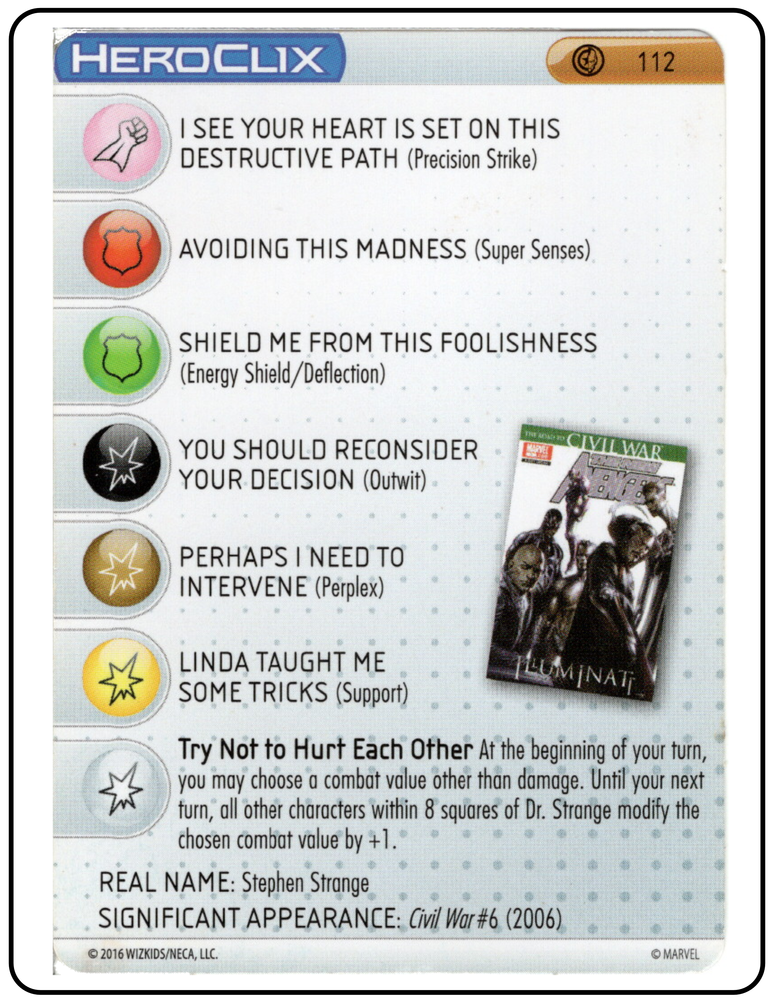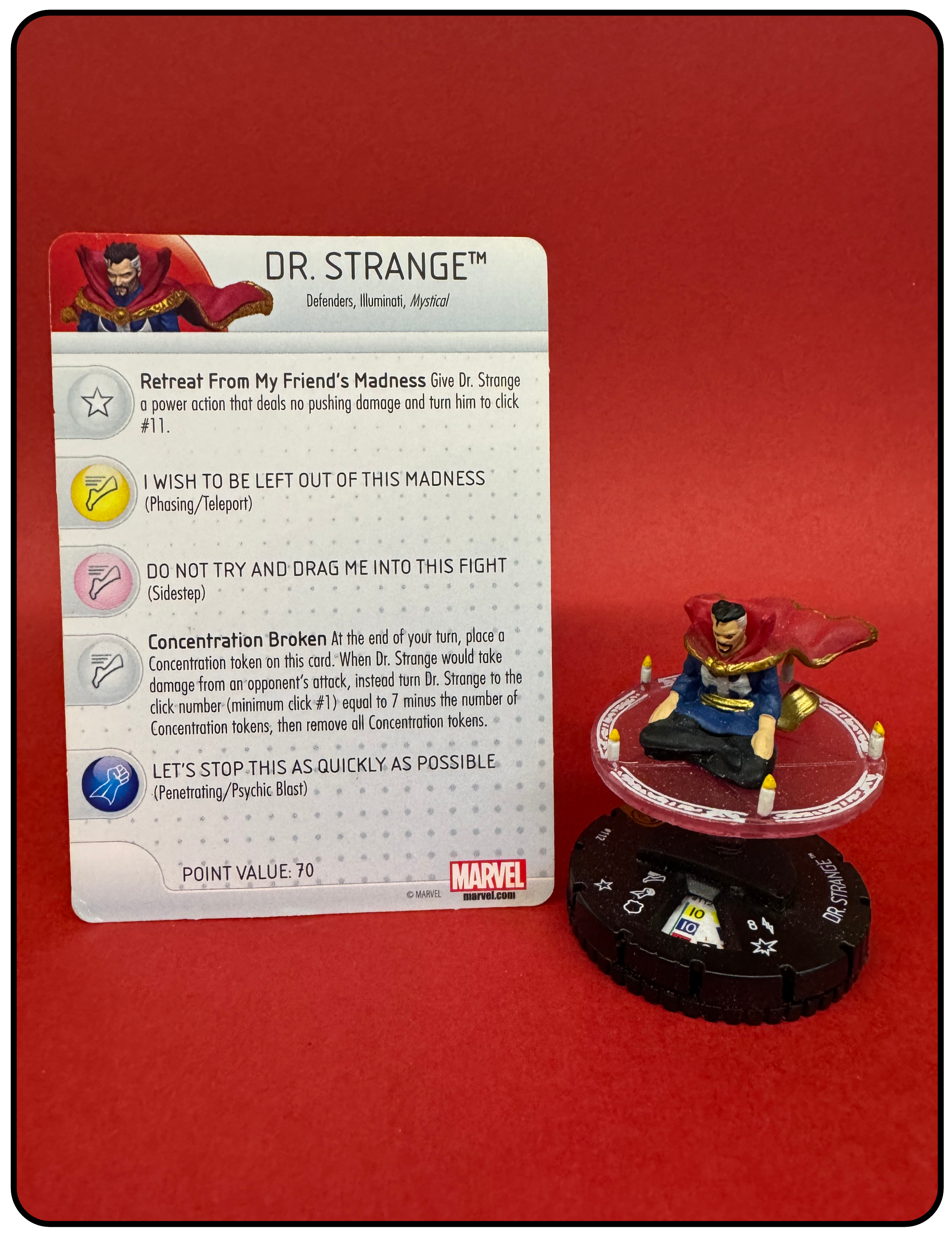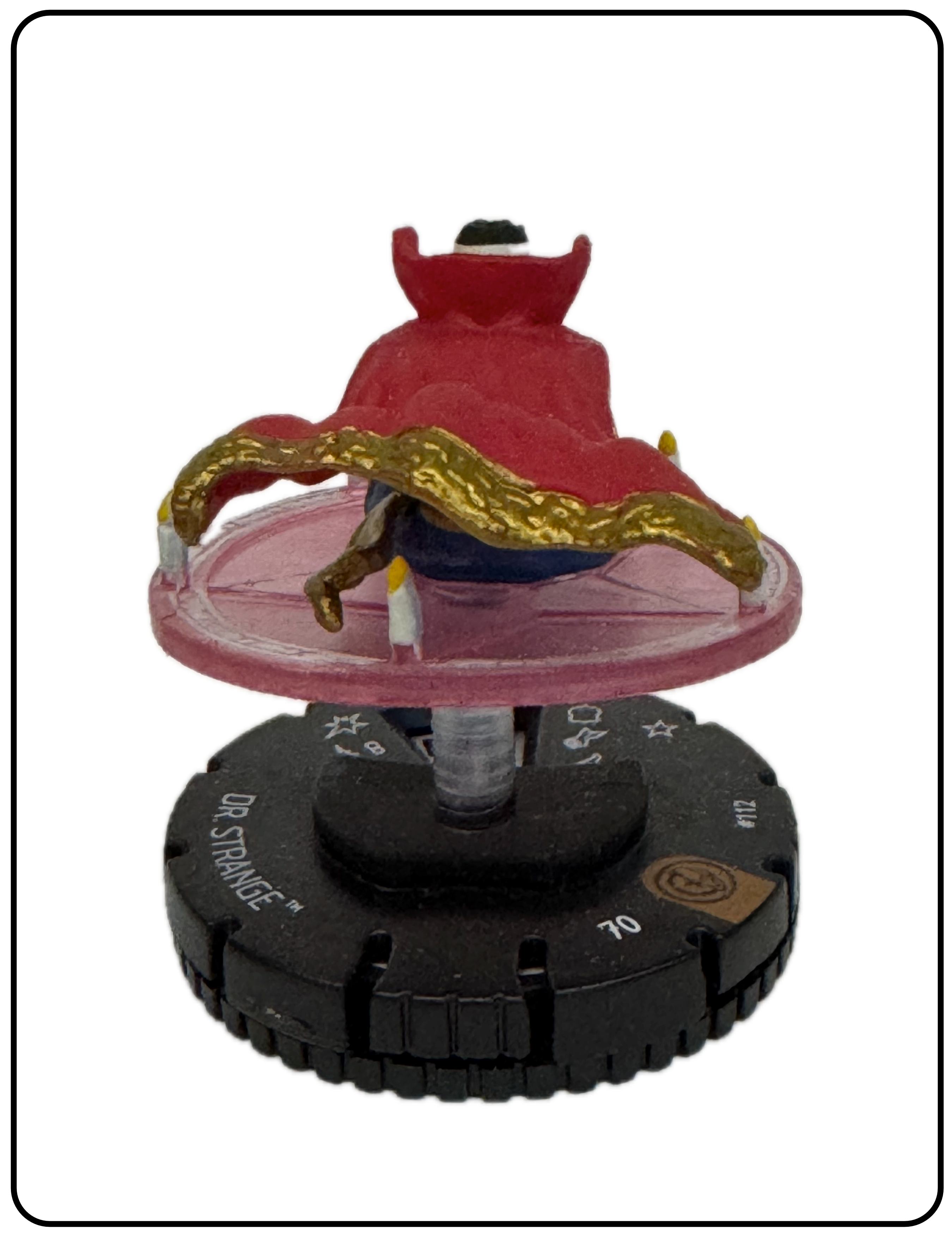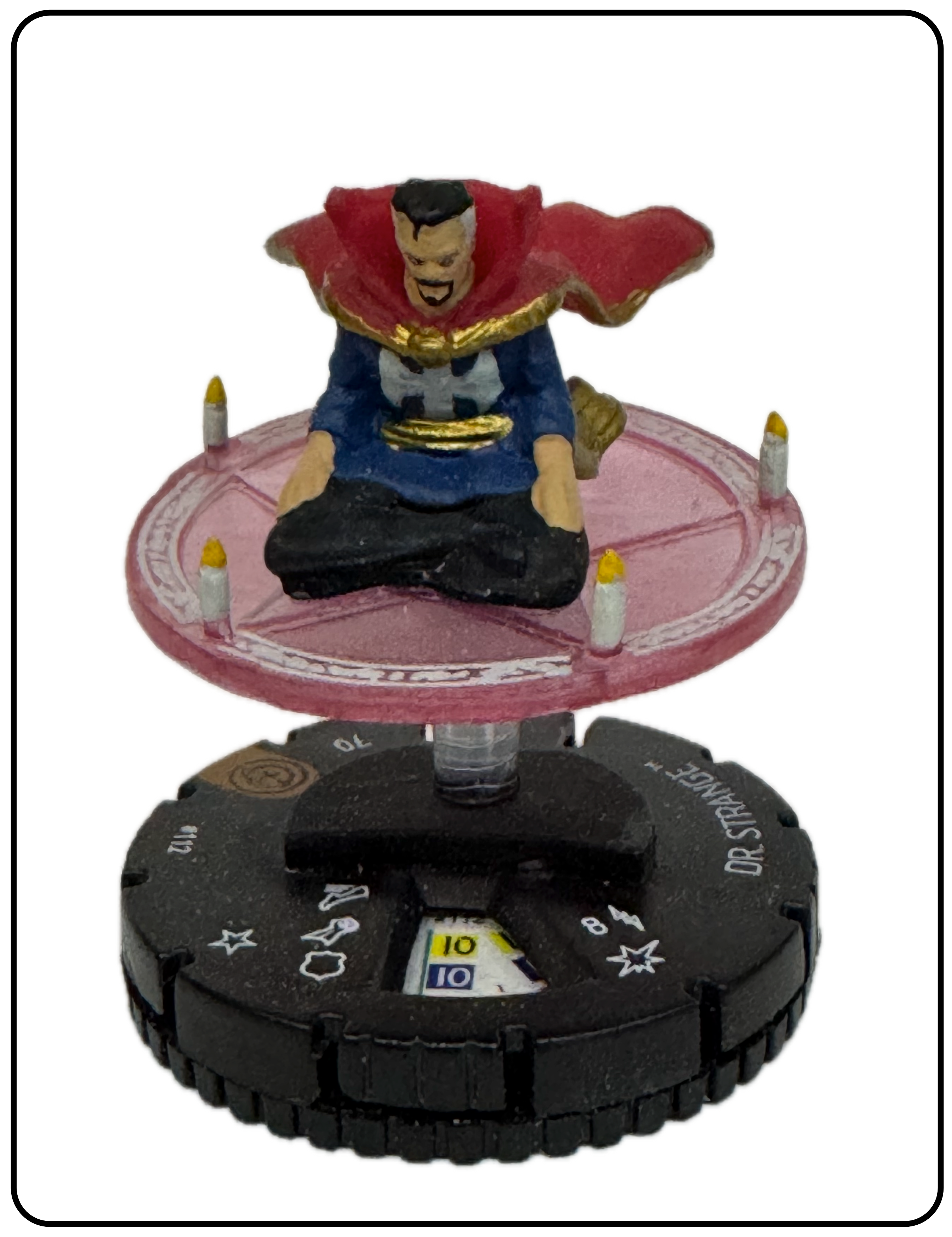 Name: Dr. Strange Number: 112 Rarity: Limited Edition Set Name: Civil War: Storyline Organized Type: Figure & Character Card Year: 2016 Catalog Number: 07:02:00:0025:K10 Main Category: Games Sub Category: HeroClix Secondary Category: None Details: This figure has recreates a great panel from a comic with Dr. Strange seated in the lotus position in a magic circle surrounded by candles. The magic circle is suspended from the base with a clear plastic peg.