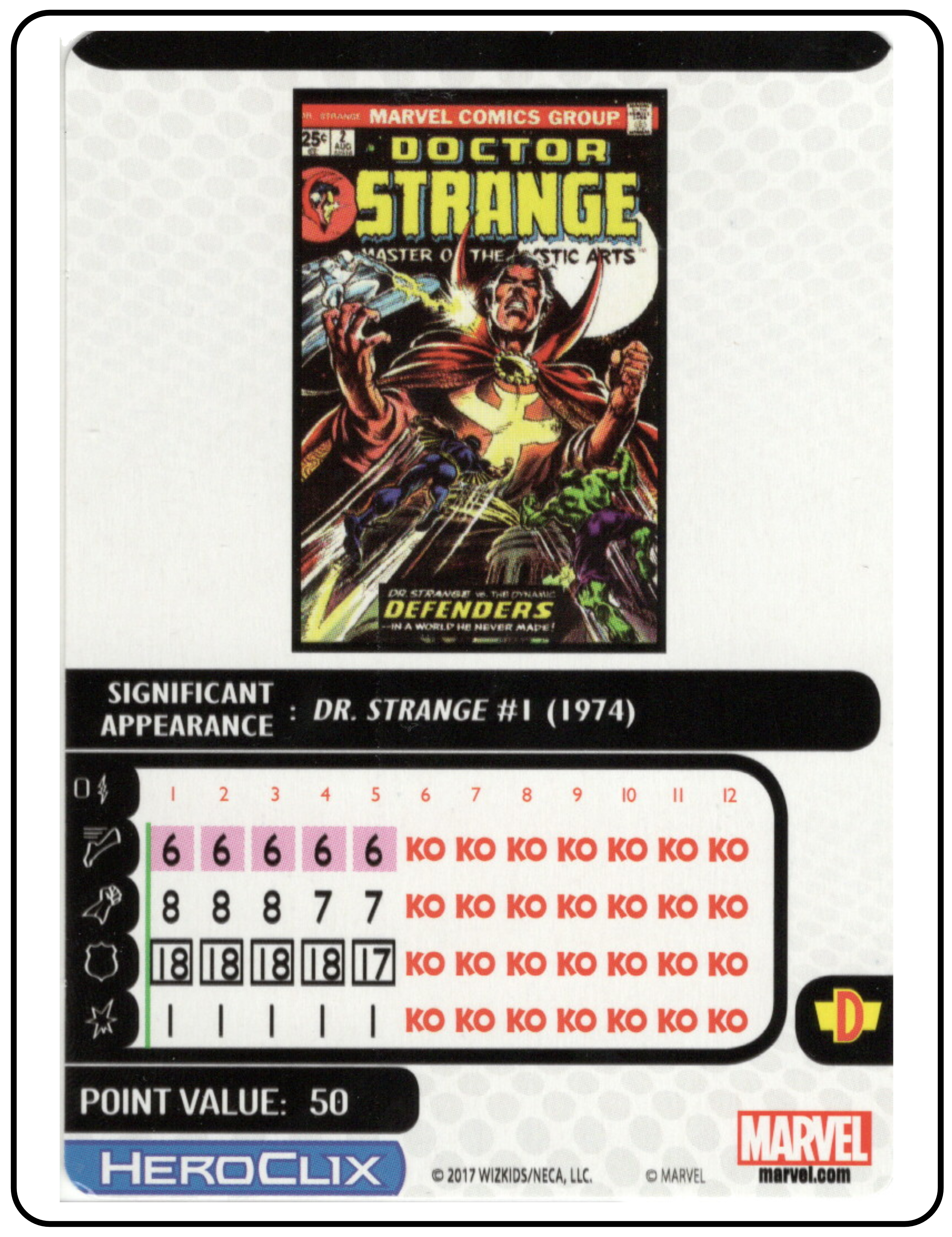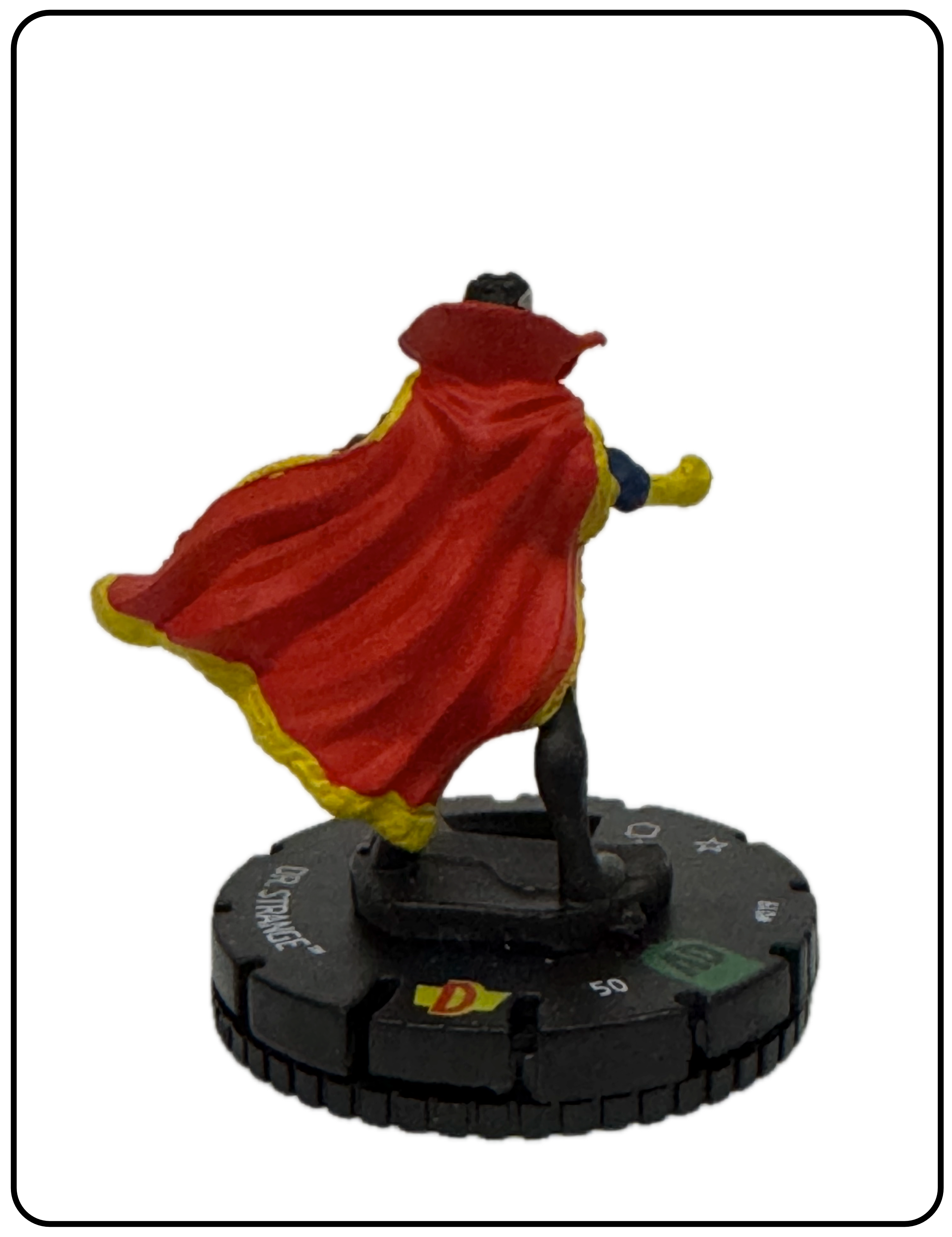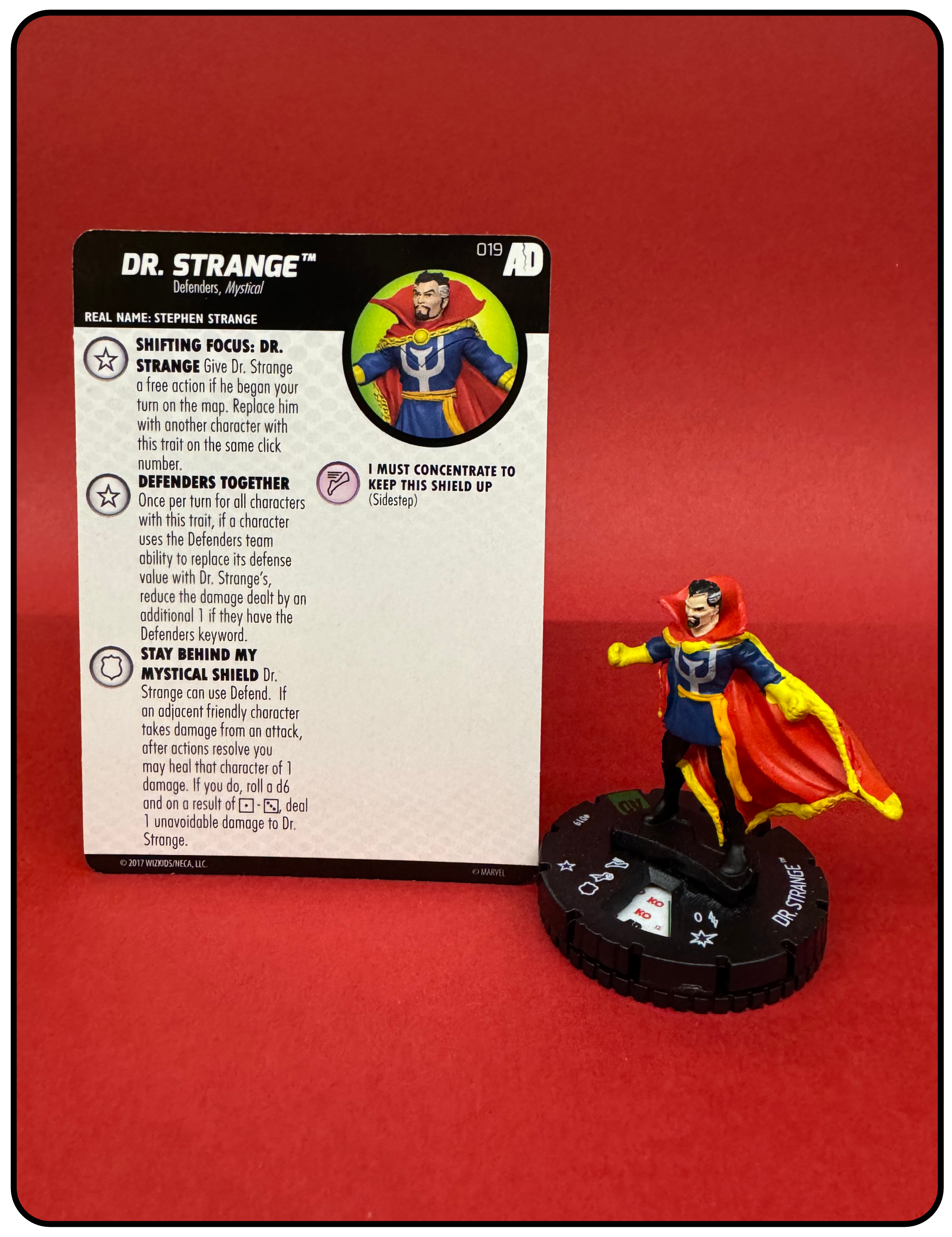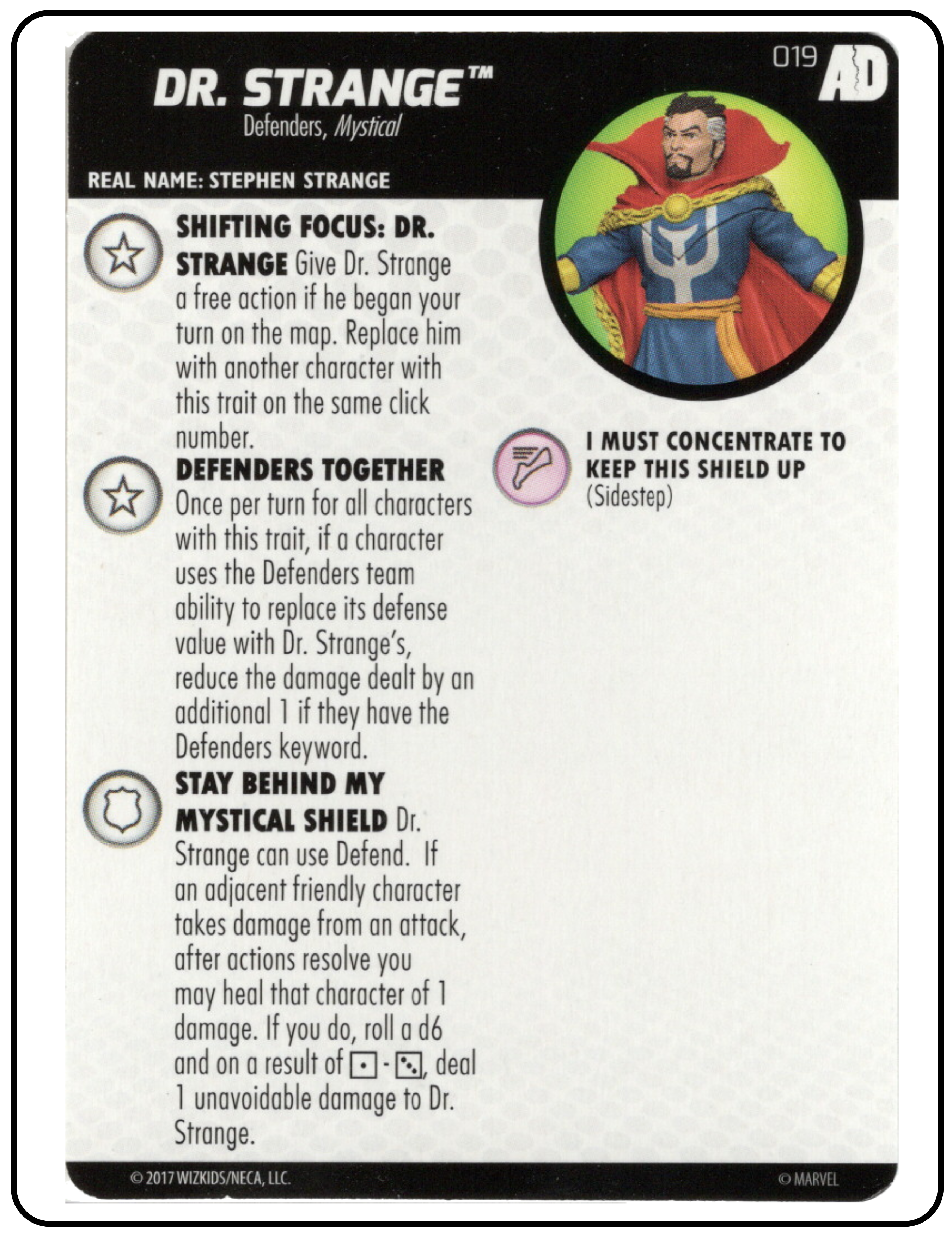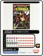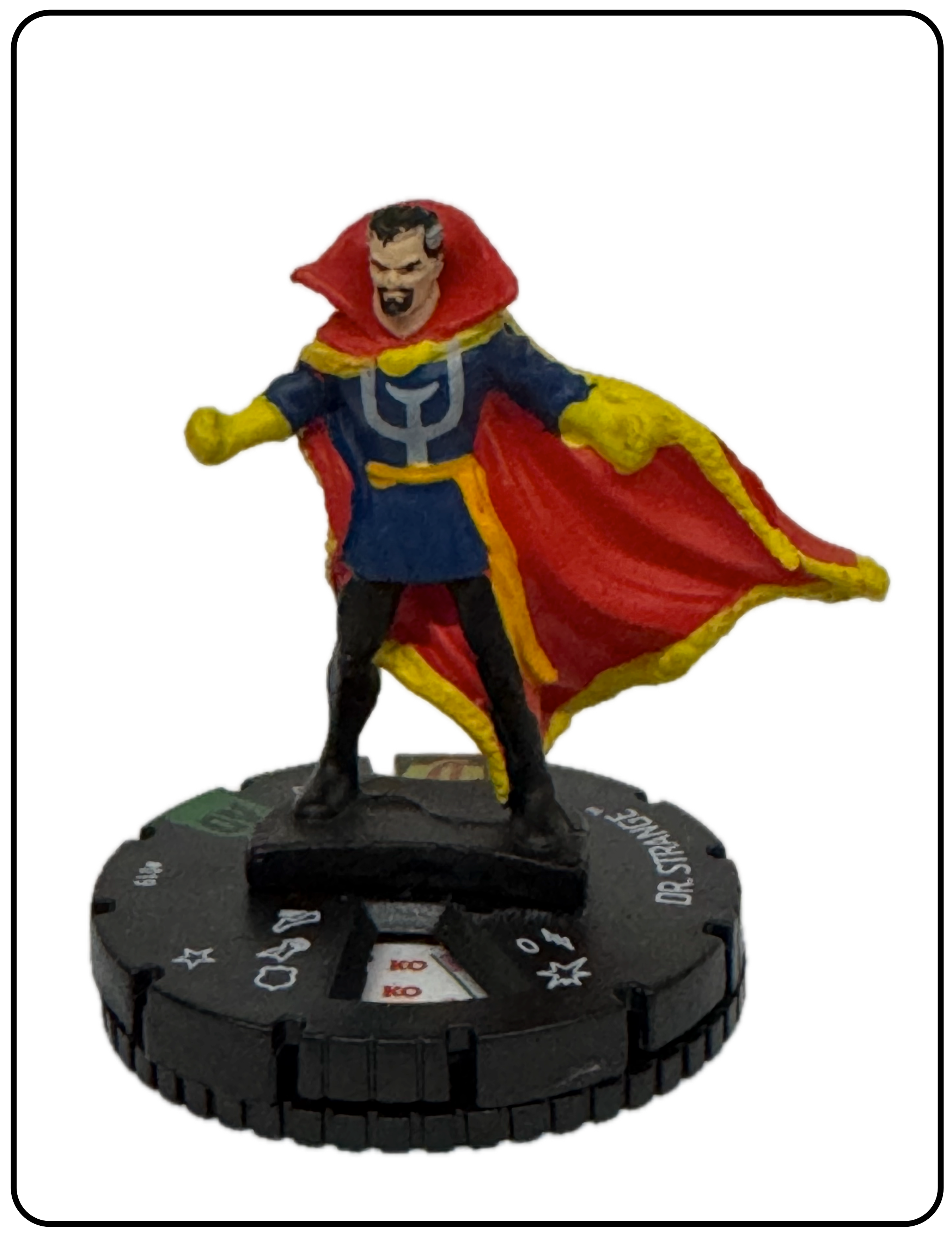 Name: Dr. Strange Number: 019 Rarity: Uncommon Set Name: Avengers/Defenders War Type: Figure & Character Card Year: 2017 Catalog Number: 07:02:00:0039:K10 Main Category: Games Sub Category: HeroClix Secondary Category: None Details: This figure depicts Dr. Strange dressed in his classic comic costume standing with both fists clenched.