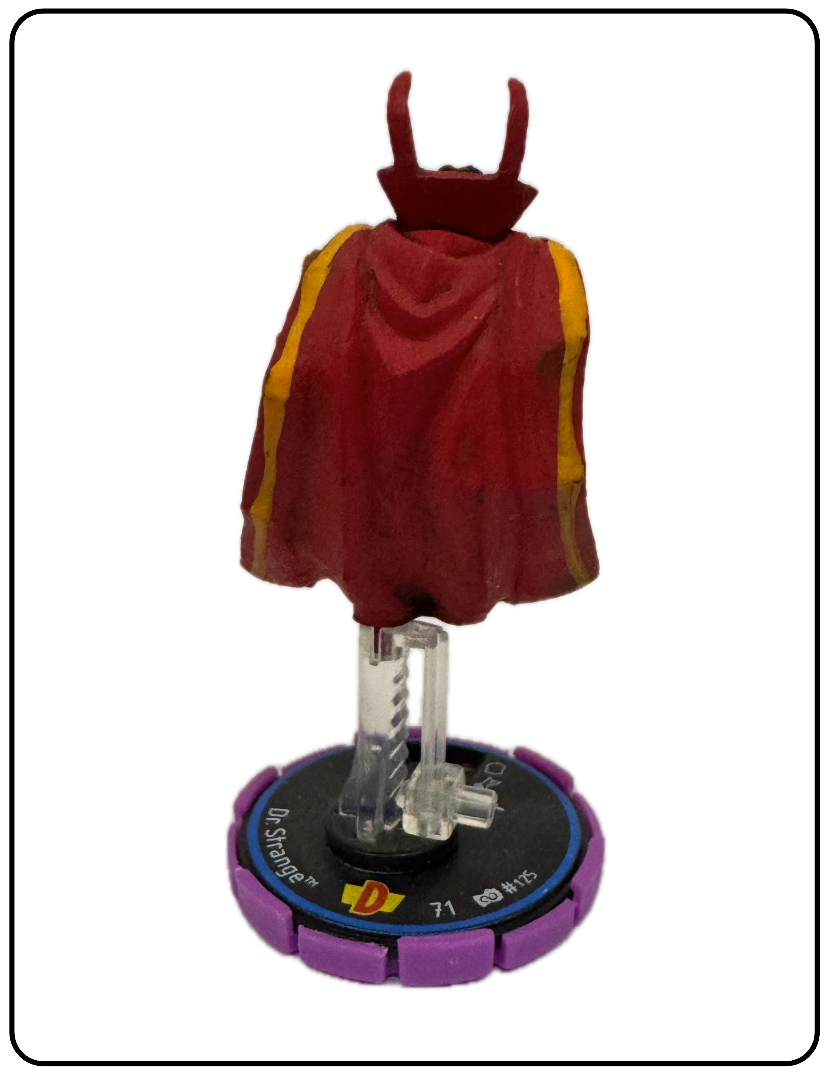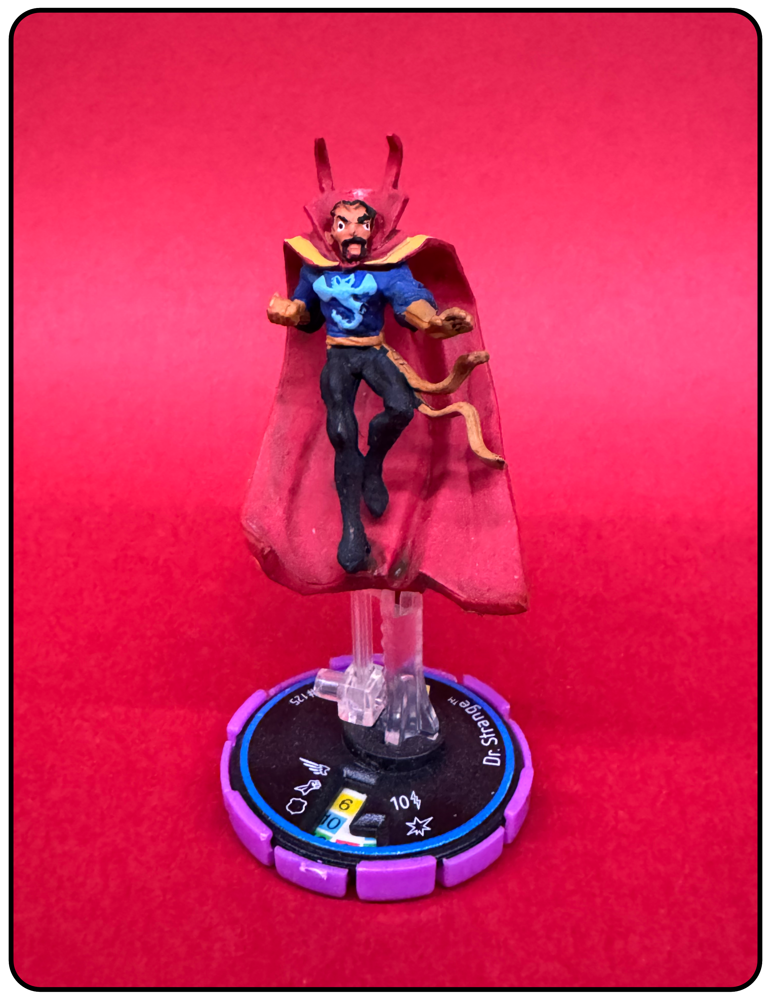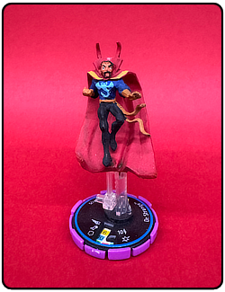 Name: Dr. Strange Number: 125 Rarity: Experienced Set Name: Infinity Challenge Type: Figure Year: 2002 Catalog Number: 07:02:00:0041:K10 Main Category: Games Sub Category: HeroClix Secondary Category: None Details: This figure along with figure 124 and 126 were the first Dr. Strange HeroClix figures. All three are the same sculpt and paint which depicts Dr. Strange levitating in the air on a clear plastic peg dressed in his classic comic costume. The sculpt and paint are horrible compared to what they would eventually evolve into. This figure has a blue ring (Experienced) around the top of the Clix base which is black with a purple casing. This was before figures came with cards.