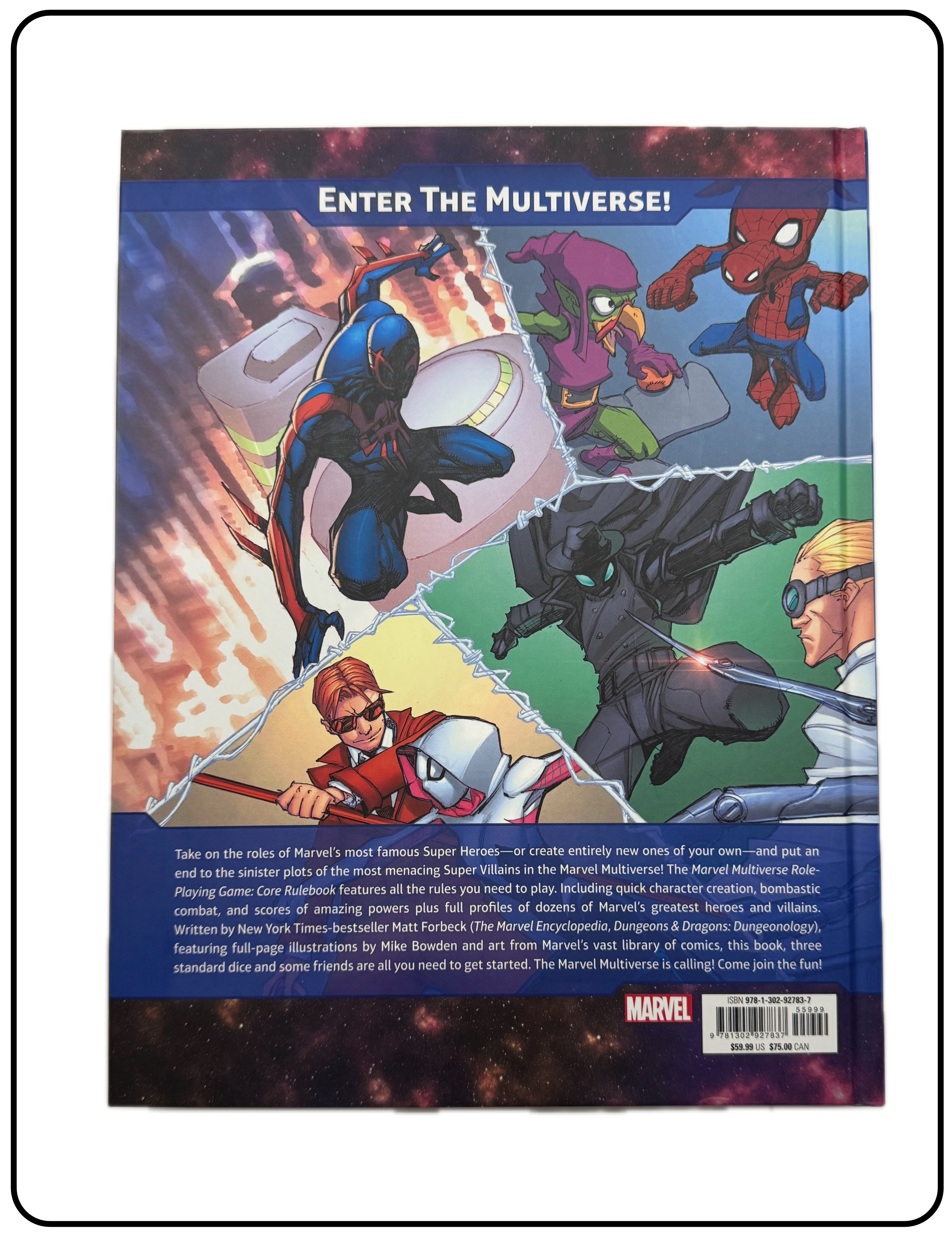Name: Marvel Multiverse Role-playing Game Core Rulebook Company: Marvel Worldwide, Inc. Type: Rule Book Year: 2023 Catalog Number: 07:03:12:0003:C21 Main Category: Games Sub Category: Role-playing Games Secondary Category: Books Details: This is the 320 page core rulebook by Matt Forebeck for the Marvel Multiverse Role-playing game introduced in 2023. Dr. Strange appears on numerous pages throughout the book. His character sheet is on page 162 and has a rank of 6 (cosmic).